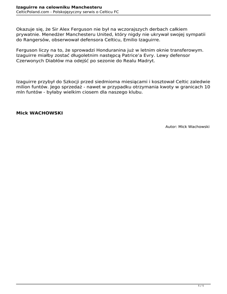 Izaguirre na celowniku Manchesteru CelticPoland.com - Polskojęzyczny serwis o Celticu FC Okazuje się, że Sir Alex Ferguson nie był na wczorajszych derbach całkiem prywatnie. Menedżer Manchesteru United, który nigdy nie ukrywał swojej sympatii do Rangersów, obserwował defensora Celticu, Emilio Izaguirre. Ferguson liczy na to, że sprowadzi Honduranina już w letnim oknie transferowym. Izaguirre miałby zostać długoletnim następcą Patrice’a Evry. Lewy defensor Czerwonych Diabłów ma odejść po sezonie do Realu Madryt. Izaguirre przybył do Szkocji przed siedmioma miesiącami i kosztował Celtic zaledwie milion funtów. Jego sprzedaż - nawet w przypadku otrzymania kwoty w granicach 10 mln funtów - byłaby wielkim ciosem dla naszego klubu. Mick WACHOWSKI Autor: Mick Wachowski 1/1 Powered by TCPDF (www.tcpdf.org)