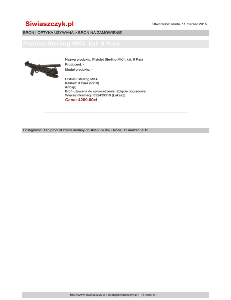 Siwiaszczyk.pl Utworzono: środa, 11 marzec 2015 BROŃ I OPTYKA UŻYWANA > BROŃ NA ZAMÓWIENIE Pistolet Sterling MK4, kal: 9 Para Nazwa produktu: Pistolet Sterling MK4, kal: 9 Para Producent: Model produktu: Pistolet Sterling MK4 Kaliber: 9 Para (9x19) Broń używana do sprowadzenia. Zdjęcie poglądowe. Więcej informacji: 692439518 (Łukasz) Cena: 4200.00zł Dostępność: Ten produkt został dodany do sklepu w dniu środa, 11 marzec 2015 http://www.siwiaszczyk.pl | [email protected] | | Strona 1/1