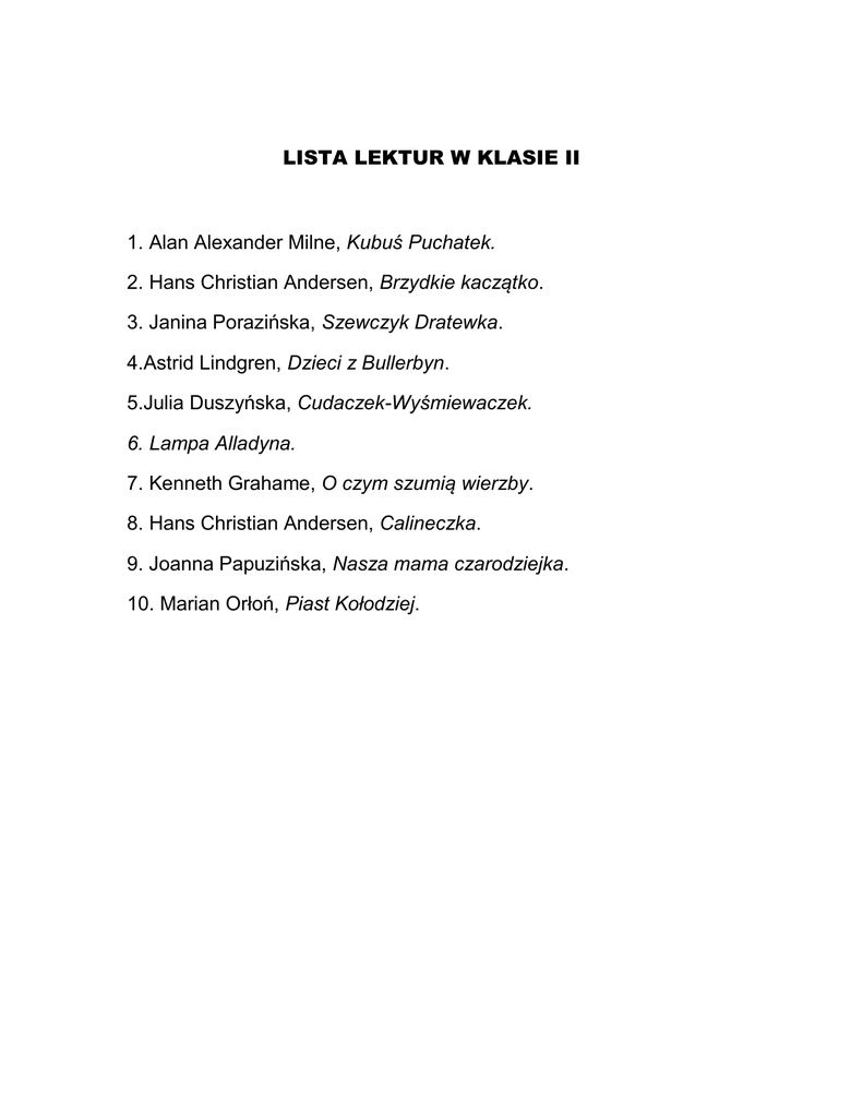LISTA LEKTUR W KLASIE II 1. Alan Alexander Milne, Kubuś Puchatek. 2. Hans Christian Andersen, Brzydkie kaczątko. 3. Janina Porazińska, Szewczyk Dratewka. 4.Astrid Lindgren, Dzieci z Bullerbyn. 5.Julia Duszyńska, Cudaczek-Wyśmiewaczek. 6. Lampa Alladyna. 7. Kenneth Grahame, O czym szumią wierzby. 8. Hans Christian Andersen, Calineczka. 9. Joanna Papuzińska, Nasza mama czarodziejka. 10. Marian Orłoń, Piast Kołodziej.