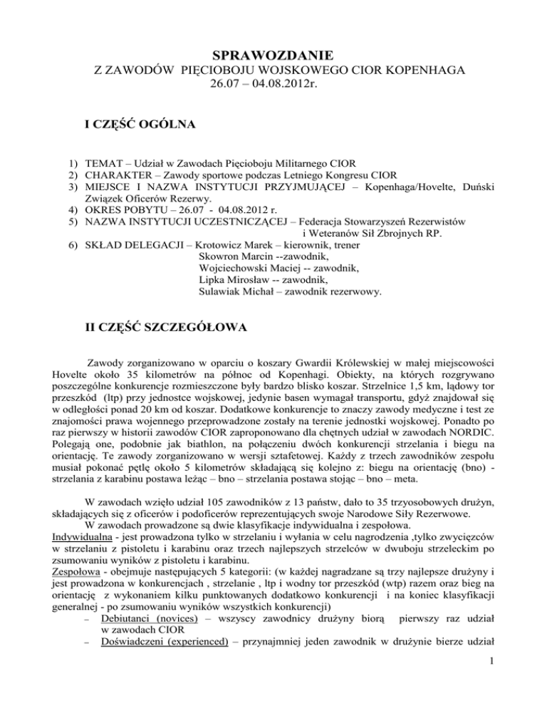 SPRAWOZDANIE Z ZAWODÓW PIĘCIOBOJU WOJSKOWEGO CIOR KOPENHAGA 26.07 – 04.08.2012r. I CZĘŚĆ OGÓLNA 1) TEMAT – Udział w Zawodach Pięcioboju Militarnego CIOR 2) CHARAKTER – Zawody sportowe podczas Letniego Kongresu CIOR 3) MIEJSCE I NAZWA INSTYTUCJI PRZYJMUJĄCEJ – Kopenhaga/Hovelte, Duński Związek Oficerów Rezerwy. 4) OKRES POBYTU – 26.07 - 04.08.2012 r. 5) NAZWA INSTYTUCJI UCZESTNICZĄCEJ – Federacja Stowarzyszeń Rezerwistów i Weteranów Sił Zbrojnych RP. 6) SKŁAD DELEGACJI – Krotowicz Marek – kierownik, trener Skowron Marcin --zawodnik, Wojciechowski Maciej -- zawodnik, Lipka Mirosław -- zawodnik, Sulawiak Michał – zawodnik rezerwowy. II CZĘŚĆ SZCZEGÓŁOWA Zawody zorganizowano w oparciu o koszary Gwardii Królewskiej w małej miejscowości Hovelte około 35 kilometrów na północ od Kopenhagi. Obiekty, na których rozgrywano poszczególne konkurencje rozmieszczone były bardzo blisko koszar. Strzelnice 1,5 km, lądowy tor przeszkód (ltp) przy jednostce wojskowej, jedynie basen wymagał transportu, gdyż znajdował się w odległości ponad 20 km od koszar. Dodatkowe konkurencje to znaczy zawody medyczne i test ze znajomości prawa wojennego przeprowadzone zostały na terenie jednostki wojskowej. Ponadto po raz pierwszy w historii zawodów CIOR zaproponowano dla chętnych udział w zawodach NORDIC. Polegają one, podobnie jak biathlon, na połączeniu dwóch konkurencji strzelania i biegu na orientację. Te zawody zorganizowano w wersji sztafetowej. Każdy z trzech zawodników zespołu musiał pokonać pętlę około 5 kilometrów składającą się kolejno z: biegu na orientację (bno) strzelania z karabinu postawa leżąc – bno – strzelania postawa stojąc – bno – meta. W zawodach wzięło udział 105 zawodników z 13 państw, dało to 35 trzyosobowych drużyn, składających się z oficerów i podoficerów reprezentujących swoje Narodowe Siły Rezerwowe. W zawodach prowadzone są dwie klasyfikacje indywidualna i zespołowa. Indywidualna - jest prowadzona tylko w strzelaniu i wyłania w celu nagrodzenia ,tylko zwycięzców w strzelaniu z pistoletu i karabinu oraz trzech najlepszych strzelców w dwuboju strzeleckim po zsumowaniu wyników z pistoletu i karabinu. Zespołowa - obejmuje następujących 5 kategorii: (w każdej nagradzane są trzy najlepsze drużyny i jest prowadzona w konkurencjach , strzelanie , ltp i wodny tor przeszkód (wtp) razem oraz bieg na orientację z wykonaniem kilku punktowanych dodatkowo konkurencji i na koniec klasyfikacji generalnej - po zsumowaniu wyników wszystkich konkurencji) Debiutanci (novices) – wszyscy zawodnicy drużyny biorą pierwszy raz udział w zawodach CIOR Doświadczeni (experienced) – przynajmniej jeden zawodnik w drużynie bierze udział 1 2-gi, 3-ci, lub 4-ty raz w zawodach CIOR Weterani (veterans) – w której przynajmniej jeden z zawodników z drużyny brał udział w zawodach 5 lub więcej razy Kobiet (female) – cała trzyosobowa drużyna płci żeńskiej Międzynarodowa ( international) – skład drużyny z zawodników rezerwowych z różnych państw. Przy czym tu dopuszcza się start tzw. Mix czyli kobiet i mężczyzn razem OPIS KONKURENCJI WIELOBOJU W celu przybliżenia niełatwych konkurencji pięcioboju militarnego, poniżej zostaną opisane pokrótce wszystkie konkurencje. 1. Strzelanie wykonuje się z dwóch rodzajów broni wojskowej, którą dla wszystkich zawodników zabezpiecza organizator. Każdy zawodnik pobiera dla siebie po jednym egzemplarzu karabinu i pistoletu, które są podstawowym wyposażeniem Armii państwa organizatora. Tegoroczne zawody, Duńczycy zabezpieczyli bronią: karabin G-3 oraz pistolet 9 mm parabellum P-210. Z każdej broni wykonuje się dwa strzelania strzelanie precyzyjne i szybkie. Karabin wojskowy – strzelanie precyzyjne - odległość 200 m, pozycja leżąc, 5 strz. próbnych w ciągu 5 minut i 9 ocenianych w 5 minut. Tarcza sportowa pierścieniowa do strzelań karabinowych. – strzelanie szybkie - (wykonywane zaraz po precyzyjnym) 9 strz. w ciągu jednej minuty. Tarcza, plansza 1x1m, na której nadrukowane są trzy cele, które należy trafić. Pistolet wojskowy – strzelanie precyzyjne – odległość 25 m, pozycja stojąc, 5 strzałów próbnych w ciągu 3 minut i 9 ocenianych w dwóch seriach, z obowiązkową zmianą magazynka, każda seria po 2 minuty. Przerwa miedzy seriami 1 minuta. Tarcza sportowa do strzelań z pistoletu TS-4. – strzelanie szybkie – (wykonywane zaraz po precyzyjnym) 9 strz. w ciągu 35 sekund, z obowiązkową zmianą magazynka. Tarcza jak do strzelań szybkich z karabinu (patrz wyżej). 2. Wodny tor przeszkód (wtp) - Dystans 50 m konkurencja zespołowa, płynąc w mokrych mundurach (zabezpiecza organizator) należy pokonać górą lub pod wodą 5 przeszkód. Liczy się czas ostatniego zawodnika dotykającego krawędzi basenu. 3. Lądowy tor przeszkód (ltp) – Obowiązujący w NATO tor, konkurencja zespołowa, dystans 500 m, 20 różnych przeszkód. Liczy się czas ostatniego zawodnika przekraczającego linię mety. 4. Bieg na orientację – Konkurencja zespołowa. W tym roku trasa wynosiła 15 km, na której ustawiono kilkadziesiąt elektronicznych punktów kontrolnych, na których każdy zawodnik drużyny musiał zaznaczyć swoja obecność. Konkurencja ta ma zawsze charakter militarny tzn. na trasie drużyna musi wykonać kilka typowo wojskowych zadań jak: ocena odległości do wskazanych celów, bez przyrządów pomiarowych – „na oko”, nanoszenie wskazanych celów na mapę, rzucanie granatami ćwiczebnymi do wyznaczonych celów, przeprawa wodna środkami pływającymi. Zawodnicy na trasie wykorzystują zazwyczaj trzy nośniki 2 informacji, a mianowicie mapy sportowe IOF (Międzynarodowa Federacja Biegów na Orientację), mapy wojskowe oraz zdjęcia satelitarne lub lotnicze. Dodatkowo, poza pięciobojem zawodnicy konkurują w dwóch konkurencjach: Znajomość prawa wojennego i udzielanie pierwszej 