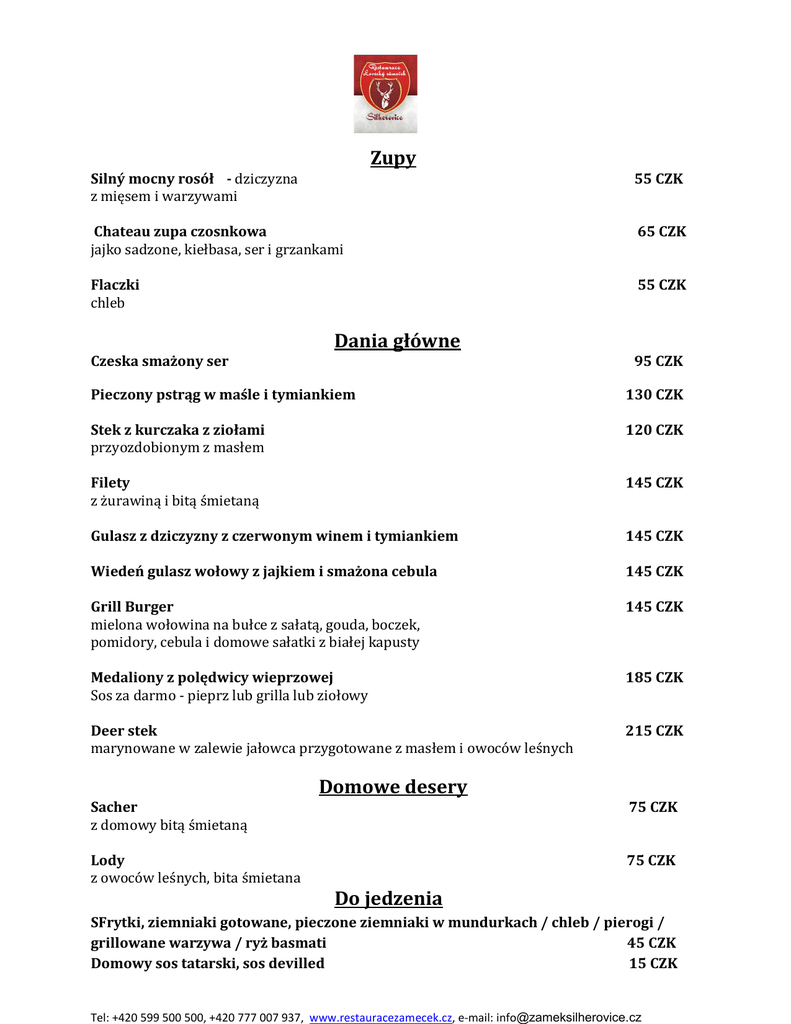 Zupy Silný mocny rosół - dziczyzna z mięsem i warzywami 55 CZK Chateau zupa czosnkowa jajko sadzone, kiełbasa, ser i grzankami 65 CZK Flaczki chleb 55 CZK Dania główne Czeska smażony ser 95 CZK Pieczony pstrąg w maśle i tymiankiem 130 CZK Stek z kurczaka z ziołami przyozdobionym z masłem 120 CZK Filety z żurawiną i bitą śmietaną 145 CZK Gulasz z dziczyzny z czerwonym winem i tymiankiem 145 CZK Wiedeń gulasz wołowy z jajkiem i smażona cebula 145 CZK Grill Burger mielona wołowina na bułce z sałatą, gouda, boczek, pomidory, cebula i domowe sałatki z białej kapusty 145 CZK Medaliony z polędwicy wieprzowej Sos za darmo - pieprz lub grilla lub ziołowy 185 CZK Deer stek marynowane w zalewie jałowca przygotowane z masłem i owoców leśnych 215 CZK Domowe desery Sacher z domowy bitą śmietaną 75 CZK Lody z owoców leśnych, bita śmietana 75 CZK Do jedzenia SFrytki, ziemniaki gotowane, pieczone ziemniaki w mundurkach / chleb / pierogi / grillowane warzywa / ryż basmati 45 CZK Domowy sos tatarski, sos devilled 15 CZK Tel: +420 599 500 500, +420 777 007 937, www.restauracezamecek.cz, e-mail: [email protected]