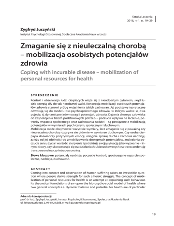 Sztuka Leczenia 2016, nr 1, ss. 19–29 Zygfryd Juczyński Instytut Psychologii Stosowanej, Społeczna Akademia Nauk w Łodzi Zmaganie się z nieuleczalną chorobą – mobilizacja osobistych potencjałów zdrowia Coping with incurable disease – mobilization of personal resources for health STRESZCZENIE Kontakt i obserwacja ludzi cierpiących wiąże się z nieodpartym pytaniem, skąd ludzie czerpią siły do tak heroicznej walki. Koncepcja mobilizacji osobistych potencjałów zdrowia stanowi próbę wyjaśnienia takich zachowań. Jej podstawy teoretyczne odwołują się do modelu bio-psychospołecznego zdrowia, w którym ważne są dwa pojęcia, tj. dynamicznej równowagi i potencjału zdrowia. Dążenia chorego człowieka do zaspokojenia trzech podstawowych potrzeb – poczucia wpływu na leczenie, potrzeby wsparcia społecznego oraz zachowania nadziei – są powiązane z mobilizacją potencjałów w wymiarach psychicznym, społecznym i duchowym. Mobilizacja może obejmować wszystkie wymiary, lecz zmaganie się z poważną czy nieuleczalną chorobą rozgrywa się głównie w wymiarze duchowym. Czy osoba cierpiąca doświadczy pozytywnych emocji, osiągnie spokój ducha i zachowa nadzieję, zależy od jej zdolności do zmobilizowania dostępnych potencjałów, znalezienia poczucia sensu życia i wartości cierpienia i potraktuje swoją sytuację jako wyzwanie – innymi słowy, czy skoncentruje się na działaniach ukierunkowanych na transcendencję transpersonalną czy intrapersonalną. Słowa kluczowe: potencjały osobiste, poczucie kontroli, spostrzegane wsparcie społeczne, nadzieja, duchowość. ABSTRACT Coming into contact and observation of human suffering raises an irresistible question where people derive strength for such a heroic struggle. The concept of mobilization of personal resources for health is an attempt at explaining such behaviour. Its theoretical foundations draw upon the bio-psycho-social model of health where two general concepts i.e. dynamic balance and potential for health are of particular Adres do korespondencji: prof. dr hab. Zygfryd Juczyński, Instytut Psychologii Stosowanej, Społeczna Akademia Nauk ul. Tokarzewskiego 2, 91-842 Łódź, e-mail: [email protected] 19 Zygfryd Juczyński importance. An ill person’s striving to satisfy his or her three basic needs i.e. the need for a sense of influence on treatment, the need of social support and the need of hope, is related to the mobilization of resources in mental, social and spiritual dimensions. The mobilization may be stimulated in all the dimensions, however, coping with a serious or incurable disease takes place mainly in the spiritual dimension. Whether or not a suffering person will experience positive emotions, a peace of mind and hope depends on his or her ability to mobilize available potentials, find meaning in life, recognize the value of suffering and perceive his situation as a challenge – in other words, whether or not they will focus on transpersonal or intrapersonal transcendence. Key words: personal resources, sense of control, perceived social support, hope, spirituality. J eszcze na początku II poł. XX wieku większość lekarzy uważała, że w przypadku chorób uważanych za nieuleczalne i gdy pomoc medyczna jest mało skuteczna, nie należy mówić choremu całej prawdy o chorobie. Dziś co prawda nie ma już dylematu „informować czy nie”, nadal jednak pozostaje problemem „co, kiedy, komu i jak powiedzieć”. A nierzadko od sposobu informowania zależy to, w jaki sposób chory zmaga się ze swoją chorobą. Dlatego wskazane jest takie informowanie, a szerzej – taki sposób podejścia, który mobilizuje człowieka do walki z chorobą. Temu celowi służy zarysowana koncepcja mobilizacji osobistych potencjałów zdrowia. Obserwacja zmagań osób przewlekle czy nieuleczalnie chorych, dotkniętych trwałym kalectwem, znoszących potworny ból i cierpienie, wiąże się z nieodpartym pytaniem, skąd ci ludzie czerpią siły do tej walki, a do tego jeszcze – w wielu przypadkach – zachowując niezwykłą pogodę ducha? Co daje siłę do zmagania się z przewlekłą czy nieuleczalną chorobą, niesprawnością? Odpowiedź, jaka się nasuwa, iż chodzi o chęć do życia, tak naprawdę niczego nie wyjaśnia, a wręcz rodzi jeszcze więcej pytań. Trafniejsza jest odpowiedź z medycznego punktu widzenia, który uwzględnia rodzaj choroby, jej stan kliniczny i dotychczasowy przebieg. Chodzi mianowicie o rokowanie: jeżeli jest pomyśl- 20 ne, to mobilizuje chorego do walki z chorobą i poddania się nawet najbardziej uciążliwym zabiegom terapeutycznym. We wcześniejszych badaniach własnych (Juczyński i in., 1997) próbowano ustalić znaczenie różnych czynników w akceptacji niepomyślnych informacji przekazywanych przez lekarza. Jedno z pytań kwestionariusza skierowanego do lekarzy onkologów (N = 106) brzmiało: Od jakich czynników zależy siła pacjenta, aby znieść prawdę o chorobie. Każdemu z sześciu wymienionych czynników należało przypisać wartość od 1 – wartość mała, do 5 – wartość duża. Zdaniem lekarzy, największe znaczenie w poradzeniu sobie pacjenta z informacjami na temat choroby odgrywa rokowanie (M = 4,59; SD = 0,91) oraz duże zaufanie do informującego lekarza (M = 3,79; SD = 1,16). Jeżeli są szanse na wyleczenie, to choremu łatwiej jest pogodzić się z faktem ciężkiej i uciążliwej choroby. Podobne pytanie postawiono w badaniach 150 chorych onkologicznie (Juczyński, 2007). Tu na pierwszym miejscu znalazło się duże zaufanie do informującego lekarza (M = 4,65; SD = 0,67), ale tuż za nim – duże szanse na wyleczenie (M = 4,59; SD = 0,86). Nie bez znaczenia był z pewnością fakt, iż badanymi byli aktualnie hospitalizowani. Kolejne co do ważności czynniki to: duże wsparcie od rodziny, głęboka wiara w Boga, wyższy poziom wykształcenia, dotychczasowe powodzenie w życiu. Warto jednak zauważyć, iż chorzy pr