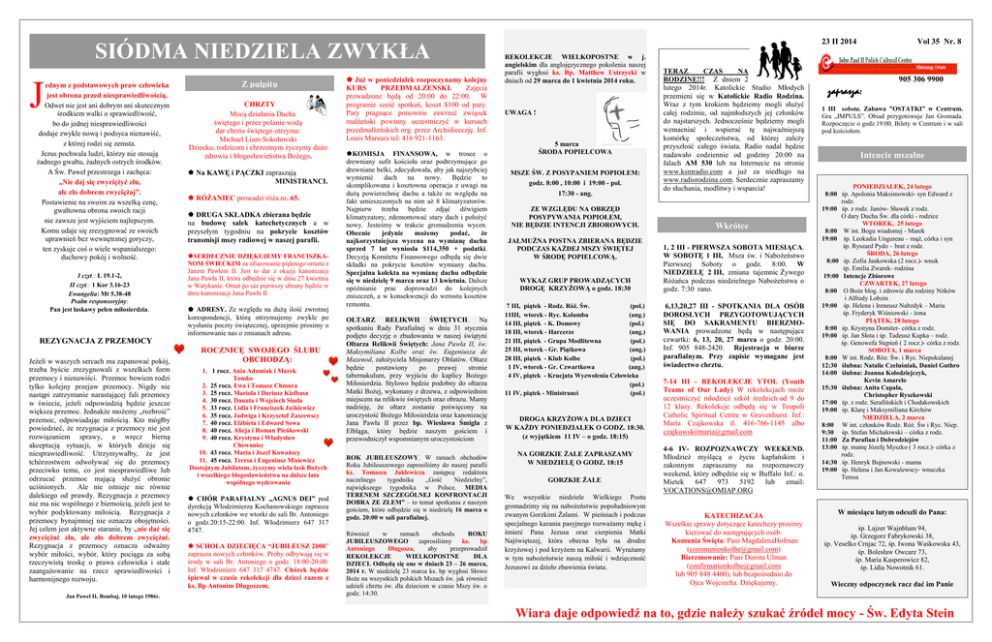 SIÓDMA NIEDZIELA ZWYKŁA ednym z podstawowych praw człowieka jest obrona przed niesprawiedliwością. Odwet nie jest ani dobrym ani skutecznym środkiem walki o sprawiedliwość, bo do jednej niesprawiedliwości dodaje zwykle nową i podsyca nienawiść, z której rodzi się zemsta. Jezus pochwala ludzi, którzy nie stosują żadnego gwałtu, żadnych ostrych środków. A Św. Paweł przestrzega i zachęca: „Nie daj się zwyciężyć złu, ale zło dobrem zwyciężaj”. Postawienie na swoim za wszelką cenę, gwałtowna obrona swoich racji nie zawsze jest wyjściem najlepszym. Komu udaje się zrezygnować ze swoich uprawnień bez wewnętrznej goryczy, ten zyskuje coś o wiele wspanialszego: duchowy pokój i wolność. J I czyt.: L 19.1-2, II czyt.: 1 Kor 3.16-23 Ewangelia: Mt 5.38-48 Psalm responsoryjny: Pan jest łaskawy pełen miłosierdzia. Z pulpitu którzy włożyli ogrom pracy w przygotowania przed Bożym Narodzeniem, i CHRZTY tym którzy swoją Mocąposługą działaniauświetnili Ducha Liturgię Z pulpitu świętego i przez polanie wodą Bożonarodzeniową. dar chrztu świętego otrzyma: Michael Liam Sokołowski Dziecku, rodzicom i chrzestnym życzymy dużo zdrowia i błogosławieństwa Bożego. Na KAWĘ i PĄCZKI zapraszają MINISTRANCI. RÓŻANIEC prowadzi róża nr. 65. DRUGA SKŁADKA zbierana będzie na budowę salek katechetycznych a w przyszłym tygodniu na pokrycie kosztów transmisji mszy radiowej w naszej parafii. SERDECZNIE DZIĘKUJEMY FRANCISZKANOM ŚWIECKIM za ofiarowanie pięknego ornatu z Janem Pawłem II. Jest to dar z okazji kanonizacji Jana Pawła II, która odbędzie się w dniu 27 kwietnia w Watykanie. Ornat po raz pierwszy ubrany będzie w dniu kanonizacji Jana Pawła II. ADRESY. Ze względu na dużą ilość zwrotnej korespondencji, którą otrzymujemy zwykle po wysłaniu poczty świątecznej, uprzejmie prosimy o informowanie nas o zmianach adresu. REZYGNACJA Z PRZEMOCY Jeżeli w waszych sercach ma zapanować pokój, trzeba byście zrezygnowali z wszelkich form przemocy i nienawiści. Przemoc bowiem rodzi tylko kolejny przejaw przemocy. Nigdy nie nastąpi zatrzymanie narastającej fali przemocy w świecie, jeżeli odpowiedzią będzie jeszcze większa przemoc. Jednakże możemy „rozbroić” przemoc, odpowiadając miłością. Kto mógłby powiedzieć, że rezygnacja z przemocy nie jest rozwiązaniem sprawy, a wręcz bierną akceptacją sytuacji, w których dzieje się niesprawiedliwość. Utrzymywałby, że jest tchórzostwem odwoływać się do przemocy przeciwko temu, co jest niesprawiedliwe lub odrzucać przemoc mającą służyć obronie uciśnionych. Ale nie istnieje nic równie dalekiego od prawdy. Rezygnacja z przemocy nie ma nic wspólnego z biernością, jeżeli jest to wybór podyktowany miłością. Rezygnacja z przemocy bynajmniej nie oznacza obojętności. Jej celem jest aktywne staranie, by „nie dać się zwyciężać złu, ale zło dobrem zwyciężać. Rezygnacja z przemocy oznacza odważny wybór miłości, wybór, który pociąga za sobą rzeczywistą troskę o prawa człowieka i stałe zaangażowanie na rzecz sprawiedliwości i harmonijnego rozwoju. Jan Paweł II, Bombaj, 10 lutego 1986r. ROCZNICĘ SWOJEGO ŚLUBU OBCHODZĄ: 1. 1 rocz. Ania Adamiak i Marek Tomko 2. 25 rocz. Ewa i Tomasz Chmura 3. 25 rocz. Mariola i Dariusz Kielbasa 4. 30 rocz. Danuta i Wojciech Siuda 5. 33 rocz. Lidia i Franciszek Jaśkiewicz 6. 35 rocz. Jadwiga i Krzysztof Zaszewscy 7. 40 rocz. Elżbieta i Edward Sowa 8. 40 rocz. Alicja i Roman Pieńkowski 9. 40 rocz. Krystyna i Władysław Chowaniec 10. 43 rocz. Maria i Jozef Kowańscy 11. 45 rocz. Teresa i Eugeniusz Misiewicz Dostojnym Jubilatom, życzymy wielu łask Bożych i wszelkiego błogosławieństwa na dalsze lata wspólnego wędrowania CHÓR PARAFIALNY „AGNUS DEI” pod dyrekcją Włodzimierza Kochanowskiego zaprasza nowych członków we wtorki do sali Br. Antoniego o godz.20:15-22:00. Inf. Włodzimierz 647 317 4747. SCHOLA DZIECIĘCA “JUBILEUSZ 2000” zaprasza nowych członków. Próby odbywają się w środy w sali Br. Antoniego o godz. 18:00-20:00. Inf. Włodzimierz 647 317 4747. Chórek będzie śpiewał w czasie rekolekcji dla dzieci razem z ks. Bp Antonim Długoszem. Już w poniedziałek rozpoczynamy kolejny KURS PRZEDMALZENSKI. Zajęcia prowadzone będą od 20:00 do 22:00. W programie sześć spotkań, koszt $100 od pary. Pary pragnące ponownie zawrzeć związek małżeński powinny uczestniczyć w kursach przedmałżeńskich org. przez Archidiecezję. Inf. Louis Marsura tel: 416 921-1163. KOMISJA FINANSOWA, w trosce o drewniany sufit kościoła oraz podtrzymujące go drewniane belki, zdecydowała, aby jak najszybciej wymienić dach na nowy. Będzie to skomplikowana i kosztowna operacja z uwagi na dużą powierzchnię dachu a także ze względu na fakt umieszczonych na nim aż 8 klimatyzatorów. Najpierw trzeba będzie zdjąć dźwigiem klimatyzatory, zdemontować stary dach i położyć nowy. Jesteśmy w trakcie gromadzenia wycen. Obecnie jedynie możemy podać, że najkorzystniejsza wycena na wymianę dachu sprzed 7 lat wyniosła $114,350 + podatki. Decyzją Komitetu Finansowego odbędą się dwie składki na pokrycie kosztów wymiany dachu. Specjalna kolekta na wymianę dachu odbędzie się w niedzielę 9 marca oraz 13 kwietnia. Dalsze opóźnianie prac doprowadzi do kolejnych zniszczeń, a w konsekwencji do wzrostu kosztów remontu. OŁTARZ RELIKWII ŚWIĘTYCH. Na spotkaniu Rady Parafialnej w dniu 31 stycznia podjęto decyzję o zbudowaniu w naszej świątyni Ołtarza Relikwii Świętych: Jana Pawła II, św. Maksymiliana Kolbe oraz św. Eugeniusza de Mazenod, założyciela Misjonarzy Oblatów. Ołtarz będzie postawiony po prawej stronie tabernakulum, przy wyjściu do kaplicy Bożego Miłosierdzia. Stylowo będzie podobny do ołtarza Matki Bożej, wykonany z drzewa, z odpowiednim miejscem na relikwie świętych oraz obrazu. Mamy nadzieję, że ołtarz zostanie poświęcony na uroczysto