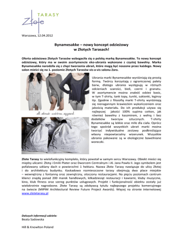 Warszawa, 12.04.2012 Bynamesakke – nowy koncept odzieżowy w Złotych Tarasach! Oferta odzieżowa Złotych Tarasów wzbogaciła się o polską markę Bynamesakke. To nowy koncept odzieżowy, który ma w swoim asortymencie eko-ubrania wykonane z czystej bawełny. Marka Bynamesakke narodziła się z chęci tworzenia ubrań, które mogą być noszone przez każdego. Nowy salon mieści się na 1. poziomie Złotych Tarasów vis-a-vis salonu Zara. Ubrania marki Bynamesakke wyróżniają się prostą formą. Twórcy korzystają z ograniczonej palety barw, dlatego ubrania występują w różnych odcieniach szarości, bieli, czerni i granatu. W asortymencie można znaleźć odzież basic, w tym T-shirty, tank topy, tuniki, sukienki, leginsy itp. Zgodnie z filozofią marki T-shirty wyróżniają się nienagannym krawieckim wykończeniem oraz jakością materiału. Do ich produkcji używa się najlepszej jakości 100% supima cotton, jak również bawełny z kaszmirem, z wełną i bez dodatków tworzyw sztucznych. T-shirty Bynamesakke są lekkie oraz miłe dla ciała. Oprócz tego spośród wszystkich ubrań marki można tworzyć indywidualne zestawy podkreślające własny niepowtarzalny wizerunek. Wszystkie ubrania pakowane są w ekologiczne bawełniane woreczki. Złote Tarasy to wielofunkcyjny kompleks, który powstał w samym sercu Warszawy. Obiekt mieści się między ulicami: Złotą i Emilii Plater oraz Dworcem Centralnym i Al. Jana Pawła II. Jego symbolem jest pofalowany szklany dach o powierzchni 1 hektara. Nazwa Złote Tarasy nawiązuje do ulicy Złotej i do architektury budynku. Kaskadowo rozmieszczone tarasy obejmują dwa place miejskie – wewnętrzny z fontanną oraz zewnętrzny, otoczony restauracjami. Na pięciu poziomach centrum klienci znajdą ponad 200 marek handlowych, kilkadziesiąt restauracji i kawiarni, kluby muzyczne, kino, klub fitness oraz szereg punktów usługowych. Projekt i funkcjonalność obiektu zostały już wielokrotnie nagrodzone. Złote Tarasy są zdobywcą tytułu najlepszego projektu komercyjnego na świecie (MIPIM Architectural Review Future Project Awards). Więcej na stronie internetowej www.zlotetarasy.pl Dalszych informacji udziela: Beata Sadowska Hill & Knowlton Poland m:+48 (0) 609 14 02 05 p: +48 (22) 646 22 02 ext. 131 f: +48 (22) 646 33 19 [email protected]