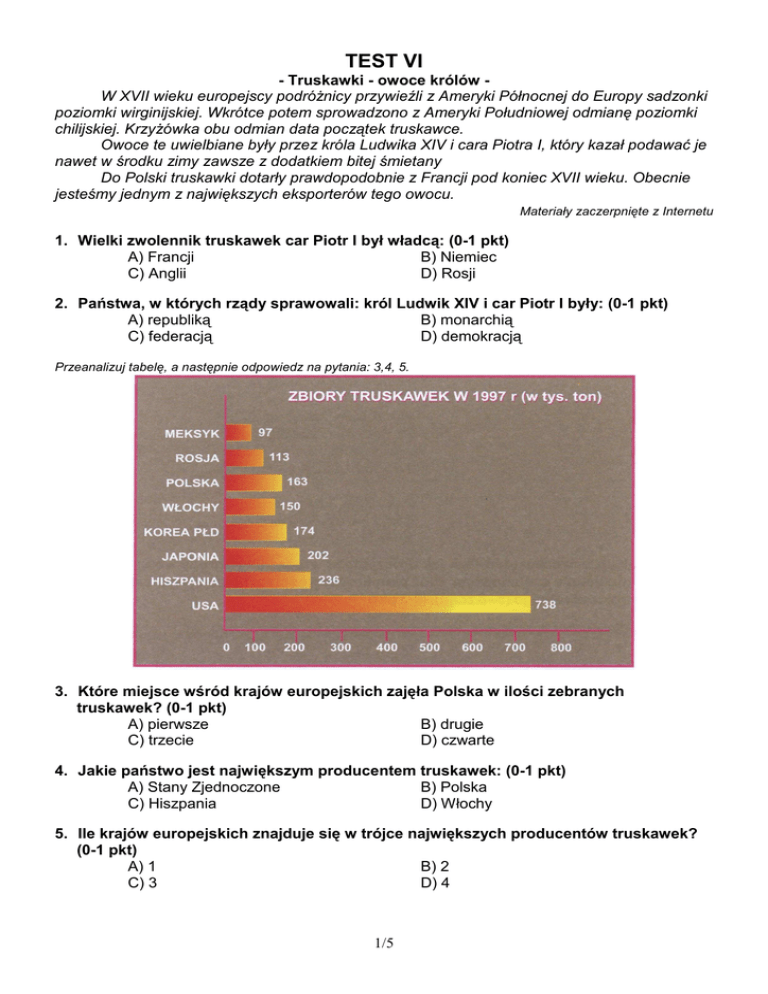 TEST VI - Truskawki - owoce królów W XVII wieku europejscy podróŜnicy przywieźli z Ameryki Północnej do Europy sadzonki poziomki wirginijskiej. Wkrótce potem sprowadzono z Ameryki Południowej odmianę poziomki chilijskiej. KrzyŜówka obu odmian data początek truskawce. Owoce te uwielbiane były przez króla Ludwika XIV i cara Piotra I, który kazał podawać je nawet w środku zimy zawsze z dodatkiem bitej śmietany Do Polski truskawki dotarły prawdopodobnie z Francji pod koniec XVII wieku. Obecnie jesteśmy jednym z największych eksporterów tego owocu. Materiały zaczerpnięte z Internetu 1. Wielki zwolennik truskawek car Piotr I był władcą: (0-1 pkt) A) Francji B) Niemiec C) Anglii D) Rosji 2. Państwa, w których rządy sprawowali: król Ludwik XIV i car Piotr I były: (0-1 pkt) A) republiką B) monarchią C) federacją D) demokracją Przeanalizuj tabelę, a następnie odpowiedz na pytania: 3,4, 5. 3. Które miejsce wśród krajów europejskich zajęła Polska w ilości zebranych truskawek? (0-1 pkt) A) pierwsze B) drugie C) trzecie D) czwarte 4. Jakie państwo jest największym producentem truskawek: (0-1 pkt) A) Stany Zjednoczone B) Polska C) Hiszpania D) Włochy 5. Ile krajów europejskich znajduje się w trójce największych producentów truskawek? (0-1 pkt) A) 1 B) 2 C) 3 D) 4 1/5 6. 10 dag surowych truskawek pokrywa dzienne zapotrzebowanie organizmu na witaminę C, która: (0-1 pkt) A) zapobiega krzywicy B) wspomaga budowę kości C) wpływa korzystnie D) wzmacnia odporność na narząd wzroku 7. Oblicz, ile w 1 kilogramie truskawek znajduje się tłuszczu, a ile węglowodanów. Wykonaj wszystkie obliczenia. (0-3 pkt) Wartości odŜywcze w 100g truskawek WĘGLOWODANY 6,5 g BIAŁKO 0,7 g TŁUSZCZ 0,4 g ……………………………….……………………………………………………………………………… ……………………………….……………………………………………………………………………… ……………………………….……………………………………………………………………………… ……………………………….……………………………………………………………………………… ……………………………….……………………………………………………………………………… ……………………………….……………………………………………………………………………… ……………………………….……………………………………………………………………………… ……………………………….……………………………………………………………………………… ……………………………….……………………………………………………………………………… ……………………………….……………………………………………………………………………… ……………………………….……………………………………………………………………………… ……………………………….……………………………………………………………………………… Działka pana Nowaka ma kształt prostokąta o wymiarach 50 m na 40 m. Zaplanował, Ŝe na 1 powierzchni działki zasadzi truskawki, 30% powierzchni przeznaczy na warzywa, a pozostałą 4 część na rekreację. 8. Działka pana Nowaka ma powierzchnię: (0-1 pkt) A) 180 m2 B) 200 a C) 20a D) 200m2 9. Truskawki zajęły powierzchnię: (0-1 pkt) A) 45 m2 C) 50a B) 0,5 a D) 5a 10. Jaką część działki przeznaczył na rekreację? (0-1 pkt] 5 11 A) B) 12 20 9 7 D) C) 20 12 2/5 11. Monika i Iza wybrały się do cukierni. Korzystając z promocji kaŜda z nich zamówiła dwie gałki lodów truskawkowych z bitą śmietaną, mus truskawkowy oraz truskawkowy sos do lodów. Oblicz, ile złotych zapłaciły i ile złotych zyskały na promocji. (0-4 pkt) ……………………………….……………………………………………………………………………… ……………………………….……………………………………………………………………………… ……………………………….……………………………………………………………………………… ……………………………….……………………………………………………………………………… ……………………………….……………………………………………………………………………… ……………………………….……………………………………………………………………………… ……………………………….……………………………………………………………………………… ……………………………….……………………………………………………………………………… ……………………………….……………………………………………………………………………… ……………………………….……………………………………………………………………………… ……………………………….……………………………………………………………………………… ……………………………….……………………………………………………………………………… 12. Monika, jedząc lody, ubrudziła sobie nową sukienkę. Na metce zauwaŜyła dwa symbole. Oznaczają one: A) prać w temperaturze 30 stopni C, nie prasować B) nie prać w temperaturze powyŜej 30 stopni C, nie wirować C) prać w temperaturze poniŜej 30 stopni C, nie prasować D) prać ręcznie w temperaturze 30 stopni C, nie wirować "Kuchnia była wysoka, ciemnawa, zaopatrzona w liczne szafy ścienne, zab