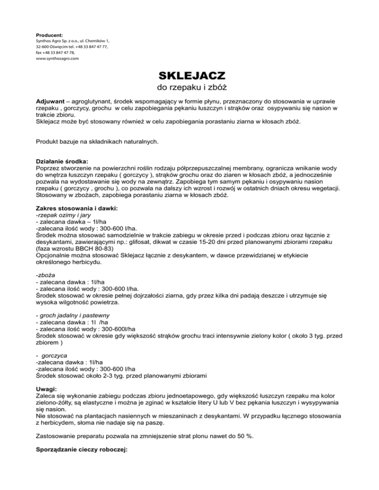 Producent: Synthos Agro Sp. z o.o., ul. Chemików 1, 32-600 Oświęcim tel. +48 33 847 47 77, fax +48 33 847 47 78, www.synthosagro.com SKLEJACZ do rzepaku i zbóż Adjuwant – agroglutynant, środek wspomagający w formie płynu, przeznaczony do stosowania w uprawie rzepaku , gorczycy, grochu w celu zapobiegania pękaniu łuszczyn i strąków oraz osypywaniu się nasion w trakcie zbioru. Sklejacz może być stosowany również w celu zapobiegania porastaniu ziarna w kłosach zbóż. Produkt bazuje na składnikach naturalnych. Działanie środka: Poprzez stworzenie na powierzchni roślin rodzaju półprzepuszczalnej membrany, ogranicza wnikanie wody do wnętrza łuszczyn rzepaku ( gorczycy ), strąków grochu oraz do ziaren w kłosach zbóż, a jednocześnie pozwala na wydostawanie się wody na zewnątrz. Zapobiega tym samym pękaniu i osypywaniu nasion rzepaku ( gorczycy , grochu ), co pozwala na dalszy ich wzrost i rozwój w ostatnich dniach okresu wegetacji. Stosowany w zbożach, zapobiega porastaniu ziarna w kłosach zbóż. Zakres stosowania i dawki: -rzepak ozimy i jary - zalecana dawka – 1l/ha -zalecana ilość wody : 300-600 l/ha. Środek można stosować samodzielnie w trakcie zabiegu w okresie przed i podczas zbioru oraz łącznie z desykantami, zawierającymi np.: glifosat, dikwat w czasie 15-20 dni przed planowanymi zbiorami rzepaku (faza wzrostu BBCH 80-83) Opcjonalnie można stosować Sklejacz łącznie z desykantem, w dawce przewidzianej w etykiecie określonego herbicydu. -zboża - zalecana dawka : 1l/ha - zalecana ilość wody : 300-600 l/ha. Środek stosować w okresie pełnej dojrzałości ziarna, gdy przez kilka dni padają deszcze i utrzymuje się wysoka wilgotność powietrza. - groch jadalny i pastewny - zalecana dawka : 1l /ha - zalecana ilość wody : 300-600l/ha Środek stosować w okresie gdy większość strąków grochu traci intensywnie zielony kolor ( około 3 tyg. przed zbiorem ) - gorczyca -zalecana dawka : 1l/ha -zalecana ilość wody : 300-600 l/ha Środek stosować około 2-3 tyg. przed planowanymi zbiorami Uwagi: Zaleca się wykonanie zabiegu podczas zbioru jednoetapowego, gdy większość łuszczyn rzepaku ma kolor zielono-żółty, są elastyczne i można je zginać w kształcie litery U lub V bez pękania łuszczyn i wysypywania się nasion. Nie stosować na plantacjach nasiennych w mieszaninach z desykantami. W przypadku łącznego stosowania z herbicydem, słoma nie nadaje się na paszę. Zastosowanie preparatu pozwala na zmniejszenie strat plonu nawet do 50 %. Sporządzanie cieczy roboczej: Określoną ilość produktu Sklejacz wlać do zbiornika opryskiwacza napełnionego częściowo wodą (z włączonym mieszadłem) i uzupełnić wodą do potrzebnej ilości. W przypadku stosowania łącznego z desykantem, w pierwszej kolejności należy sporządzić ciecz roboczą herbicydu, a następnie wlać określoną ilość Sklejacza do sporządzonej uprzednio cieczy roboczej. Opryskiwać z włączonym mieszadłem. Po pracy aparaturę umyć. Przechowywanie: Nie przechowywać razem z żywnością, napojami i paszami dla zwierząt. Chronić przed dziećmi. Przechowywać wyłącznie w oryginalnym opakowaniu w temperaturze nie niższej niż 5 0C i nie wyższej niż 30 0C. Postępowanie z odpadami produktu i opakowaniowymi: Czyste opakowanie traktować jako odpad komunalny, przeznaczony do zbiórki selektywnej. Zabrania się spalania opakowań we własnym zakresie. Produkt nie jest sklasyfikowany jako niebezpieczny. Zawartość netto opakowania: … ltr Data ważności: Nr serii: