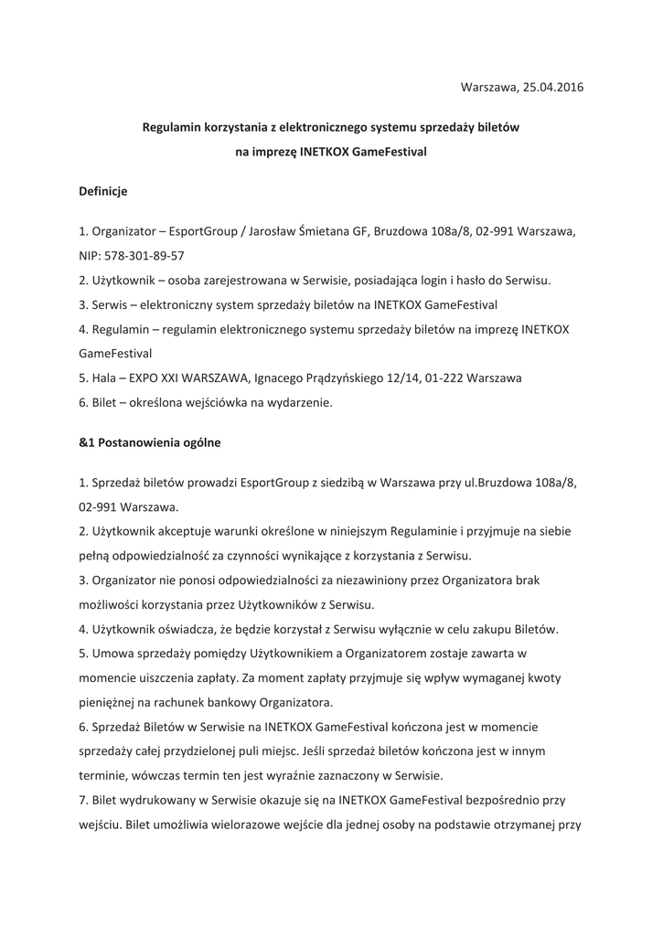 Warszawa, 25.04.2016 Regulamin korzystania z elektronicznego systemu sprzedaży biletów na imprezę INETKOX GameFestival Definicje 1. Organizator – EsportGroup / Jarosław Śmietana GF, Bruzdowa 108a/8, 02-991 Warszawa, NIP: 578-301-89-57 2. Użytkownik – osoba zarejestrowana w Serwisie, posiadająca login i hasło do Serwisu. 3. Serwis – elektroniczny system sprzedaży biletów na INETKOX GameFestival 4. Regulamin – regulamin elektronicznego systemu sprzedaży biletów na imprezę INETKOX GameFestival 5. Hala – EXPO XXI WARSZAWA, Ignacego Prądzyńskiego 12/14, 01-222 Warszawa 6. Bilet – określona wejściówka na wydarzenie. &1 Postanowienia ogólne 1. Sprzedaż biletów prowadzi EsportGroup z siedzibą w Warszawa przy ul.Bruzdowa 108a/8, 02-991 Warszawa. 2. Użytkownik akceptuje warunki określone w niniejszym Regulaminie i przyjmuje na siebie pełną odpowiedzialność za czynności wynikające z korzystania z Serwisu. 3. Organizator nie ponosi odpowiedzialności za niezawiniony przez Organizatora brak możliwości korzystania przez Użytkowników z Serwisu. 4. Użytkownik oświadcza, że będzie korzystał z Serwisu wyłącznie w celu zakupu Biletów. 5. Umowa sprzedaży pomiędzy Użytkownikiem a Organizatorem zostaje zawarta w momencie uiszczenia zapłaty. Za moment zapłaty przyjmuje się wpływ wymaganej kwoty pieniężnej na rachunek bankowy Organizatora. 6. Sprzedaż Biletów w Serwisie na INETKOX GameFestival kończona jest w momencie sprzedaży całej przydzielonej puli miejsc. Jeśli sprzedaż biletów kończona jest w innym terminie, wówczas termin ten jest wyraźnie zaznaczony w Serwisie. 7. Bilet wydrukowany w Serwisie okazuje się na INETKOX GameFestival bezpośrednio przy wejściu. Bilet umożliwia wielorazowe wejście dla jednej osoby na podstawie otrzymanej przy wejściu opaski identyfikacyjnej.. 8. Bilet nieczytelny, zniszczony lub uszkodzony może zostać uznany za nieważny. &2 Proces zakupu 1. Proces zakupu Biletów w Systemie internetowym składa się z następujących kroków: a) zalogowanie się do Systemu internetowego – ticketik.pl; b) wybór interesującego wydarzenia z dostępnych na stronie; c) wybór ilości Biletów w odpowiedniej kategorii; d) wybór rodzajów biletów z widoku grafiki; e) kontynuowanie zakupów bądź przejście do koszyka, w którym można zobaczyć całe swoje zamówienie; e) akceptacja zawartości koszyka i bezpośrednie logowanie do elektronicznego systemu płatności internetowych PayU; f) dokonanie płatności; g) potwierdzenie dokonania płatności i możliwość wydruku Biletu. 2. Po dokonaniu płatności w ramach jednego zamówienia nie ma możliwości zmniejszenia lub zwiększenia liczby zakupionych Biletów poprzez ponowną edycję zamówienia. 3. Bilet wydrukowany z Systemu internetowego okazuje się po wejściu do hali bezpośrednio osobom odpowiadającym za system sprawdzania biletów. 4. Bilet z Systemu internetowego powinien być wydrukowany na papierze białym lub o innym jasnym kolorze i gładkiej fakturze, celem odczytania zamieszczonego kodu kreskowego przez skanery. Możliwe jest skanowanie kodów bezpośrednio z urządzeń mobilnych, jednak zaleca się posiadanie Biletu w formie papierowej. 5. Organizator nie drukuje Biletów zakupionych w Systemie internetowym w kasie Hali przed wydarzeniem. 6. Każda umowa sprzedaży Biletów rejestrowana jest w systemie informatycznym Organizatora. 7. Rezerwacje Biletów w Systemie internetowym tracą ważność i są usuwane automatycznie po 30 minutach, jeśli zamówienie nie zostało opłacone. &3 Ochrona danych osobowych 1. Przetwarzanie danych osobowych nabywcy odbywa się na zasadach określonych przepisami ustawy z dnia 29 sierpnia 1997r. o ochronie danych osobowych. 2. Administratorem danych osobowych w rozumieniu ustawy z dnia 29 sierpnia 1997r. o ochronie danych osobowych będzie z upoważnienia Organizatora firma Ticketik Sp. z o.o. . 3. Organizator i Administrator oświadczają, że dane osobowe są przetwarzane wyłącznie w celu i zakresie związanym ze sprzedażą i korzystaniem z Biletów lub Karnetów oraz obsługą Systemu internetowego. 4. Organizator i Administrator mogą przetwarzać następujące dane osobowe Użytkownika niezbędne do celów wskazanych w pkt. 3 niniejszego paragrafu: a) nazwisko i imiona Użytkownika, b) numer ewidencyjny PESEL lub – gdy ten numer nie został nadany – numer paszportu, dowodu osobistego lub innego dokumentu potwierdzającego tożsamość, c) adres zameldowania na pobyt stały, d) adres do korespondencji, jeżeli jest inny niż adres, o którym mowa w ust. 3, e) dane służące do weryfikacji podpisu elektronicznego usługobiorcy, f) adresy elektroniczne usługobiorcy. 5. Organizator zobowiązuje się, że przed rozpoczęciem przetwarzania danych podejmie środki techniczne i organizacyjne mające na celu zabezpieczenie powierzonych danych osobowych przed ich udostępnieniem osobom nieupoważnionym, zabraniem przez osobę nieuprawnioną, przetwarzaniem z naruszeniem ustawy oraz zmianą, utratą, uszkodzeniem lub zniszczeniem. 6. Każdy Nabywca ma prawo dostępu do treści swoich danych osobowych oraz do ich poprawiania oraz ma prawo wnieść pisemne żądanie zaprzestania przetwarzania danych, a także wnieść sprzeciw wobec przetwarzania jego danych, w przypadkach wskazanych przez prawo. 7. Do użytkownika Systemu internetowego należy dbałość o zachowanie w tajemnicy wszelkich informacji służących do jednoznacznej jego identyfikacji. Klub nie ponosi odpowiedzialności za skutki ujawnienia przez klienta swoich danych osobom trzecim. 8. Organizator udziela informacji o danych, o których mowa powyżej, organom państwa na potrzeby prowadzonych przez nie postępowań. &4 Odstąpienie od umowy 1. W przypadku odwołania imprezy zakup biletów automatycznie uznaje się za unieważniony. Organizator zwraca w całości należność uiszczoną za bilety. 2. Można także odstąpić o zakupu biletów zgo