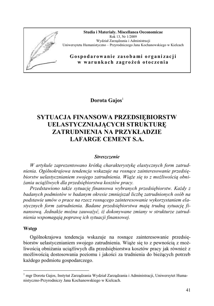 Studia i Materiały. Miscellanea Oeconomicae Rok 13, Nr 1/2009 Wydział Zarządzania i Administracji Uniwersytetu Humanistyczno – Przyrodniczego Jana Kochanowskiego w Kielcach G o s p o d a r o w a n i e z a s o b a mi o r g a n i z a c j i w w ar unkac h zag ro że ń ot oc ze nia Dorota Gajos1 SYTUACJA FINANSOWA PRZEDSIĘBIORSTW UELASTYCZNIAJĄCYCH STRUKTURĘ ZATRUDNIENIA NA PRZYKŁADZIE LAFARGE CEMENT S.A. Streszczenie W artykule zaprezentowano krótką charakterystykę elastycznych form zatrudnienia. Ogólnokrajowa tendencja wskazuje na rosnące zainteresowanie przedsiębiorstw uelastycznianiem swojego zatrudnienia. Wiąże się to z możliwością obniżania uciążliwych dla przedsiębiorstwa kosztów pracy. Przedstawiono także sytuację finansowa wybranych przedsiębiorstw. Każdy z badanych podmiotów w badanym okresie zmniejszał liczbę zatrudnionych osób na podstawie umów o prace na rzecz rosnącego zainteresowanie wykorzystaniem elastycznych form zatrudnienia. Badane przedsiębiorstwa mają trudną sytuację finansową. Jednakże można zauważyć, iż dokonywane zmiany w strukturze zatrudnienia wspomagają poprawę ich sytuacji finansowej. Wstęp Ogólnokrajowa tendencja wskazuje na rosnące zainteresowanie przedsiębiorstw uelastycznianiem swojego zatrudnienia. Wiąże się to z pewnością z możliwością obniżania uciążliwych dla przedsiębiorstwa kosztów pracy jak również z możliwością dostosowania poziomu i jakości za trudnienia do bieżących potrzeb każdego podmiotu gospodarczego. 1 mgr Dorota Gajos, Instytut Zarządzania Wydział Zarządzania i Administracji, Uniwersytet Humanistyczno-Przyrodniczy Jana Kochanowskiego w Kielcach. 41 System swobodnego dopasowywania warunków i organizacji pracy, zwiększania lub redukowania zatrudnienia w przedsiębiorstwie w zależności od warunków ekonomicznych, rynkowych i technicznych, do realnych możliwości i potrzeb przedsiębiorstwa prowadzi do rozwoju tzw. „akordeonowego zarządzania” zasobami ludzkimi. Efektem powyższych procesów jest zmiana proporcji między zatrudnieniem typowym i nietypowym, objawiająca się zmniejszeniem popytu na pracę etatową, stałą – typową i zwiększeniem zapotrzebowania na pracę o charakterze zmiennym – okresowym i zadaniowym. Rozwiązania prowadzące do wzrostu elastyczności zatrudnienia zmierzają w istocie do odnalezienia punktu, w którym przedsiębiorstwo maksymalizuje korzyści i minimalizuje koszty zatrudnienia. Świadome i celowe grupowanie pracowników powinno odbywać się na podstawie oceny ich kompetencji, zdolności do rozwoju zgodnie z potrzebami przedsiębiorstwa, rodzaju wykonywanej pracy i jej przydatności dla przedsiębiorstwa, ze szczególnym uwzględnieniem kryterium efektywności i produktywności. Miarą zatrudnienia produktywnego jest szybsze tempo wzrostu wydajności pracy niż wynagrodzeń, w odpowiednich i korzystnych dla przedsiębiorstwa proporcjach2. Kryterium zatrudnienia produktywnego, wykorzystywanego całkowicie i efektywnie w połączeniu z imperatywem szybkiego reagowania na zmiany w otoczeniu przedsiębiorstwa determinuje kształtowanie elastycznych zasobów pracy. W artykule zaprezentowano poziom zatrudnienia oraz zmieniającą się sytuację finansowo-majątkową wybranego podmiotu gospodarczego. Zarządzanie zasobami ludzkimi Od kilkunastu lat obserwuje się przemianę w obszarze zarządzania zasobami ludzkimi. Charakteryzuje się ona przechodzeniem od tradycyjnego administrowania dobrami do strategicznego zarządzania zasobami ludzkimi. Zarządzanie zasobami ludzkimi można zatem zdefiniować jako: strategiczne dysponowanie zasobami ludzkimi w celu osiągnięcia strategicznych celów organizacji. Zadania controllingu zasobów ludzkich (controllingu personalnego) definiowane są „pasywnie” jako wykrywanie tzw. wąskich gardeł w przedsiębiorstwie lub jako system wczesnego ostrzegania, bądź „aktywnie” jako optymalne wykorzystanie możliwości tkwiących w posiadanych zasobach ludzkich przez takie ich kształtowanie, aby pomnażać wartość i sukces przedsiębiorstwa. Ponieważ podstawę podejmowania decyzji zarządczych stanowi obecna i przyszła dostępność zasobów, w tym aktualne i przyszłe zasoby personalne, konieczne jest aktywne ich kształtowanie i optymalne wykorzystanie. Długofalowe planowanie i kształtowanie zasobów ludzkich ograniczy nieoczekiwany wzrost kosztów personalnych i pochodnych, zabezpieczy potencjał ludzki potrzebny do realizacji strategii przedsiębiorstwa i jego rozwoju. Planowanie zapotrzebowania na zasoby ludzkie musi uwzględniać: - wymaganą ilość pracowników w określonym czasie, ustaloną na podstawie 2 Z. Sekuła, Planowanie zatrudnienia, Typowe i elastyczne formy zatrudniania pracowników, Oficyna Ekonomiczna, Kraków 2001. 42 planów rzeczywistych i projektów, - wymagane kwalifikacje potrzebnych pracowników, - szacowaną stopę fluktuacji (uwzględniającą także przejścia na emerytury, służbę wojskową), - straty czasu, jakie należy uwzględnić w szacunkach w oparciu o dane z przeszłości. Właściwe wykorzystanie zasobów ludzkich umożliwia ograniczenie kosztów związanych z fluktuacja pracowników, zarówno kosztów bezpośrednich, związanych z odchodzącym (odprawa, ekwiwalent za urlop) i z nowo zatrudnianym pracownikiem (ogłoszenia prasowe, czas poświęcony na selekcję kandydatów, szkolenia), jak i pośrednich, związanych z niższą wydajnością pod koniec pracy odchodzącego pracownika, niższą wydajnością nowo zatrudnionego i szkolącego go współpracownika, czasem pracy pracownika załatwiającego formalności odchodzącego i przychodzącego pracownika. Jednym z zadań podkreślanych przez literaturę jest aktywne uczestnictwo w planowaniu ilościowym, jakościowym i wartościowym zasobów ludzkich. Przy tworzeniu planu zatrudnienia, na podstawie zapotrzebowania poszczególnych działów, controller działu personalnego powinien określi