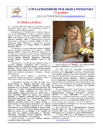 GWIAZDOZBIÓR POLSKIEJ PIOSENKI 17 grudnia STRZELEC Opracowanie: Wojciech Dąbrowski www.spotkaniazpiosenka.org ELŻBIETA IGRAS (ur. 17 grudnia 1947 roku, Biłgoraj), piosenkarka o niskim, niezwykłej barwy głosie. Jest absolwentką UMCS w Lublinie (wydział filologii rosyjskiej). Debiutowała na II Młodzieżowym Festiwalu Muzycznym (zespół Bezimienni, I miejsce w kategorii solistów, nagroda specjalna radiowego Popołudnia z młodością, 1969), była laureatką VII Festiwalu Piosenki Studenckiej (Brązowy Trubadur, 1969), II Młodzieżowego Festiwalu Muzycznego w Chorzowie i Rybniku (1969) i III FPŻ w Kołobrzegu (Złoty Pierścień za interpretację piosenki Rodzinne pamiątki, muz. Janusz Pliwko, sł. Zbigniew Stawecki, 1969). Występowała z zespołami Quorum, Portrety, Alibabki. Karierę zawodową rozpoczęła od występów w Klubie Piosenki ZAKR w Warszawie (1970). Na kilkanaście lat związała się z popularną audycją radiową Podwieczorek przy mikrofonie. Występowała z orkiestrami radiowymi pod dyrekcją Stefana Rachonia, Bogusława Klimczuka, Jerzego Miliana i Henryka Debicha, nagrała ok. 80 piosenek. Koncertowała w Czechosłowacji, Bułgarii (tournee z zespołami Alibabki i Trubadurzy, 1971), Jugosławii (z Haliną Frąckowiak i Stefanem Zachem, Coupe d’Europe Musicale, Belgrad, 1971), Francji (Festiwal International des Varietes et Music-Halls, Rennes, 1972), NRD, Rumunii, ZSRR oraz ośrodkach polonijnych w Kanadzie i Stanach Zjednoczonych. Zdobywała liczne nagrody i wyróżnienia na Festiwalach Piosenki (wyróżnienie za najlepszy debiut, X KFPP, Opole, 1972, FPŻ, Kołobrzeg, 1971-1974). Najważniejsze piosenki: Co dasz mi dniu (muz. Janusz Pliwko, sł. Zbigniew Stawecki), Czego mogę chcieć od ciebie (muz. Marian Zimiński, sł. M. Szop), Epitafium (muz. K. Dragan, sł. Kalina Jerzykowska), Idę ziemią (muz. A. Żylis, sł. Kalina Jerzykowska), Kolczyki Izoldy (muz. Adam Sławiński, do tekstu K. I. Gałczyńskiego), Mamy jeden świat (muz. Marek Sart, sł. Jerzy Ficowski), Miłość nie umiera (muz. Jarosław Kukulski, sł. Zbigniew Adrjański Jacek Podkomorzy), Mówiłeś tyle dobrych słów (muz. Antoni Kopff, sł. Andrzej Kudelski), Odmłodzone tango (muz. D. Pokross, sł. Zbigniew Stawecki), Piasek (muz. Juliusz Loranc, sł. Jonasz Kofta), Pod drewnianym kamieniem (muz. Marek Sart, sł. Jerzy Ficowski), Szczęście (muz. Marek Ałaszewski do wiersza Maryli Wolskiej), W samym środku życia (muz. Marek Sart, sł. Jonasz Kofta), Zatrzymamy tę miłość do wiosny (muz. K. Dragan, sł. W. Czołnik), Ze mną bądź (muz. Hubert Szymczyński, sł. Mirosław Łebkowski i Stanisław Werner), Żołnierka, żołnierka (muz. Wojciech Trzciński, sł. Jerzy Kleyny). Śpiewa piosenki z repertuaru Marleny Dietrich, Leonarda Cohena, Chrisa Rea. Potrafi zaśpiewać arię Skołuby z opery Straszny Dwór Stanisława Moniuszki w oryginalnej tonacji. Od 1977 roku jest mieszkanką warszawskiego Ursynowa, była radną Gminy Ursynów i przewodnicząca Komisji Kultury (1998-2002), felietonistką tygodnika Passa (cykl Babskie gadanie). Jako radna, dążyła do integracji środowisk artystycznych Ursynowa, zainicjowała I Wystawę Ursynowskich Artystów Plastyków – Wyjście z szuflady i koncert Kulturalna Ursynoterapia (w ramach Dni Ursynowa) z udziałem gwiazd piosenki i teatru zamieszkałych w tej dzielnicy. Jest współautorem tekstu piosenki Kocham życie na Ursynowie (z Janem K. Siwkiem, muz. Henryk Wojciechowski). Jest animatorką kultury, pomysłodawcą i dyrektorem artystycznym popularnego wśród śpiewającej młodzieży Ogólnopolskiego Konkursu Piosenkarzy Amatorów MUFKA (7 edycji, 2000-2006). W ramach pracy edukacyjnej z wokalistami-amatorami, prowadzi zajęcia z młodymi wokalistami w ramach autorskiego projektu Poeci piosenki, utworzyła grupę Przyjaciele Mufki, która ma na swoim koncie m.in. występy na placu Zamkowym z programem Mój sen o Warszawie oraz spektakle Jonaszowe ogrody i Niemen-wspomnienie. Była członkiem jury I Ogólnopolskiego Festiwalu Piosenki Retro im. Mieczysława Fogga w Krakowie (listopad 2004 roku). Zaśpiewała tam gościnnie piosenkę Mały gigolo (muz. L. Cassuci, sł. polskie Marian Hemar). 17 grudnia 2005 roku, w DK Stokłosy na Ursynowie, zorganizowała uroczysty koncert z okazji 35 lat artystycznej działalności zawodowej. www.mufka.com.pl Gwiazdozbiór polskiej piosenki – Elżbieta Igras KOCHAM ŻYCIE NA URSYNOWIE Muzyka: Henryk Wojciechowski, słowa: Elżbieta Igras, Jan K. Siwek piosenka z repertuaru ursynowskiej formacji Przyjaciele Mufki 1. Znam te domy, te balkony całe w kwiatach, Znam uliczki i ogródki na Kabatach, A Imielin jaki piękny, a Stokłosy! Moim Jarom nigdy też nie powiem „dosyć”. Mam tu bliskich, mam przyjaciół, mam swój świat. O tym właśnie ursynowski śpiewa wiatr: Refren: Kocham życie na Ursynowie, Na Ursynowie nie jest mi źle. Co tam Paryż, Planty w Krakowie Ja mam tu swoją aleję KEN /2 razy/ 2. Stąd bliziutko mam spacerkiem do Powsina, Gdzie cudownie się czerwieni jarzębina. W Natolinie rosną gaje dzikich śliwek, A w stadninie pędzą konie wiatrogrzywe. W letni wieczór na balkonie spędzam czas, Patrząc w niebo, caluteńkie niebo gwiazd. Refren: Kocham życie...itd 3. Mandarynki – to uliczka Natolina, Zawsze święta mi swą nazwą przypomina. Migdałami wciąż mi pachnie Migdałowa, Wiolinowa – to muzyka Ursynowa. No, a ludzie, a dzieciaki, nawet psy Uśmiechają się najpiękniej – wierzcie mi! Refren: Kocham życie...itd