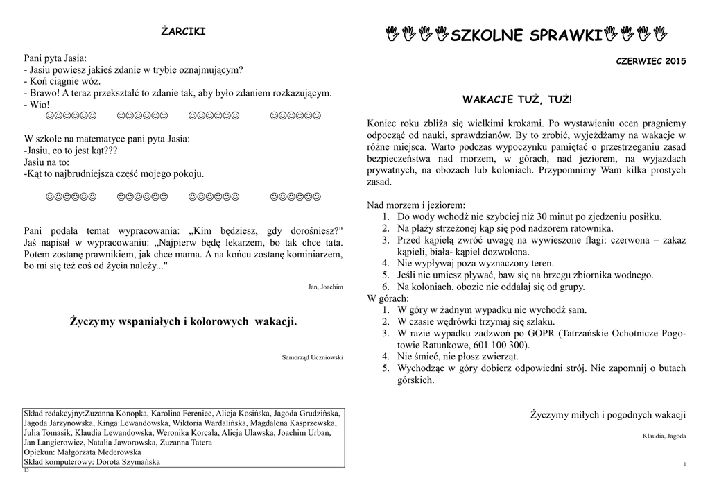 SZKOLNE SPRAWKI ŻARCIKI Pani pyta Jasia: - Jasiu powiesz jakieś zdanie w trybie oznajmującym? - Koń ciągnie wóz. - Brawo! A teraz przekształć to zdanie tak, aby było zdaniem rozkazującym. - Wio! W szkole na matematyce pani pyta Jasia: -Jasiu, co to jest kąt??? Jasiu na to: -Kąt to najbrudniejsza część mojego pokoju. Pani podała temat wypracowania: „Kim będziesz, gdy dorośniesz?" Jaś napisał w wypracowaniu: „Najpierw będę lekarzem, bo tak chce tata. Potem zostanę prawnikiem, jak chce mama. A na końcu zostanę kominiarzem, bo mi się też coś od życia należy..." Jan, Joachim Życzymy wspaniałych i kolorowych wakacji. Samorząd Uczniowski Skład redakcyjny:Zuzanna Konopka, Karolina Fereniec, Alicja Kosińska, Jagoda Grudzińska, Jagoda Jarzynowska, Kinga Lewandowska, Wiktoria Wardalińska, Magdalena Kasprzewska, Julia Tomasik, Klaudia Lewandowska, Weronika Korcala, Alicja Ulawska, Joachim Urban, Jan Langierowicz, Natalia Jaworowska, Zuzanna Tatera Opiekun: Małgorzata Mederowska Skład komputerowy: Dorota Szymańska 13 CZERWIEC 2015 WAKACJE TUŻ, TUŻ! Koniec roku zbliża się wielkimi krokami. Po wystawieniu ocen pragniemy odpocząć od nauki, sprawdzianów. By to zrobić, wyjeżdżamy na wakacje w różne miejsca. Warto podczas wypoczynku pamiętać o przestrzeganiu zasad bezpieczeństwa nad morzem, w górach, nad jeziorem, na wyjazdach prywatnych, na obozach lub koloniach. Przypomnimy Wam kilka prostych zasad. Nad morzem i jeziorem: 1. Do wody wchodź nie szybciej niż 30 minut po zjedzeniu posiłku. 2. Na plaży strzeżonej kąp się pod nadzorem ratownika. 3. Przed kąpielą zwróć uwagę na wywieszone flagi: czerwona – zakaz kąpieli, biała- kąpiel dozwolona. 4. Nie wypływaj poza wyznaczony teren. 5. Jeśli nie umiesz pływać, baw się na brzegu zbiornika wodnego. 6. Na koloniach, obozie nie oddalaj się od grupy. W górach: 1. W góry w żadnym wypadku nie wychodź sam. 2. W czasie wędrówki trzymaj się szlaku. 3. W razie wypadku zadzwoń po GOPR (Tatrzańskie Ochotnicze Pogotowie Ratunkowe, 601 100 300). 4. Nie śmieć, nie płosz zwierząt. 5. Wychodząc w góry dobierz odpowiedni strój. Nie zapomnij o butach górskich. Życzymy miłych i pogodnych wakacji Klaudia, Jagoda 1 WYWIAD HOROSKOP Niedługo Dzień Ojca. Z tej okazji zamieszczamy wywiad, który przeprowadziła ze swoim tatą, panem Tomaszem Grudzińskim, nasza redakcyjna koleżanka, Jagoda. - Jak się Pan czuje jako ojciec? - Doskonale, jestem szczęśliwy, że mam dwie wspaniałe córki. - Czy bycie ojcem wymaga wielkiej odpowiedzialności? - Odpowiedzialność rodzica jest bardzo duża, każdy rodzic stara się wychować swoje dziecko jak najlepiej. - Jaki prezent na Dzień Ojca według Pana najbardziej ucieszy każdego tatę? - Każdy prezent, który będzie szczery i dany od serca. - Czy pomoc dziecku jest trudna? - Dziecko się rozwija i im starsze dziecko, tym większe problemy. Są problemy łatwiejsze i trudniejsze i ze wszystkimi trzeba sobie radzić tak, aby pomóc dziecku. - Jakiej pomocy oczekuje Pan od dzieci? - Pomoc potrzebna jest w różnych sytuacjach. Dobrze jest, gdy dziecko włączy się do pomocy przy codziennych obowiązkach domowych. - Dziękuję Panu za udzielenie wywiadu. - Miło mi było udzielić tego krótkiego wywiadu. Jagoda LEW (23.07. – 23.08.) Przyjaźń: masz wokół siebie przyjaciół, na których możesz liczyć. Szkoła: ucz się pilnie do końca roku szkolnego. UWAŻAJ: omijaj czarne koty. Szczęśliwe dni: 30 lipca, 7 sierpnia. Porada miesiąca: nie przesadzaj z jedzeniem słodyczy. PANNA (24.08. – 22.09.) Przyjaźń: poznasz prawdziwego przyjaciela. Szkoła: sukces przyjdzie, ale będzie cię kosztować. UWAŻAJ: na nierówną kostkę brukową. Szczęśliwe dni: 27 sierpnia, 1 września. Porada miesiąca: kup sobie japonki, najlepiej niebieskie, bo odstraszają owady. Weronika, Alicja 2 12 POMYSŁ NA…. PRACE UCZNIÓW Z OKAZJI DNIA PATRONKI SZKOŁY PIZZĘ WIKUSI Składniki: 1 szklanka wody łyżka cukru 25 g drożdży 2 szkl. mąki łyżeczki soli 3 łyżki oliwy koncentrat pomidorowy SPOSÓB PRZYGOTOWANIA: Do mąki, soli i oliwy dodajemy zaczyn (połączenie drożdży, wody, cukru i 2 łyżek mąki w osobnym naczyniu, które po wyrośnięciu dodaje się do mąki i wyrabia ciasto) i zagniatamy ciasto. Na blaszce posmarowanej oliwą rozkładamy ciasto. Ciasto smarujemy koncentratem pomidorowym. Na koncentrat kładziemy szynkę lub salami. Na wędlinę wysypujemy pokrojone pieczarki i pomidory (mogą też być bakłażany). Na całość rozkładamy ser. Wkładamy do piekarnika na 15 minut. Pieczemy w 200 stopniach. Smacznego! Wiktoria, Kinga 11 Nasza patronka w Rogowie się urodziła, ale później dzieci w Toruniu na Wrzosach uczyła. Przez Niemców w 1939 roku rozstrzelana została, ale pamięć o niej w szkole pozostała. Stanisława Jaworska patriotyzmu uczyła i miłość do Ojczyzny wielką żywiła, dlatego w sercach uczniów ją zaszczepiła. Mimo że Patronki nie ma już z nami, to dla niej się staramy. Piszemy, czytamy, oceny zbieramy i Polskę kochamy. Odnowiony sztandar w szkole z szacunkiem witamy, przy obelisku ku czci bohaterki kwiaty składamy. Nasi harcerze o niej pamiętają, przy ognisku ją wspominają. Stanisława Jaworska zawsze w naszych sercach i głowach będzie! Maria, Wanessa, Ania Toruń,08.05.2015r. Droga Pani Stanisławo! Dnia 8 maja obchodzimy święto na cześć naszej patronki, czyli Pani, Stanisławo. Chcemy w tym liście opowiedzieć o naszej szkole. Szkoła jest kolorowa (żółta, zielona i beżowa). Klasy I - III mają elektroniczne tablice, klasy IV - VI mają tablice, po których piszą kredą. W szkole jest świetlica, biblioteka, stołówka, są cztery sale gimnastyczne. Mamy też boisko do koszykówki i do piłki nożnej. Uczymy się między innymi przyrody, języka polskiego, matematyki, religii, języka angielskiego i WF-u. Po lekcjach bierzemy udział w zajęciach pozalekcyjnych, np. chodzimy 