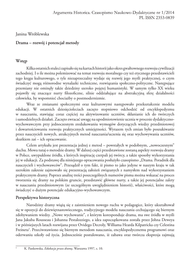Janina Wróblewska Drama – rozwój i potencjał metody Wstęp Kilka ostatnich stuleci zapisało się na kartach historii jako okres gwałtownego rozwoju cywilizacji zachodniej. I o ile można polemizować na temat rozwoju moralnego czy też etycznego przedstawicieli tego kręgu kulturowego, o tyle niezaprzeczalny wydaje się rozwój jego myśli praktycznej, o czym świadczyć mogą różnorodne wynalazki techniczne, rozwiązania społeczno-polityczne. Następujące przemiany nie ominęły także dziedziny szeroko pojętej humanistyki. W samym tylko XX wieku pojawiły się znaczące nurty filozoficzne, silnie oddziałujące na abstrakcyjną sferę działalności człowieka, by wspomnieć chociażby o postmodernizmie. Wraz ze zmianami społecznymi oraz kulturowymi następowało przekształcenie modelu edukacji. W ostatnich dziesięcioleciach zaczęto stopniowo odchodzić od encyklopedyzmu w nauczaniu, stawiając coraz częściej na aktywizowanie uczniów, skłanianie ich do twórczych i samodzielnych działań. Zaczęto zwracać uwagę na upodmiotowienie ucznia w procesie dydaktycznowychowawczym przy jednoczesnym zredukowaniu wymogów dotyczących wiedzy przedmiotowej i dowartościowaniu rozwoju praktycznych umiejętności. Wyrazem tych zmian było poszukiwanie przez nauczycieli nowych, atrakcyjnych metod nauczania/uczenia się oraz wychowywania uczniów, skutkiem zaś – ich opracowanie. Celem artykułu jest prezentacja jednej z metod – powstałych w podobnym, „nowoczesnym” duchu. Mowa tutaj o metodzie dramy. W dalszej części przedstawione zostaną aspekty rozwoju dramy w Polsce, uwypuklone źródła, z których inspirację czerpali jej twórcy, a także sposoby wykorzystania jej w edukacji. Za podstawę dla niniejszego opracowania posłużyło czasopismo „Drama. Poradnik dla nauczycieli i wychowawców”. Przesądził o tym fakt, iż pismo to jako jedyne w naszym kraju w tak szerokim zakresie zajmowało się prezentacją założeń związanych z namysłem nad wykorzystaniem praktycznym dramy. Poprzez analizę treści poszczególnych numerów pisma można wskazać na proces tworzenia się dramy na polskim gruncie, przedstawić główne nurty, a także jej potencjalne zalety w nauczaniu przedmiotowym (ze szczególnym uwzględnieniem historii), właściwości, które mogą świadczyć o dużym potencjale edukacyjno-wychowawczym. Perspektywa historyczna Narodziny dramy wiążą się z zaistnieniem nowego ruchu w pedagogice, który ukształtował się w opozycji do dziewiętnastowiecznego, tradycyjnego modelu nauczania cechującego się biernym zdobywaniem wiedzy. „Nowe wychowanie”, z którym koresponduje drama, ma swe źródła w myśli Jana Jakuba Rousseau i Johanna Pestalozziego, a idea zapoczątkowana została przez Johna Deweya i w późniejszych latach rozwijana przez Ovidego Decroly, Williama Hearda Kilpatricka czy Celestina Freineta1. Przeciwstawiono się biernym metodom nauczania, encyklopedycznemu programowi oraz oderwaniu szkoły od życia. Jednocześnie postulowano, iż zabawa oraz twórcza ekspresja zajmują 1 K. Pankowska, Edukacja przez dramę, Warszawa 1997, s. 10. 162 Janina Wróblewska ważne miejsce w procesie uczenia się, a zasady, treści i metody kształcenia powinny być zależne od właściwości psychicznych dziecka, jego potrzeb i zainteresowań. Według Deweya w szkole uczniowie powinni rozwijać naturalną zdolność do nabywania doświadczeń przez działanie, rozwój ten miały umożliwiać samodzielne poszukiwania pod kierunkiem nauczyciela2. Założenia nowego wychowania były bardzo bliskie koncepcji dramy, która wyrosła z praktyki edukacyjnej, a rozwinęła się głównie w Wielkiej Brytanii. Na przełomie XIX i XX wieku w Anglii podjęto pierwsze próby wykorzystania jej w szkole. Prekursorami dramy byli: Caldwell Cook, Peter Slade oraz Edgar Burton, a w Stanach Zjednoczonych jej propagatorką była Winifred Ward3. Caldwell Cook, autor pierwszej teoretycznej rozprawy na temat dramy The play way (1917), uważał, że aktywność dramowa jest bardzo efektywną metodą uczenia się i może być stosowana w nauczaniu różnych przedmiotów szkolnych, a w szczególności literatury angielskiej, historii oraz języków obcych. Zaznaczał również, iż „podstawą wiedzy nie jest słuchanie i czytanie, lecz działanie, gra i doświadczenie”4. Lata dwudzieste i trzydzieste ubiegłego wieku były okresem eksperymentalnego wykorzystywania dramy w szkołach, a wraz z końcem drugiej wojny światowej wykształciły się dwie koncepcje kształtujące na nowo strukturę działań dramowych. Ich twórcami byli Peter Slade i Edgar J. Burton. Pierwszy z nich uważał, iż drama powinna być odrębnym przedmiotem nauczania, natomiast drugi pojmował ją jako podstawę edukacji, przydatną w nauczaniu przedmiotowym5. Peter Slade tworząc nową metodę pracy skrytykował sposób działania angielskich teatrów szkolnych stawiających sobie za główny cel wystawienie spektaklu. W wydanej w 1954 roku Child drama zaprezentował własną metodę pracy z dziećmi w szkołach6. Książkę poprzedzała publikacja Petera Stone’a z 1950 roku The story of a school, przedstawiająca organizację nauki w szkole dla dzieci w wieku 5-7 lat zgodnie z zasadami nauczania przez dramę7. Ogromną rolę w rozpowszechnianiu dramy odegrał Brian Way. Jego publikacja Development through drama z 1967 roku stała się i nadal pozostaje inspiracją i przewodnikiem dramy. Założeniem jego koncepcji jest stwierdzenie, iż proces kształcenia wymaga zaangażowania wszystkich zmysłów człowieka – wzroku, słuchu, smaku, węchu i dotyku, a podstawą są umiejętności koncentracji. Podejście klasyka dramy doskonale oddaje sformułowanie: „podstawową definicją dramy mogłoby być po prostu »ćwiczenie życia«”8. Zarówno Way, jak i Slade byli orędownikami stosowania technik teatralnych nie jako formy popisywania się dziecka przed publicznością, lecz w celu zaktywiz