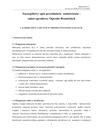 Załącznik nr 2 do siwz nr DGK-IV.271.24.2016 Szczegółowy opis przedmiotu zamówienia salon ogrodowy Ogrodu Branickich I. ZAKRES PRAC UJĘTYCH W MIESIĘCZNYCH RYCZAŁTACH. 1. Konserwacja zieleni. 1.1 Pielęgnacja bukszpanu. Bukszpan powinien być w miarę potrzeby nawożony oraz poddawany opryskom grzybobójczym i owadobójczym tak aby utrzymać rośliny w dobrej kondycji. Właściwym wyborem są zarówno nawozy mineralne jak i organiczne. Należy pamiętać o tym, że zbyt mocno skoncentrowany nawóz może uszkodzić płytki system korzeniowy bukszpanu. Dopuszczalne jest nawożenie dolistne. 1.2 Pielęgnacja trawników na terenach płaskich i skarpach. W ramach pielęgnacji należy w szczególności: • podlewać w okresie suszy z wykorzystaniem systemu nawadniania; • dosiewać nasiona traw w miarę potrzeby; • wykonywać wałowanie (czynność należy wykonać, gdy gleba nie jest zbyt mokra i sucha, ale o dobrej plastyczności), • usuwać ślady bieżników opon; • obcinać brzegi trawnika przy alejkach; • rozgarniać ewentualne kretowiska do poziomu terenu. 1.3 Pielęgnacja roślin w bordiurach. Ogólny wygląd estetyczny bordiur powinien być bez zarzutu, a stan roślin – intensywność kwitnienia, widoczny przyrost masy liściowej, rozkrzewienie i sztywność pędów, zdrowy wygląd i właściwa barwa ulistnienia, powinny potwierdzać, że potrzeby roślin w zakresie nawożenia, ochrony fitosanitarnej i zaopatrzenia w wodę są zaspokojone. Wykonawca jest zobowiązany do prowadzenia pielęgnacji roślin w taki sposób, aby w miarę możliwości materiał roślinny gatunków wieloletnich odzyskiwać do nasadzeń w kolejnych 1 Załącznik nr 2 do siwz nr DGK-IV.271.24.2016 latach. Zamawiający zakłada, że w trakcie realizacji umowy pierwsze nasadzenie roślin gatunków bylinowych jest zlecane protokołem konieczności zgodnie z projektem. 1.4 Pielęgnacja stożków grabowych i szpaleru grabowego na granicy z boskietami. Projektowana docelowa wysokość szpaleru to: 6m (wysokość I kondygnacji pałacu). Rozstawa sadzenia grabu: co 40cm. Bieżąca pielęgnacja stożków grabowych i grabów w szpalerze polega na cięciach formujących, zasilaniu nawozami i oprysku środkami grzybobójczymi i owadobójczymi tak aby utrzymać rośliny w dobrej kondycji. Szpaler grabowy nie jest objęty systemem nawadniania i rośnie w bliskim sąsiedztwie starodrzewu, dlatego należy zwrócić szczególną uwagę na systematyczne podlewanie roślin. 1.5 Pielęgnacja roślin oranżeryjnych. Pielęgnacja roślin oranżeryjnych obejmuje zakres wszelkich prac pielęgnacyjnych, które należy wykonać w czasie wystawienia / ekspozycji roślin na terenie salonu ogrodowego oraz w trakcie ich przechowywania poza czasem ekspozycji. Rośliny oranżeryjne należy przechowywać w szklarni w temperaturze do 10oC. Nawożenie oraz zabiegi fitosanitarne należy wykonywać systematycznie w miarę potrzeb. Po okresie przechowywania Zamawiający oceni stan rozwojowy i fitosanitarny roślin oranżeryjnych i zadecyduje o możliwości ich ekspozycji. Wykonawca zobowiązany jest zakupić na własny koszt egzemplarze , które wypadły na skutek zaniedbań pielęgnacyjnych bądź nie zostały zaakceptowane do ekspozycji przez Zamawiającego. 1.6 Nadzór, konserwacja i programowanie systemu nawadniania. Dane techniczne systemu: • elektroniczny sterownik Rain Bird DIALOG+8 • 40 sekcji • czujnik opadu deszczu Rain Bird RSD- BEx • zawór elektromagnetyczny Rain Bird 100 -DV 40szt. • wynurzalna głowica deszczująca Rain Bird 1803 – VAN 252szt. • filtr dyskowy Roberts 2” • dysza Rain Bird MPR 15 EST 48 szt. • dysza Rain Bird MPR 15 SST 16 szt. 2 Załącznik nr 2 do siwz nr DGK-IV.271.24.2016 • linia kroplująca Rain Bird DRIPLINE 5300 m • zestaw kontrolny Rain Bird XCZ-100-PRF 8 szt. • zestaw do nawadniania roślin w donicach DT-025-1000 1szt. Zakres konserwacji: • programowanie programatora w uzgodnieniu z Zamawiającym; • regulacja zraszaczy; • bieżące dostosowanie dawek wody do panujących warunków atmosferycznych, stopnia wilgotności podłoża ,wieku roślin itp. w uzgodnieniu z Zamawiającym; • czyszczenie dysz; • czyszczenie kroplowników; • przegląd techniczny elektrozaworów; • w razie konieczności zmiana położenia zraszaczy; • dbanie o drożność linii kroplujących i ich prawidłowe umiejscowienie; • w miarę konieczności wymiana zniszczonych lub skradzionych elementów (koszt wymiany poszczególnych elementów nie jest kosztem Wykonawcy lecz kosztem Zamawiającego); • parametry wymienianych elementów nie mogą być gorsze aniżeli parametry pierwotne i powinny zapewniać prawidłowe funkcjonowanie całego systemu; • czyszczenie filtrów; • wymiana baterii przy sterownikach i elektrozaworach • skuteczne przygotowanie systemu nawadniania do okresu zimowego wraz z demontażem wymagających tego elementów i ich przechowywaniem; • uruchomienie systemu na wiosnę wraz z przeglądem technicznym; Wykonawca zobowiązany jest do wykonywania prac z częstotliwością i w zakresie warunkującym prawidłowe działanie systemu nawadniania. Wykonawca jest zobowiązany do oddelegowania do obsługi systemu nawadniającego jednego konkretnego pracownika z doświadczeniem w zakresie obsługi systemów nawadniających. W ramach eksploatacji Zamawiający wymaga pełnienia stałego telefonicznego dyżuru (24 godzinna gotowość) przez osobę obsługującą system w celu ewentualnej niezwłocznej reakcji na awarię systemu nawadniającego np. poprzez zamknięcie dopływu wody. Wykonawca zobowiązany jest do natychmiastowego powiadomienia Zamawiającego o zaistniałej awarii . 3 Załącznik nr 2 do siwz nr DGK-IV.271.24.2016 Wykonawca jest zobowiązany do dbałości o czystość i porządek w pomieszczeniu, w którym jest zlokalizowana infrastruktura systemu (pomieszczenie pod Pawilonem pod Orłem). Wykonawca zobowiązany jest do prowadzenia książki obsługi syst