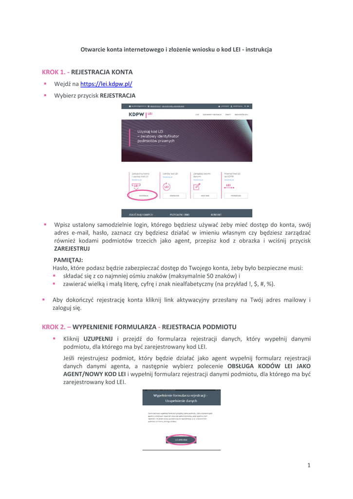 Otwarcie konta internetowego i złożenie wniosku o kod LEI - instrukcja KROK 1. - REJESTRACJA KONTA  Wejdź na https://lei.kdpw.pl/  Wybierz przycisk REJESTRACJA  Wpisz ustalony samodzielnie login, którego będziesz używać żeby mieć dostęp do konta, swój adres e-mail, hasło, zaznacz czy będziesz działać w imieniu własnym czy będziesz zarządzać również kodami podmiotów trzecich jako agent, przepisz kod z obrazka i wciśnij przycisk ZAREJESTRUJ PAMIĘTAJ: Hasło, które podasz będzie zabezpieczać dostęp do Twojego konta, żeby było bezpieczne musi:  składać się z co najmniej ośmiu znaków (maksymalnie 50 znaków) i  zawierać wielką i małą literę, cyfrę i znak niealfabetyczny (na przykład !, $, #, %).  Aby dokończyć rejestrację konta kliknij link aktywacyjny przesłany na Twój adres mailowy i zaloguj się. KROK 2. – WYPEŁNIENIE FORMULARZA - REJESTRACJA PODMIOTU  Kliknij UZUPEŁNIJ i przejdź do formularza rejestracji danych, który wypełnij danymi podmiotu, dla którego ma być zarejestrowany kod LEI. Jeśłi rejestrujesz podmiot, który będzie działać jako agent wypełnij formularz rejestracji danych danymi agenta, a następnie wybierz polecenie OBSŁUGA KODÓW LEI JAKO AGENT/NOWY KOD LEI i wypełnij formularz rejestracji danymi podmiotu, dla którego ma być zarejestrowany kod LEI. 1 PAMIĘTAJ: Do każdego kodu LEI przypisane są dane referencyjne podmiotu, któremu kod został nadany. Dane te muszą być zgodne z właściwymi, publicznymi rejestrami).  Zanim zaczniesz wypełniać formularz przygotuj: 1. dane podmiotu, dla którego zarejstrowany zostanie kod LEI; 2. skan pełnomocnictwa do wystąpienia z wnioskiem o nadanie kodu zgodnie z wzorem KDPW - jeżeli nie jesteś osobą upoważnioną do reprezentacji zgodnie z właściwym rejstrem, a np. pracownikiem podmiotu w imieniu którego działasz.  Jeśli o kod wystepuje agent przygotuj: 1. Dane agenta; 2. dane podmiotu, dla którego zarejstrowany zostanie kod LEI; 2. skan pełnomocnictwa zgodnie z wzorem KDPW - jeżeli nie jesteś osobą upoważnioną do reprezentacji agenta zgodnie z właściwym rejstrem, a np. jego pracownikiem; 4. Pełnomocnictwo szczególne dla agenta zgodnie z wzorem KDPW podpisane przez osoby upoważnione zgodnie z właściwym rejstrem do reprezentacji podmiotu, dla którego zarejstrowany zostanie kod LEI, notarialnie poświadczone, udzielone nie później niż 60 dni przed wystąpieniem o kod LEI.  Poprosimy Cię również o złożenie oświadczenia w sprawie 1. wyrażenia zgody na treść Regulaminu; 2. stwierdzenia, że nie jesteś konsumentem w rozumieniu przepisów ustawy z dnia 23 kwietnia 1964 r. – Kodeks cywilny, a 3. jeśli jesteś osobą fizyczną prowadzącą działalność gospodarczą występującą o kod - oświadczenia wyrażającego zgodę na przetwarzanie danych osobowych.  Formularz zostanie zapisany tylko jeśli poprawnie wypełnisz wszystkie pola. KROK 3. – WNIOSEK O NADANIE KODU LEI  W zakładce OBSŁUGA KODU LEI wybierz polecenie NOWY KOD LEI  Złóż wymagane oświadczenia i WYŚLIJ wniosek. 2  Otrzymasz komunikat, że zlecenie zostało przekazane do weryfikacji, a informację o kolejnych etapach jego realizacji otrzymasz na adres e-mail, który wskazałeś w formularzu. 3