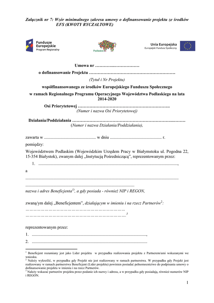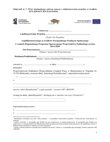 Załącznik nr 7: Wzór minimalnego zakresu umowy o dofinansowanie projektu ze środków EFS (KWOTY RYCZAŁTOWE) Umowa nr ………….……………… o dofinansowanie Projektu …………………………………………………… (Tytuł i Nr Projektu) współfinansowanego ze środków Europejskiego Funduszu Społecznego w ramach Regionalnego Programu Operacyjnego Województwa Podlaskiego na lata 2014-2020 Osi Priorytetowej ………………………………………………………. (Numer i nazwa Osi Priorytetowej) Działania/Poddziałania …………………………………………………………….……… (Numer i nazwa Działania/Poddziałania), zawarta w ................................................ w dniu ................................................ r. pomiędzy: Województwem Podlaskim (Wojewódzkim Urzędem Pracy w Białymstoku ul. Pogodna 22, 15-354 Białystok), zwanym dalej „Instytucją Pośredniczącą”, reprezentowanym przez: 1. ................................................................................................................................., a .............................................................................................................................................. ..................................................................................................... nazwa i adres Beneficjenta1), a gdy posiada - również NIP i REGON, zwaną/ym dalej „Beneficjentem”, działającym w imieniu i na rzecz Partnerów2: …………………………………………………………………… …………………………………………………………………….3 reprezentowanym przez: 1. .........................................................................................................., 2. ........................................................................................................... 1 Beneficjent rozumiany jest jako Lider projektu w przypadku realizowania projektu z Partnerem/ami wskazanymi we wniosku. 2 Należy wykreślić, w przypadku gdy Projekt nie jest realizowany w ramach partnerstwa. W przypadku gdy Projekt jest realizowany w ramach partnerstwa Beneficjent (Lider projektu) powinien posiadać pełnomocnictwo do podpisania umowy o dofinansowanie projektu w imieniu i na rzecz Partnerów. 3 Należy wskazać partnerów projektu przez podanie ich nazwy i adresu, a w przypadku gdy posiadają, również numerów NIP i REGON. 1 Działając na podstawie art. 41 ust. 2 pkt 4 ustawy z dnia 5 czerwca 1998 r. o samorządzie województwa, w związku z art. 9 ust. 2 pkt 3 ustawy z dnia 11 lipca 2014 r. o zasadach realizacji programów w zakresie polityki spójności finansowanych w perspektywie finansowej 2014–2020, Strony postanawiają, co następuje: Przepisy ogólne, przedmiot umowy §1 Pojęcia użyte w treści niniejszej Umowy (zwanej dalej Umową), należy rozumieć w sposób określony w „Ogólnych warunkach umów o dofinansowanie projektów ze środków Europejskiego Funduszu Społecznego w ramach Regionalnego Programu Operacyjnego Województwa Podlaskiego na lata 2014-2020”, (zwanych dalej OWU), stanowiących Załącznik nr 1 do niniejszej Umowy. §2 1. Na warunkach określonych w Umowie, Instytucja Pośrednicząca przyznaje Beneficjentowi dofinansowanie na realizację Projektu w łącznej kwocie nieprzekraczającej ................... PLN (słownie: …) i stanowiącej nie więcej niż …… % całkowitych wydatków kwalifikowalnych Projektu, w tym: 1) płatność ze środków europejskich w kwocie … zł (słownie …), co stanowi …% całkowitych wydatków kwalifikowalnych; 2) dotacja celowa z budżetu Państwa w kwocie … zł (słownie …), co stanowi …% całkowitych wydatków kwalifikowalnych. 2. Całkowita wartość projektu wynosi ………………………zł (słownie …). 3. Dofinansowanie, o którym mowa w ust. 1 na realizację Projektu jest wypłacane w formie zaliczki w wysokości określonej w Harmonogramie płatności stanowiącym Załącznik nr 2 do Umowy, z zastrzeżeniem regulacji zawartych w dziale „Rozliczenie i płatności” „Ogólnych warunkach umów o dofinansowanie projektów ze środków Europejskiego Funduszu Społecznego w ramach Regionalnego Programu Operacyjnego Województwa Podlaskiego na lata 2014-2020”. W szczególnie uzasadnionych przypadkach dofinansowanie może być wypłacane w formie refundacji kosztów poniesionych przez beneficjenta. 4. Transze dofinansowania wynikające z Harmonogramu płatności są przekazywane na następujący rachunek bankowy Beneficjenta: Nazwa właściciela rachunku bankowego: …………………………………………………………………………………. Nr rachunku bankowego: ………………………………………………………………………………………………….. 1. 2. §3 Beneficjent zobowiązuje się do realizacji Projektu na podstawie Wniosku o dofinansowanie, stanowiącego Załącznik nr 3 do Umowy. W przypadku dokonania zmian w Projekcie, Beneficjent zobowiązuje się do realizacji Projektu zgodnie z aktualnym wnioskiem. Beneficjent oświadcza, że zapoznał się z treścią Wytycznych w zakresie kwalifikowalności wydatków w ramach Europejskiego Funduszu Rozwoju Regionalnego, Europejskiego Funduszu Społecznego oraz Funduszu Spójności na lata 2014-2020, zwanymi dalej Wytycznymi w zakresie kwalifikowalności, opublikowanych na stronie internetowej Instytucji Pośredniczącej http://wupbialystok.praca.gov.pl, stronie internetowej IZ RPOWP www.rpo.wrotapodlasia.pl oraz Portalu. Instytucja Pośrednicząca zobowiązuje 2 3. 1. 2. 3. 4. 5. się powiadomić Beneficjenta o wszelkich zmianach przedmiotowych Wytycznych za pośrednictwem systemu SL2014 lub mailowo. Przy wydatkowaniu środków przyznanych w ramach projektu Beneficjent zobowiązuje się stosować aktualnie obowiązującą treść Wytycznych w zakresie kwalifikowalności o których mowa 