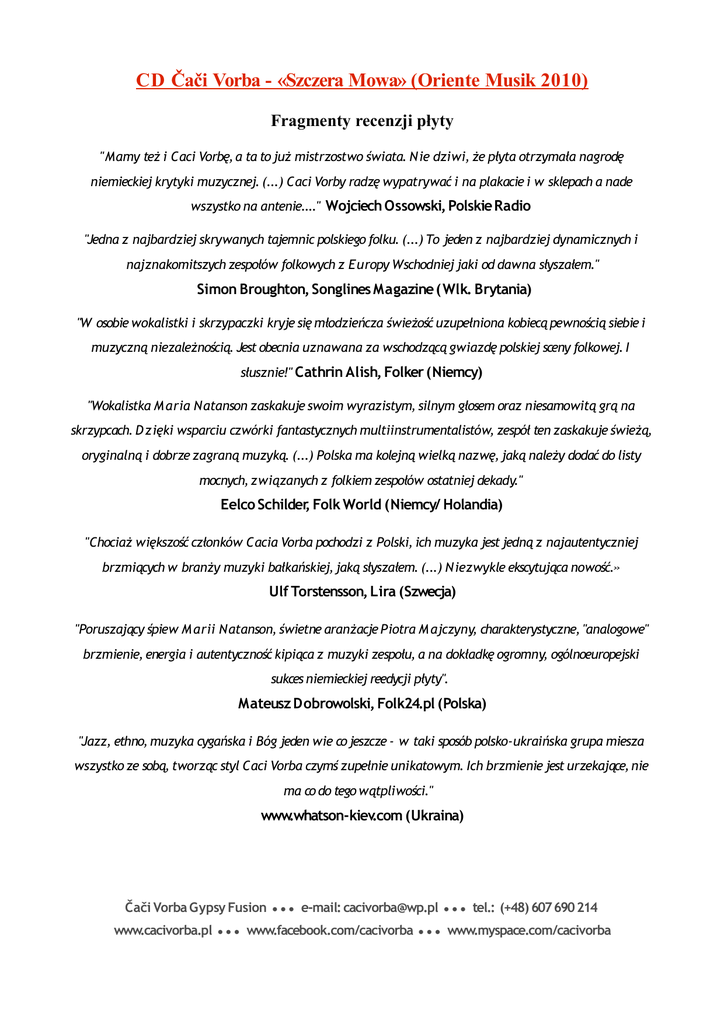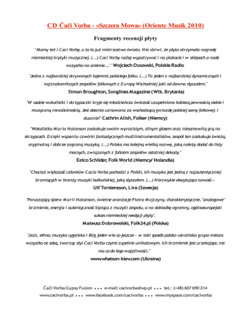 CD Čači Vorba - «Szczera Mowa» (Oriente Musik 2010) Fragmenty recenzji płyty "Mamy też i Caci Vorbę, a ta to już mistrzostwo świata. N ie dziwi, że płyta otrzymała nagrodę niemieckiej krytyki muzycznej. (...) Caci Vorby radzę wypatrywać i na plakacie i w sklepach a nade wszystko na antenie...." Wojciech Ossowski, Polskie Radio "Jedna z najbardziej skrywanych tajemnic polskiego folku. (...) To jeden z najbardziej dynamicznych i najznakomitszych zespołów folkowych z Europy Wschodniej jaki od dawna słyszałem." Simon Broughton, Songlines Magazine ( Wlk. Brytania) "W osobie wokalistki i skrzypaczki kryje się młodzieńcza świeżość uzupełniona kobiecą pewnością siebie i muzyczną niezależnością. Jest obecnia uznawana za wschodzącą gwiazdę polskiej sceny folkowej. I słusznie!" Cathrin Alish, Folker (Niemcy) "Wokalistka M aria Natanson zaskakuje swoim wyrazistym, silnym głosem oraz niesamowitą grą na skrzypcach. D zięki wsparciu czwórki fantastycznych multiinstrumentalistów, zespół ten zaskakuje świeżą, oryginalną i dobrze zagraną muzyką. (...) Polska ma kolejną wielką nazwę, jaką należy dodać do listy mocnych, związanych z folkiem zespołów ostatniej dekady." Eelco Schilder, Folk World (Niemcy/ Holandia) "Chociaż większość członków Cacia Vorba pochodzi z Polski, ich muzyka jest jedną z najautentyczniej brzmiących w branży muzyki bałkańskiej, jaką słyszałem. (...) Niezwykle ekscytująca nowość.» Ulf Torstensson, Lira (Szwecja) "Poruszający śpiew M arii Natanson, świetne aranżacje Piotra M ajczyny, charakterystyczne, "analogowe" brzmienie, energia i autentyczność kipiąca z muzyki zespołu, a na dokładkę ogromny, ogólnoeuropejski sukces niemieckiej reedycji płyty". Mateusz Dobrowolski, Folk24.pl (Polska) "Jazz, ethno, muzyka cygańska i Bóg jeden wie co jeszcze - w taki sposób polsko-ukraińska grupa miesza wszystko ze sobą, tworząc styl Caci Vorba czymś zupełnie unikatowym. Ich brzmienie jest urzekające, nie ma co do tego wątpliwości." www.whatson-kiev.com (Ukraina) Čači Vorba Gypsy Fusion www.cacivorba.pl ●●● ●●● e-mail: [email protected] www.facebook.com/cacivorba ●●● ●●● tel.: (+48) 607 690 214 www.myspace.com/cacivorba