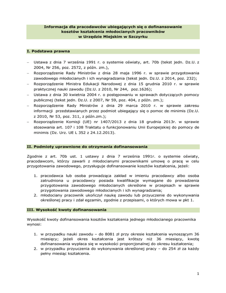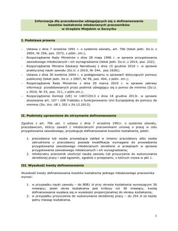 Informacja dla pracodawców ubiegających się o dofinansowanie kosztów kształcenia młodocianych pracowników w Urzędzie Miejskim w Szczyrku I. Podstawa prawna Ustawa z dnia 7 września 1991 r. o systemie oświaty, art. 70b (tekst jedn. Dz.U. z 2004, Nr 256, poz. 2572, z późn. zm.), Rozporządzenie Rady Ministrów z dnia 28 maja 1996 r. w sprawie przygotowania zawodowego młodocianych i ich wynagradzania (tekst jedn. Dz.U. z 2014, poz. 232); Rozporządzenie Ministra Edukacji Narodowej z dnia 15 grudnia 2010 r. w sprawie praktycznej nauki zawodu (Dz.U. z 2010, Nr 244, poz.1626); Ustawa z dnia 30 kwietnia 2004 r. o postępowaniu w sprawach dotyczących pomocy publicznej (tekst jedn. Dz.U. z 2007, Nr 59, poz. 404, z późn. zm.); Rozporządzenie Rady Ministrów z dnia 29 marca 2010 r. w sprawie zakresu informacji przedstawianych przez podmiot ubiegający się o pomoc de minimis (Dz.U. z 2010, Nr 53, poz. 311, z późn.zm.); Rozporządzenie Komisji (UE) nr 1407/2013 z dnia 18 grudnia 2013r. w sprawie stosowania art. 107 i 108 Traktatu o funkcjonowaniu Unii Europejskiej do pomocy de minimis (Dz. Urz. UE L 352 z 24.12.2013). II. Podmioty uprawnione do otrzymania dofinansowania Zgodnie z art. 70b ust. 1 ustawy z dnia 7 września 1991r. o systemie oświaty, pracodawcom, którzy zawarli z młodocianymi pracownikami umowę o pracę w celu przygotowania zawodowego, przysługuje dofinansowanie kosztów kształcenia, jeżeli: 1. pracodawca lub osoba prowadząca zakład w imieniu pracodawcy albo osoba zatrudniona u pracodawcy posiada kwalifikacje wymagane do prowadzenia przygotowania zawodowego młodocianych określone w przepisach w sprawie przygotowania zawodowego młodocianych i ich wynagradzania; 2. młodociany pracownik ukończył naukę zawodu lub przyuczenie do wykonywania określonej pracy i zdał egzamin, zgodnie z przepisami, o których mowa w pkt 1. III. Wysokość kwoty dofinansowania Wysokość kwoty dofinansowania kosztów kształcenia jednego młodocianego pracownika wynosi: 1. w przypadku nauki zawodu – do 8081 zł przy okresie kształcenia wynoszącym 36 miesięcy; jeżeli okres kształcenia jest krótszy niż 36 miesięcy, kwotę dofinansowania wypłaca się w wysokości proporcjonalnej do okresu kształcenia; 2. w przypadku przyuczenia do wykonywania określonej pracy – do 254 zł za każdy pełny miesiąc kształcenia. 1 Kwoty dofinansowania powyżej określone, podlegają waloryzacji wskaźnikiem cen towarów i usług konsumpcyjnych ogółem, jeżeli ten wskaźnik w roku kalendarzowym poprzedzającym rok, w którym następuje wypłata dofinansowania, wynosi co najmniej 105%. W przypadku, jeżeli umowa o pracę w celu przygotowania zawodowego została rozwiązana z przyczyn niezależnych od pracodawcy a młodociany pracownik podjął naukę zawodu na podstawie umowy o pracę w celu przygotowania zawodowego u innego pracodawcy – przysługującą kwotę dofinansowania dzieli się między wszystkich pracodawców, proporcjonalnie do liczby miesięcy prowadzonej przez nich nauki zawodu. Dofinansowanie nie przysługuje temu pracodawcy, z którym umowa o pracę w celu przygotowania zawodowego została rozwiązana z winy pracodawcy. IV. Wymagane dokumenty 1. Wniosek pracodawcy złożony w terminie 3 miesięcy od dnia zdania przez młodocianego pracownika egzaminu zgodnie z przepisami w sprawie przygotowania zawodowego młodocianych i ich wynagradzania. 2. Formularz informacji przedstawianych przy ubieganiu się o pomoc de minimis lub pomocy de minimis. 3. Kopie wszystkich zaświadczeń o pomocy de minimis lub pomocy de minimis w rolnictwie lub rybołówstwie, jakie otrzymał podmiot w roku, w którym ubiega się o pomoc, oraz w ciągu 2 poprzedzających go lat, albo oświadczenie o otrzymanej wielkości pomocy de minimis lub pomocy de minimis w rolnictwie lub rybołówstwie otrzymanej w tym okresie, albo oświadczenie o nieotrzymaniu pomocy de minimis lub pomocy de minimis w rolnictwie lub rybołówstwie w tym okresie. 4. Inne dokumenty/informacje na prośbę organu. W przypadku uzasadnionych wątpliwości, co do treści przedłożonych dokumentów/ informacji, organ ma prawo prosić wnioskodawcę o dodatkowe dokumenty/informacje niezbędne do ich wyjaśnienia. Załączniki: 1. Kopie dokumentów potwierdzających, że pracodawca lub osoba prowadząca zakład w imieniu pracodawcy, albo osoba zatrudniona u pracodawcy posiada kwalifikacje zawodowe i pedagogiczne wymagane do prowadzenia przygotowania zawodowego młodocianych pracowników, a także odpowiedni staż pracy w zawodzie. 2. Kopia umowy o pracę zawarta z młodocianym pracownikiem w celu przygotowania zawodowego. 3. Kopia świadectwa pracy wydanego przez pracodawcę młodocianemu pracownikowi po zakończeniu przygotowania zawodowego lub zaświadczenie pracodawcy potwierdzające okres szkolenia młodocianego pracownika w danym zawodzie. 4. Kopia dokumentu potwierdzającego datę złożenia egzaminu zawodowego przez młodocianego pracownika z wynikiem pozytywnym (dyplom lub świadectwo albo zaświadczenie potwierdzające, że młodociany pracownik ukończył naukę zawodu lub przyuczenie do wykonywania określonej pracy i zdał egzamin). 5. Aktualny wydruk z CEIDG lub wpis z KRS w zależności od formy prowadzonej działalności prowadzonej przez pracodawcę. 2 6. W przypadku, gdy pracodawcą są wspólnicy Spółki Cywilnej, do wniosku powinna być dołączona umowa spółki wraz z jej ewentualnymi aktualizacjami oraz oświadczenie każdego wspólnika o procentowym udziale w spółce. 7. W przypadku miejsca zamieszkania młodocianego pracownika na terenie gminy Szczyrk innego niż miejsce zameldowania – oświadczenie potwierdzające adres zamieszkania młodocianego pracownika na terenie gminy Szczyrk z zamiarem stałego pobytu. Ponadto: 1. W przypadku prowadzenia przygotowania zawodowego młodocianego pracownika przez osobę prowadzącą zakład w imieniu pracodawcy, albo osobę zatrudnioną u pracodawcy - kopie dokument
