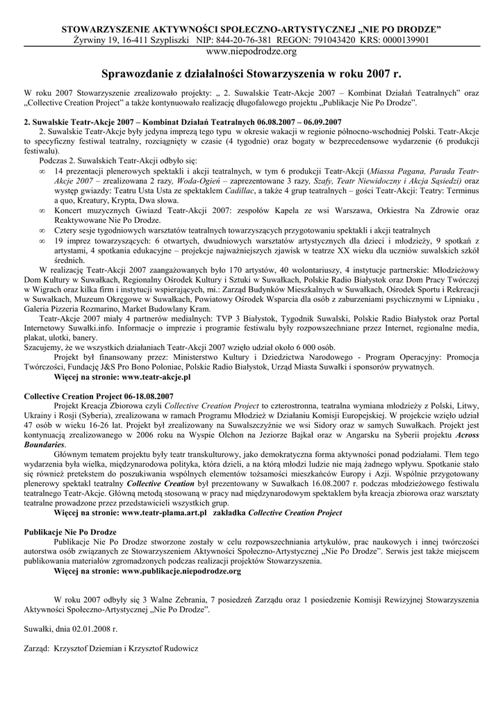 STOWARZYSZENIE AKTYWNOŚCI SPOŁECZNO-ARTYSTYCZNEJ „NIE PO DRODZE” śyrwiny 19, 16-411 Szypliszki NIP: 844-20-76-381 REGON: 791043420 KRS: 0000139901 www.niepodrodze.org Sprawozdanie z działalności Stowarzyszenia w roku 2007 r. W roku 2007 Stowarzyszenie zrealizowało projekty: „ 2. Suwalskie Teatr-Akcje 2007 – Kombinat Działań Teatralnych” oraz „Collective Creation Project” a takŜe kontynuowało realizację długofalowego projektu „Publikacje Nie Po Drodze”. 2. Suwalskie Teatr-Akcje 2007 – Kombinat Działań Teatralnych 06.08.2007 – 06.09.2007 2. Suwalskie Teatr-Akcje były jedyna imprezą tego typu w okresie wakacji w regionie północno-wschodniej Polski. Teatr-Akcje to specyficzny festiwal teatralny, rozciągnięty w czasie (4 tygodnie) oraz bogaty w bezprecedensowe wydarzenie (6 produkcji festiwalu). Podczas 2. Suwalskich Teatr-Akcji odbyło się: • 14 prezentacji plenerowych spektakli i akcji teatralnych, w tym 6 produkcji Teatr-Akcji (Miassa Pagana, Parada TeatrAkcje 2007 – zrealizowana 2 razy, Woda-Ogień – zaprezentowane 3 razy, Szafy, Teatr Niewidoczny i Akcja Sąsiedzi) oraz występ gwiazdy: Teatru Usta Usta ze spektaklem Cadillac, a takŜe 4 grup teatralnych – gości Teatr-Akcji: Teatry: Terminus a quo, Kreatury, Krypta, Dwa słowa. • Koncert muzycznych Gwiazd Teatr-Akcji 2007: zespołów Kapela ze wsi Warszawa, Orkiestra Na Zdrowie oraz Reaktywowane Nie Po Drodze. • Cztery sesje tygodniowych warsztatów teatralnych towarzyszących przygotowaniu spektakli i akcji teatralnych • 19 imprez towarzyszących: 6 otwartych, dwudniowych warsztatów artystycznych dla dzieci i młodzieŜy, 9 spotkań z artystami, 4 spotkania edukacyjne – projekcje najwaŜniejszych zjawisk w teatrze XX wieku dla uczniów suwalskich szkół średnich. W realizację Teatr-Akcji 2007 zaangaŜowanych było 170 artystów, 40 wolontariuszy, 4 instytucje partnerskie: MłodzieŜowy Dom Kultury w Suwałkach, Regionalny Ośrodek Kultury i Sztuki w Suwałkach, Polskie Radio Białystok oraz Dom Pracy Twórczej w Wigrach oraz kilka firm i instytucji wspierających, mi.: Zarząd Budynków Mieszkalnych w Suwałkach, Ośrodek Sportu i Rekreacji w Suwałkach, Muzeum Okręgowe w Suwałkach, Powiatowy Ośrodek Wsparcia dla osób z zaburzeniami psychicznymi w Lipniaku , Galeria Pizzeria Rozmarino, Market Budowlany Kram. Teatr-Akcje 2007 miały 4 partnerów medialnych: TVP 3 Białystok, Tygodnik Suwalski, Polskie Radio Białystok oraz Portal Internetowy Suwałki.info. Informacje o imprezie i programie festiwalu były rozpowszechniane przez Internet, regionalne media, plakat, ulotki, banery. Szacujemy, Ŝe we wszystkich działaniach Teatr-Akcji 2007 wzięło udział około 6 000 osób. Projekt był finansowany przez: Ministerstwo Kultury i Dziedzictwa Narodowego - Program Operacyjny: Promocja Twórczości, Fundację J&S Pro Bono Poloniae, Polskie Radio Białystok, Urząd Miasta Suwałki i sponsorów prywatnych. Więcej na stronie: www.teatr-akcje.pl Collective Creation Project 06-18.08.2007 Projekt Kreacja Zbiorowa czyli Collective Creation Project to czterostronna, teatralna wymiana młodzieŜy z Polski, Litwy, Ukrainy i Rosji (Syberia), zrealizowana w ramach Programu MłodzieŜ w Działaniu Komisji Europejskiej. W projekcie wzięło udział 47 osób w wieku 16-26 lat. Projekt był zrealizowany na Suwalszczyźnie we wsi Sidory oraz w samych Suwałkach. Projekt jest kontynuacją zrealizowanego w 2006 roku na Wyspie Olchon na Jeziorze Bajkał oraz w Angarsku na Syberii projektu Across Boundaries. Głównym tematem projektu były teatr transkulturowy, jako demokratyczna forma aktywności ponad podziałami. Tłem tego wydarzenia była wielka, międzynarodowa polityka, która dzieli, a na którą młodzi ludzie nie mają Ŝadnego wpływu. Spotkanie stało się równieŜ pretekstem do poszukiwania wspólnych elementów toŜsamości mieszkańców Europy i Azji. Wspólnie przygotowany plenerowy spektakl teatralny Collective Creation był prezentowany w Suwałkach 16.08.2007 r. podczas młodzieŜowego festiwalu teatralnego Teatr-Akcje. Główną metodą stosowaną w pracy nad międzynarodowym spektaklem była kreacja zbiorowa oraz warsztaty teatralne prowadzone przez przedstawicieli wszystkich grup. Więcej na stronie: www.teatr-plama.art.pl zakładka Collective Creation Project Publikacje Nie Po Drodze Publikacje Nie Po Drodze stworzone zostały w celu rozpowszechniania artykułów, prac naukowych i innej twórczości autorstwa osób związanych ze Stowarzyszeniem Aktywności Społeczno-Artystycznej „Nie Po Drodze”. Serwis jest takŜe miejscem publikowania materiałów zgromadzonych podczas realizacji projektów Stowarzyszenia. Więcej na stronie: www.publikacje.niepodrodze.org W roku 2007 odbyły się 3 Walne Zebrania, 7 posiedzeń Zarządu oraz 1 posiedzenie Komisji Rewizyjnej Stowarzyszenia Aktywności Społeczno-Artystycznej „Nie Po Drodze”. Suwałki, dnia 02.01.2008 r. Zarząd: Krzysztof Dziemian i Krzysztof Rudowicz