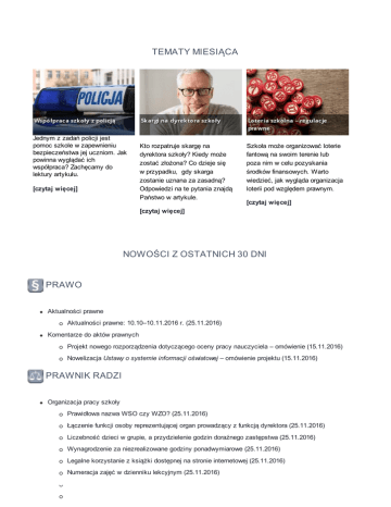 TEMA TY MIESIĄCA Jednym z zadań policji jest pomoc szkole w zapewnieniu bezpieczeństwa jej uczniom. Jak powinna wyglądać ich współpraca? Zachęcamy do lektury artykułu. [czytaj więcej] Kto rozpatruje skargę na dyrektora szkoły? Kiedy może zostać złożona? Co dzieje się w przypadku, gdy skarga zostanie uznana za zasadną? Odpowiedzi na te pytania znajdą Państwo w artykule. Szkoła może organizować loterie fantową na swoim terenie lub poza nim w celu pozyskania środków finansowych. Warto wiedzieć, jak wygląda organizacja loterii pod względem prawnym. [czytaj więcej] [czytaj więcej] NOWOŚCI Z OSTATNICH 30 DNI PRAWO Aktualności prawne Aktualności prawne: 10.10–10.11.2016 r. (25.11.2016) Komentarze do aktów prawnych Projekt nowego rozporządzenia dotyczącego oceny pracy nauczyciela – omówienie (15.11.2016) Nowelizacja Ustawy o systemie informacji oświatowej – omówienie projektu (15.11.2016) PRAWNIK RADZI Organizacja pracy szkoły Prawidłowa nazwa WSO czy WZO? (25.11.2016) Łączenie funkcji osoby reprezentującej organ prowadzący z funkcją dyrektora (25.11.2016) Liczebność dzieci w grupie, a przydzielenie godzin doraźnego zastępstwa (25.11.2016) Wynagrodzenie za niezrealizowane godziny ponadwymiarowe (25.11.2016) Legalne korzystanie z książki dostępnej na stronie internetowej (25.11.2016) Numeracja zajęć w dzienniku lekcyjnym (25.11.2016) Zarządzenie wójta niezgodne z prawem (25.11.2016) Termin przeprowadzenia egzaminu poprawkowego (25.11.2016) Nagrywanie zebrań z rodzicami (25.11.2016) Dokumentacja szkolna Przekazanie wójtowi do kontroli dokumentacji placówki (25.11.2016) Ochrona danych osobowych Korzystanie z dysku w chmurze, a bezpieczeństwo danych (25.11.2016) Uczniowie Wszczęcie postępowania administracyjnego w sprawie skreślenia ucznia z listy uczniów (25.11.2016) Wydanie orzeczenia o nauczaniu indywidualnym na okres krótszy niż 30 dni (25.11.2016) Inne Pociągnięcie do odpowiedzialności byłego dyrektora (25.11.2016) KALENDARIUM Terminarz zadań dyrektora szkoły – styczeń 2017 r. (15.11.2016) ZA RZĄDZA NIE SZKOŁĄ Role dyrektora Loteria szkolna – regulacje prawne (8.12.2016) Oświadczenie o nie zaleganiu z opłatami (8.12.2016) Oświadczenie o niekaralności (8.12.2016) Oświadczenie o przeprowadzeniu loterii fantowej (8.12.2016) Oświadczenie o znajomości przepisów (8.12.2016) Regulamin loterii fantowej (8.12.2016) Wniosek o zezwolenie na przeprowadzenie loterii fantowej (8.12.2016) Zgłoszenie przeprowadzenia małej loterii fantowej (8.12.2016) Zobowiązanie do wypłaty nagród (8.12.2016) Współpraca szkoły z policją (8.12.2016) Propozycja współpracy (8.12.2016) Prośba o pomoc w organizacji zabawy (8.12.2016) Uchylanie uchwał rady pedagogicznej (8.12.2016) Wstrzymanie wykonania uchwały (8.12.2016) Zawiadomienie organu prowadzącego o wstrzymaniu wykonania uchwały (8.12.2016) Zawiadomienie organu sprawującego nadzór pedagogiczny o wstrzymaniu wykonania uchwały (8.12.2016) Współpraca szkoły z kuratorem sądowym (15.11.2016) Prośba o zmianę środka zastosowanego przez sąd (15.11.2016) Obowiązki dyrektora przed zakończeniem roku kalendarzowego (15.11.2016) Organizacja pracy placówki Skargi na dyrektora szkoły (8.12.2016) Zajęcia organizowane przez podmioty zewnętrzne (8.12.2016) Współpraca szkół z firmami (8.12.2016) Innowacje i eksperymenty pedagogiczne (29.11.2016) Zasady otwierania sklepiku szkolnego (25.11.2016) Rola doradcy zawodowego w szkole (15.11.2016) Finanse szkoły Budżet zadaniowy w placówkach oświatowych (29.11.2016) Błędy w sprawozdaniu z planu finansowego (15.11.2016) Realizacja niewykorzystanych środków budżetowych (25.11.2016) Przemówienia okolicznościowe Boże Narodzenie Boże Narodzenie – przemówienie dyrektora liceum (25.11.2016) Boże Narodzenie – przemówienie dyrektora gimnazjum (25.11.2016) Boże Narodzenie – przemówienie dyrektora szkoły podstawowej (25.11.2016) Inne Nadanie imienia szkole – przemówienie dyrektora szkoły ponadgimnazjalnej (29.11.2016) Nadanie imienia szkole – przemówienie dyrektora gimnazjum (29.11.2016) Nadanie imienia szkole – przemówienie dyrektora szkoły podstawowej (29.11.2016) OCHRONA DANYCH OSOBOWYCH Polityka bezpieczeństwa w szkołach (8.12.2016) DOKUMENTACJA SZKOLNA Procedury i instrukcje Ewakuacja próbna w szkole (15.11.2016) Procedura ewakuacji (15.11.2016) Przykładowy protokół z ćwiczeń w zakresie praktycznego sprawdzenia organizacji oraz warunków ewakuacji (15.11.2016) Zawiadomienie o zamiarze przeprowadzenia ewakuacji próbnej (15.11.2016) NAUCZYCIELE Ocena pracy Ocena dorobku zawodowego nauczyciela (8.12.2016) Ocena pracy nauczyciela (1.02.2014) Karta oceny pracy (8.12.2016) Wewnątrzszkolna procedura oceny pracy nauczycieli (8.12.2016) PREZENTY ŚWIĄTECZNE Karta pracy nr 3 – mozaika-kolorowanka (30.11.2016) Karta pracy nr 5 – witrażyk (30.11.2016) Projekty kartek z okazji świąt Bożego Narodzenia (1.12.2016) Życzenia świąteczne dla grona pedagogicznego (30.11.2016) Życzenia świąteczne dla pracowników niepedagogicznych w szkołach (30.11.2016) Życzenia świąteczne dla uczniów (30.11.2016) Życzenia świąteczne dla współpracowników zewnętrznych (30.11.2016) KWADRANS PRZY KAWIE Kwadrans przy kawie 2.12.2016 (2.12.2016) Neurodydaktyka pod lupą (2.12.2016) Trenuj z głową – część 7 (2.12.2016) Jaka jest Twoja rola w zespole? – test (2.12.2016) Indie (2.12.2016) Świat według Sygnału – część 7 (2.12.2016) Test wiedzy na inteligencję językową (2.12.2016) Kwadrans przy kawie 25.11.2016 (25.11.2016) Szkoła na szóstkę (25.11.2016) Trenuj z głową – część 6 (25.11.2016) Prokrastynacja – test (25.11.2016) Chiny (25.11.2016) Świat według Sygnału – część 6 (25.11.2016) Czy grozi Ci wypalenie zawodowe? (25.11.2016) Kwadrans przy kawie 18.11.2016 (18.11.2016) Od błędu do sukcesu (18.11.2016) Trenuj z głową – część 5 (18.11.2016) Ekstra