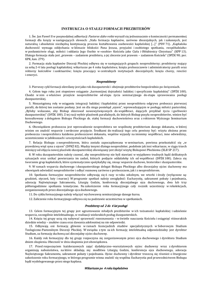 INSTRUKCJA O STAŁEJ FORMACJI PREZBITERÓW 1. Św. Jan Paweł II w posynodalnej adhortacji Pastores dabo vobis wyraził się jednoznacznie o konieczności permanentnej formacji dla księży w następujących słowach: „Stała formacja kapłanów, zarówno diecezjalnych, jak i zakonnych, jest naturalną i absolutnie niezbędną kontynuacją procesu kształtowania osobowości kapłańskiej […]” (PDV 71). „Kapłańska duchowość wymaga oddychania w klimacie bliskości Pana Jezusa, przyjaźni i osobistego spotkania, «współudziału» w posłannictwie sługi, miłości i oddania Jego Osobie w «osobie» Kościoła jako Ciała i Oblubienicy Chrystusa” (KPP 13). Dlatego formacja stała jest „prawem – zadaniem prezbitera, a jej zlecenie jest prawem – zadaniem Kościoła” (DPŻK 90; por. KPK, kan. 279). 2. Formacja stała kapłanów Diecezji Płockiej odbywa się w następujących grupach: neoprezbiterzy; prezbiterzy mający za sobą 2-4 lata posługi kapłańskiej; wikariusze po 4 roku kapłaństwa; księża proboszczowie i administratorzy parafii oraz rektorzy kościołów i sanktuariów; księża pracujący w centralnych instytucjach diecezjalnych; księża chorzy, renciści i emeryci. Neoprezbiterzy 3. Pierwszy cykl formacji określany jest jako rok duszpasterski i obejmuje prezbiterów bezpośrednio po święceniach. 4. Celem tego roku jest stopniowe osiąganie „harmonijnej dojrzałości ludzkiej i specyficznie kapłańskiej” (DPŻK 100). Chodzi w nim o właściwe przejście neoprezbiterów od etapu życia seminaryjnego do etapu sprawowania posługi duszpasterskiej. 5. Niezastąpioną rolę w osiąganiu integracji ludzkiej i kapłańskiej przez neoprezbitera odgrywa proboszcz pierwszej parafii, do której ten zostanie posłany. Jest on dla niego poniekąd „ojcem”, wprowadzającym w posługę miłości pasterskiej. „Byłoby wskazane, aby Biskup skierował nowowyświęconych do współbraci, dających przykład życia i gorliwości duszpasterskiej” (DPŻK 100). Z tej racji wybór placówek parafialnych, do których Biskup posyła neoprezbiterów, winien być konsultowany z delegatem Biskupa Płockiego ds. stałej formacji duchowieństwa oraz z rektorem Wyższego Seminarium Duchownego. 6. Obowiązkiem proboszcza jest wprowadzenie neoprezbitera we wspólnotę prezbiterium danego dekanatu, w której winien on znaleźć wsparcie i serdeczne przyjęcie. Środkami do realizacji tego celu powinny być: wizyta złożona przez proboszcza i neoprezbitera każdemu proboszczowi dekanatu, wspólne wyjazdy na imieniny współbraci, inne odwiedziny, uczestniczenie w jubileuszach i uroczystościach kapłańskich. 7. Relacja Biskupa z neoprezbiterem, która została zapoczątkowana w seminarium, powinna przekształcić się „w prawdziwą więź syna z ojcem” (DPKŻ 82). Między innymi dlatego neoprezbiter, podobnie jak inni wikariusze, w ciągu trzech miesięcy od objęcia nowej placówki duszpasterskiej obowiązany jest złożyć wizytę Biskupowi Płockiemu (XLII SP 217). 8. W roku duszpasterskim należy czuwać, aby neoprezbiterzy nie byli stawiani w wyjątkowo trudnych bądź delikatnych sytuacjach oraz unikać powierzania im zadań, których podjęcie oddalałoby ich od współbraci (DPŻK 100). Zaleca się tworzenie grup kapłańskich, które systematycznie spotykałyby się, niosąc wsparcie duchowe, braterskie i duszpasterskie. 9. W ramach wsparcia duchowego i duszpasterskiego delegat Biskupa Płockiego albo diecezjalny ojciec duchowny ma obowiązek odwiedzić neoprezbiterów i odbyć rozmowę zarówno z proboszczem, jak i z neoprezbiterem. 10. Spotkania formacyjne neoprezbiterów odbywają się 6 razy w roku szkolnym, we wtorki i środy (wyłączone są: grudzień, styczeń, luty i marzec) W programie spotkań należy uwzględnić: Eucharystię, sakrament pokuty i pojednania, adorację Najświętszego Sakramentu, Liturgię Godzin, konferencję diecezjalnego ojca duchownego, dwa lub trzy półtoragodzinne spotkania tematyczne. Na zakończenie roku formacyjnego cały rocznik uczestniczy w rekolekcjach, zorganizowanych przez diecezjalnego ojca duchownego. 11. Do cyklu formacyjnego należy włączyć wychowawcę seminaryjnego danego kursu. 12. Zaliczenie roku formacyjnego odbywa się na podstawie uczestnictwa w spotkaniach. Prezbiterzy od 2 do 4 lat posługi 13. Celem formacyjnym tej grupy jest ugruntowanie młodych prezbiterów w ich tożsamości kapłańskiej i udzielenie wsparcia, szczególnie intelektualnego, w realizacji wielorakich posług duszpasterskich. 14. Księża tej grupy uczą się nabywać sprawność rozeznawania – w świetle nauczania Kościoła i osiągnięć różnorakich dziedzin wiedzy – znaków czasu oraz dawania adekwatnej na nie odpowiedzi. 15. Odbywają oni formację głównie w ramach licencjackich studiów specjalistycznych w Soborowym Studium Teologiczno-Pastoralnym Diecezji Płockiej. W związku z tym za ich formację intelektualną odpowiedzialny jest dyrektor Studium, za formację duchową zaś diecezjalny ojciec duchowny. 16. Każdy rok formacyjny dla tej grupy rozpoczyna się zorganizowanym przez ojca duchownego i dyrektora Studium dniem skupienia. Obecność w dniu skupienia jest obowiązkowa. 17. Przed rozpoczęciem każdorazowych zajęć dydaktyczno–warsztatowych ojciec duchowny wraz z dyrektorem organizują nabożeństwa, na które składają się: modlitwa Liturgią Godzin, konferencja ojca duchownego, adoracja Najświętszego Sakramentu, sakrament pokuty i pojednania. Ojciec duchowny i dyrektor troszczą się również o liturgiczne zakończenie roku formacyjnego, w którego programie winna znaleźć się wspólna Eucharystia pod przewodnictwem Biskupa bądź wydelegowanego przez niego kapłana. Wikariusze po 4 roku kapłaństwa 18. Celem tego cyklu formacji jest ożywienie motywacji posługi kapłańskiej oraz utrwalenie postaw, które znajdą swój wyraz w umiejętności podejmowania odpowiedzialnych zadań z odnowionym za