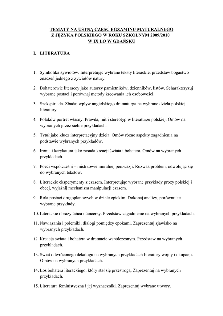 TEMATY NA USTNĄ CZĘŚĆ EGZAMINU MATURALNEGO Z JĘZYKA POLSKIEGO W ROKU SZKOLNYM 2009/2010 W IX LO W GDAŃSKU I. LITERATURA 1. Symbolika żywiołów. Interpretując wybrane teksty literackie, przedstaw bogactwo znaczeń jednego z żywiołów natury. 2. Bohaterowie literaccy jako autorzy pamiętników, dzienników, listów. Scharakteryzuj wybrane postaci i porównaj metody kreowania ich osobowości. 3. Szekspiriada. Zbadaj wpływ angielskiego dramaturga na wybrane dzieła polskiej literatury. 4. Polaków portret własny. Prawda, mit i stereotyp w literaturze polskiej. Omów na wybranych przez siebie przykładach. 5. Tytuł jako klucz interpretacyjny dzieła. Omów różne aspekty zagadnienia na podstawie wybranych przykładów. 6. Ironia i karykatura jako zasada kreacji świata i bohatera. Omów na wybranych przykładach. 7. Poeci współcześni – mistrzowie moralnej perswazji. Rozważ problem, odwołując się do wybranych tekstów. 8. Literackie eksperymenty z czasem. Interpretując wybrane przykłady prozy polskiej i obcej, wyjaśnij mechanizm manipulacji czasem. 9. Rola postaci drugoplanowych w dziele epickim. Dokonaj analizy, porównując wybrane przykłady. 10. Literackie obrazy tańca i tancerzy. Przedstaw zagadnienie na wybranych przykładach. 11. Nawiązania i polemiki, dialogi pomiędzy epokami. Zaprezentuj zjawisko na wybranych przykładach. 12. Kreacja świata i bohatera w dramacie współczesnym. Przedstaw na wybranych przykładach. 13. Świat odwróconego dekalogu na wybranych przykładach literatury wojny i okupacji. Omów na wybranych przykładach. 14. Los bohatera literackiego, który stał się przestrogą. Zaprezentuj na wybranych przykładach. 15. Literatura feministyczna i jej wyznaczniki. Zaprezentuj wybrane utwory. 16. Pieniądze jako wartość i antywartość. Omów na przykładach wybranych utworów literackich. 17. Bohater literacki w środowisku pracy. Omów na wybranych przykładach z literatury dylematy postaci różnych zawodów. 18. Kresy jako pogranicze kultur. Przedstaw zjawisko wielokulturowości na wybranych przykładach literackich. 19. Legenda napoleońska w literaturze polskiej. Omów zagadnienie na przykładzie wybranych utworów. 20. Obraz Litwy w literaturze. Porównaj sposoby ujęcia motywu, odwołując się do wybranych dzieł literackich różnych epok. 21. Opowieść o Hiobie jako inspiracja rozważań o ludzkim losie w utworach literackich różnych epok. Omów zagadnienie na wybranych przykładach. 22. Omów ewolucję liryki erotycznej, odwołując się do przykładów z różnych epok literackich. 23. Topos exegi monumentum w utworach literackich różnych epok. Porównaj sposób przedstawienia oraz poddaj analizie sposób przekształcania motywu. 24. Dialog twórców literatury z filozofami. Odwołując się do różnych epok, przedstaw funkcje, jakie pełnią treści filozoficzne w dziele literackim. 25. Porównaj romantyczną i pozytywistyczną koncepcję patriotyzmu, odwołując się do wybranych utworów literackich. 26. Średniowieczna i renesansowa kultura śmiechu. Porównaj różne ujęcia tego zjawiska w literaturze tych okresów. 27. Motyw więźnia w literaturze. Omów na wybranych przykładach. 28. Obraz kobiety i jego funkcje w literaturze. Omów na wybranych przykładach. 29. Motyw snu w literaturze. Przedstaw na wybranych przykładach. 30. Literatura jako odzwierciedlenie procesu degradacji człowieka. Przedstaw na wybranych przykładach. 31. Motyw jedzenia i jego funkcje w literaturze. Przedstaw na wybranych przykładach. 32. Muzyka w literaturze. Zaprezentuj literackie sposoby opisu dzieł muzycznych i słyszenia dźwięków na wybranych przykładach. II. ZWIĄZKI LITERATURY Z INNYMI DZIEDZINAMI SZTUKI 1. Obrazy Męki Pańskiej w literaturze i sztuce różnych epok. Porównaj wykorzystanie motywu na przestrzeni wieków. 2. Zaświaty w literaturze i innych dziedzinach sztuki. Porównaj sposoby ujęcia motywu na wybranych przykładach. 3. Funkcje rekwizytów i przedmiotów znaczących w literaturze i w teatrze. Dokonaj analizy na wybranych przykładach. 4. Motywy faustyczne w literaturze i sztuce. Zaprezentuj przykłady kulturowych inspiracji i nawiązań do dzieła J.W. Goethego. 5. Kultura średniowieczna źródłem inspiracji dla współczesnej literatury i filmu. Zaprezentuj na wybranych przykładach. 6. Karierowicz w literaturze i filmie. Dokonaj analizy wybranych przykładów. 7. Kostium postaci literackich i malarskich jako źródło wiedzy o człowieku i epoce, w której żył. Przedstaw na przykładach z różnych epok. 8. Nagość pełna znaczeń. Zaprezentuj temat, ilustrując swój wywód przykładami z literatury, malarstwa, fotografii lub filmu. 9. Określ rolę inspiracji malarskich w twórczości wybranego artysty (pisarza lub reżysera). 10. Błazen jako głupiec i jako mędrzec. Zanalizuj różne wizerunki tej postaci w różnych tekstach kultury. 11. Album starych fotografii. Historia rodu zapisana w listach, dokumentach, zdjęciach, wspomnieniach. Zaprezentuj na przykładzie własnej rodziny lub wybranej sagi rodzinnej. 12. Obraz dziecka w literaturze i sztuce. Przedstaw różnorodność funkcjonowania motywu na wybranych przykładach. 13. Horror jako gatunek literacki i filmowy. Przedstaw na wybranych przykładach. 14. Motyw ogrodu w literaturze i sztuce. Przedstaw na wybranych przykładach. 15. Walka dobra ze złem w literaturze i sztuce. Omów na wybranych przykładach. 16. Motyw mogiły w literaturze i sztuce. Omów temat, analizując funkcję motywu w wybranych tekstach kultury. 17. Literackie, malarskie i/lub muzyczne impresje na temat pór roku. Przedstaw zagadnienie na podstawie wybranych tekstów kultury. III.JĘZYK 1. Wykorzystując odpowiednio dobrany materiał literacki, omów funkcje oraz sposoby wprowadzenia języka ezopowego w literaturze. 2. Porównaj żargon uczniowski w wybranych dziełach literackich z żargonem współczesnej młodzieży. 3. Zobrazuj wpływy obce w polskim języku w