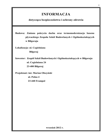 8 INFORMACJA dotycząca bezpieczeństwa i ochrony zdrowia Budowa: Zmiana pokrycia dachu oraz termomodernizacja basenu pływackiego Zespołu Szkół Budowlanych i Ogólnokształcących w Biłgoraju Lokalizacja: ul. Cegielniana Biłgoraj Inwestor: Zespół Szkół Budowlanych i Ogólnokształcących w Biłgoraju ul. Cegielniana 24 23-400 Biłgoraj Projektant: inŜ. Marian Olszyński ul. Polna 4 23-440 Frampol wrzesień 2012 r. 9 ZAKRES ROBÓT Zakres opracowania obejmuje wykonanie zmiany pokrycia dachu oraz termomodernizacji basenu pływackiego Zespołu Szkół Budowlanych i Ogólnokształcących w Biłgoraju. Nowe pokrycie dachu będzie z blachy trapezowej powlekanej. Termomodernizacja obejmuje ocieplenie ścian zewnętrznych i stropodachu oraz wymianę stolarki okiennej i drzwiowej zewnętrznej dotąd nie wymienionej. ISTNIEJĄCE OBIEKTY BUDOWLANE Roboty wykonywane będą w istniejącym budynku basenu pływackiego Zespołu Szkół Budowlanych i Ogólnokształcących w Biłgoraju. 1. KOLEJNOŚĆ WYKONYWANYCH ROBÓT 1.1. Zagospodarowanie placu budowy. 1.2. Roboty budowlano-montaŜowe. 1.3. Roboty wykończeniowe. 1.4. Maszyny i urządzenia techniczne uŜytkowane na placu budowy. 2. INSTRUKTAś PRACOWNIKÓW PRZED PRZYSTĄPIENIEM DO REALIZACJI ROBÓT SZCZEGÓLNIE NIEBEZPIECZNYCH - szkolenie pracowników w zakresie bhp, - zasady postępowania w przypadku wystąpienia zagroŜenia, - zasady bezpośredniego nadzoru nad pracami szczególnie niebezpiecznymi przez wyznaczone w tym celu osoby, - zasady stosowania przez pracowników środków ochrony indywidualnej oraz odzieŜy i obuwia roboczego. 3. ŚRODKI TECHNICZNE NIEBEZPIECZEŃSTWOM I ORGANIZACYJNE WYNIKAJĄCYM Z ZAPOBIEGAJĄCE WYKONYWANIA ROBÓT BUDOWLANYCH. 1.1. Zagospodarowanie placu budowy Zagospodarowanie terenu budowy wykonuje się przed rozpoczęciem robót budowlanych, co najmniej w zakresie: a) ogrodzenia terenu i wyznaczenia stref niebezpiecznych, b) wykonania dróg, wyjść i przejść dla pieszych, c) doprowadzenia energii elektrycznej oraz wody, d) urządzenia pomieszczeń higieniczno-sanitarnych i socjalnych, 10 e) urządzenia składowisk materiałów i wyrobów. Teren budowy lub robót powinien być w miarę potrzeby ogrodzony lub skutecznie zabezpieczony przed osobami postronnymi. Wysokość ogrodzenia powinna wynosić, co najmniej 1,5 m. Dla pojazdów uŜywanych w trakcie wykonywania robót budowlanych naleŜy wyznaczyć i oznakować miejsca postojowe na terenie budowy. Szerokość dróg komunikacyjnych na placu budowy lub robót powinna być dostosowana do uŜywanych środków transportowych. Drogi i ciągi piesze na placu budowy powinny być utrzymane we właściwym stanie technicznym. Nie wolno na nich składować materiałów, sprzętu lub innych przedmiotów. Drogi komunikacyjne dla wózków i taczek oraz pochylnie, po których dokonuje się ręcznego przenoszenia cięŜarów nie powinny mieć spadków większych niŜ 10%. Przejścia i strefy niebezpieczne powinny być oświetlone i oznakowane znakami ostrzegawczymi lub znakami zakazu. Przejścia o pochyleniu większym niŜ 15% naleŜy zaopatrzyć w listwy umocowane poprzecznie, w odstępach nie mniejszych niŜ 0,40 m lub schody o szerokości nie mniejszej niŜ 0,75 m, zabezpieczone, co najmniej z jednej strony balustradą. Balustrada składa się z deski krawęŜnikowej o wysokości 0,15 m i poręczy ochronnej umieszczonej na wysokości 1,10 m. Wolną przestrzeń pomiędzy deską krawęŜnikową a poręczą naleŜy wypełnić w sposób zabezpieczający pracowników przed upadkiem. Strefa niebezpieczna, w której istnieje zagroŜenie spadania z wysokości przedmiotów, powinna być ogrodzona balustradami i oznakowana w sposób uniemoŜliwiający dostęp osobom postronnym. Strefa ta nie moŜe wynosić mniej niŜ 1/10 wysokości, z której mogą spadać przedmioty, lecz nie mniej niŜ 6,0 m. Przejścia, przejazdy i stanowiska pracy w strefie niebezpiecznej powinny być zabezpieczone daszkami ochronnymi. Daszki ochronne powinny znajdować się na wysokości nie mniejszej niŜ 2,4 m nad terenem w najniŜszym miejscu i być nachylone pod kątem 45o w kierunku źródła zagroŜenia. Pokrycie daszków powinno być szczelne i odporne na przebicie przez spadające przedmioty. UŜywanie daszków ochronnych jako rusztowań lub miejsc składowania narzędzi, sprzętu, materiałów jest zabronione. Przewody elektryczne zasilające urządzenia mechaniczne powinny być zabezpieczone przed uszkodzeniami mechanicznymi, a ich połączenia z urządzeniami mechanicznymi wykonane w sposób zapewniający bezpieczeństwo pracy osób obsługujących takie urządzenia. NaleŜy zapewnić dostateczną ilość wody zdatnej do picia pracownikom zatrudnionym na budowie oraz do celów higieniczno-sanitarnych, gospodarczych i przeciwpoŜarowych. 11 Na terenie budowy powinny być urządzone i wydzielone pomieszczenia higieniczno-sanitarne i socjalne: szatnie (na odzieŜ roboczą i ochronną), umywalnie, jadalnie, suszarnie oraz ustępy. Dopuszczalne jest korzystanie z istniejących na terenie budowy pomieszczeń i urządzeń higieniczno-sanitarnych. Na terenie budowy powinny być wyznaczone oznakowane, utwardzone i odwodnione miejsca do składania materiałów i wyrobów. Składowiska materiałów, wyrobów i urządzeń technicznych naleŜy wykonać w sposób wykluczający moŜliwość wywrócenia, zsunięcia, rozsunięcia się lub spadnięcia składowanych wyrobów i urządzeń. Materiały drobnicowe powinny być ułoŜone w stosy o wysokości nie większej niŜ 2,0 m, a stosy materiałów workowanych ułoŜone w warstwach krzyŜowo do wysokości nieprzekraczającej 10 warstw. 1.2. Roboty budowlano-montaŜowe ZagroŜenia występujące przy wykonywaniu robót budowlano-montaŜowych: - upadek pracownika z wysokości, Osoby przebywające na stanowiskach pracy, znajdujące się na wysokości co najmniej 1,0 m od poziomu podłogi lub ziemi, powinny być zabezpieczone balustradą przed upadkiem z wysokości. Prz
