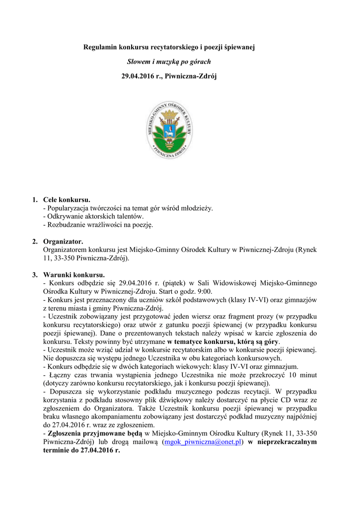 Regulamin konkursu recytatorskiego i poezji śpiewanej Słowem i muzyką po górach 29.04.2016 r., Piwniczna-Zdrój 1. Cele konkursu. - Popularyzacja twórczości na temat gór wśród młodzieży. - Odkrywanie aktorskich talentów. - Rozbudzanie wrażliwości na poezję. 2. Organizator. Organizatorem konkursu jest Miejsko-Gminny Ośrodek Kultury w Piwnicznej-Zdroju (Rynek 11, 33-350 Piwniczna-Zdrój). 3. Warunki konkursu. - Konkurs odbędzie się 29.04.2016 r. (piątek) w Sali Widowiskowej Miejsko-Gminnego Ośrodka Kultury w Piwnicznej-Zdroju. Start o godz. 9:00. - Konkurs jest przeznaczony dla uczniów szkół podstawowych (klasy IV-VI) oraz gimnazjów z terenu miasta i gminy Piwniczna-Zdrój. - Uczestnik zobowiązany jest przygotować jeden wiersz oraz fragment prozy (w przypadku konkursu recytatorskiego) oraz utwór z gatunku poezji śpiewanej (w przypadku konkursu poezji śpiewanej). Dane o prezentowanych tekstach należy wpisać w karcie zgłoszenia do konkursu. Teksty powinny być utrzymane w tematyce konkursu, którą są góry. - Uczestnik może wziąć udział w konkursie recytatorskim albo w konkursie poezji śpiewanej. Nie dopuszcza się występu jednego Uczestnika w obu kategoriach konkursowych. - Konkurs odbędzie się w dwóch kategoriach wiekowych: klasy IV-VI oraz gimnazjum. - Łączny czas trwania wystąpienia jednego Uczestnika nie może przekroczyć 10 minut (dotyczy zarówno konkursu recytatorskiego, jak i konkursu poezji śpiewanej). - Dopuszcza się wykorzystanie podkładu muzycznego podczas recytacji. W przypadku korzystania z podkładu stosowny plik dźwiękowy należy dostarczyć na płycie CD wraz ze zgłoszeniem do Organizatora. Także Uczestnik konkursu poezji śpiewanej w przypadku braku własnego akompaniamentu zobowiązany jest dostarczyć podkład muzyczny najpóźniej do 27.04.2016 r. wraz ze zgłoszeniem. - Zgłoszenia przyjmowane będą w Miejsko-Gminnym Ośrodku Kultury (Rynek 11, 33-350 Piwniczna-Zdrój) lub drogą mailową ([email protected]) w nieprzekraczalnym terminie do 27.04.2016 r. 4. Kategorie konkursowe: a) recytacja b) poezja śpiewana Konkurs odbędzie się w dwóch kategoriach wiekowych: klasy IV-VI oraz gimnazjum. 5. Kryteria oceny: - Ocenie podlegać będą elementy artystyczne, językowe i wizualne. - Dobór repertuaru (dopasowanie tekstu do wieku i płci recytatora, oryginalność wyboru tekstu, dykcja, interpretacja). 6. Nagrody. - Rozstrzygnięcie konkursu i wręczenie nagród nastąpi w dniu konkursu. - Jury przewiduje przyznanie nagród za I, II i III miejsce oraz wyróżnienia. - Każdy Uczestnik konkursu otrzyma pamiątkowy dyplom. 7. Postanowienia końcowe. - Sprawy nieuregulowane niniejszym regulaminem rozstrzyga Organizator.