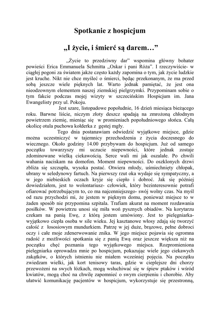 Spotkanie z hospicjum ,,I życie, i śmierć są darem…” ,,Życie to przedziwny dar” wspomina główny bohater powieści Erica Emmanuela Schmitta ,,Oskar i pani Róża”. I rzeczywiście- w ciągłej pogoni za światem jakże często każdy zapomina o tym, jak życie ludzkie jest kruche. Nikt nie chce myśleć o śmierci, będąc przekonanym, że ma przed sobą jeszcze wiele pięknych lat. Warto jednak pamiętać, że jest ona nieodzownym elementem naszej ziemskiej pielgrzymki. Przypominam sobie o tym fakcie podczas mojej wizyty w szczecińskim Hospicjum im. Jana Ewangelisty przy ul. Pokoju. Jest szare, listopadowe popołudnie, 16 dzień miesiąca bieżącego roku. Barwne liście, niczym złoty deszcz spadają na zmrożoną chłodnym powietrzem ziemię, mieniąc się w promieniach popołudniowego słońca. Całą okolicę otula puchowa kołderka z gęstej mgły. Tego dnia postanawiam odwiedzić wyjątkowe miejsce, gdzie można uczestniczyć w tajemnicy przechodzenia z życia doczesnego do wiecznego. Około godziny 14.00 przybywam do hospicjum. Już od samego początku towarzyszy mi uczucie niepewności, które jednak zostaje zdominowane wielką ciekawością. Serce wali mi jak oszalałe. Po chwili wahania naciskam na domofon. Moment niepewności. Do oszklonych drzwi zbliża się szczupła, wysoka postać. Otwiera młody, uśmiechnięty chłopak, ubrany w seledynowy fartuch. Na pierwszy rzut oka wydaje się sympatyczny, a w jego niebieskich oczach kryje się ciepło i dobroć. Jak się później dowiedziałem, jest to wolontariusz- człowiek, który bezinteresownie potrafi ofiarować potrzebującym to, co ma najcenniejszego- swój wolny czas. Na myśl od razu przychodzi mi, że jestem w pięknym domu, ponieważ miejsce to w żaden sposób nie przypomina szpitala. Trafiam akurat na moment rozdawania posiłków. W powietrzu unosi się miła woń pysznych obiadów. Na korytarzu czekam na panią Ewę, z którą jestem umówiony. Jest to pielęgniarkawyjątkowo ciepła osoba w sile wieku. Jej kasztanowe włosy zdają się tworzyć całość z łososiowym mundurkiem. Patrzę w jej duże, brązowe, pełne dobroci oczy i całe moje zdenerwowanie znika. W jego miejsce pojawia się ogromna radość z możliwości spotkania się z panią Ewą oraz jeszcze większa niż na początku chęć poznania tego wyjątkowego miejsca. Rozpromieniona pielęgniarka oprowadza mnie po hospicjum, pokazując wiele jego ciekawych zakątków, o których istnieniu nie miałem wcześniej pojęcia. Na początku zwiedzam wielki, jak kort tenisowy taras, gdzie w cieplejsze dni chorzy przewożeni na swych łóżkach, mogą wsłuchiwać się w śpiew ptaków i wśród kwiatów, mogą choć na chwilę zapomnieć o swym cierpieniu i chorobie. Aby ułatwić komunikację pacjentów w hospicjum, wykorzystuje się przestronną, wygodną windę. Cały czas czuję w sercu satysfakcję z możliwości zobaczenia hospicjum od środka i pogłębienia swego doświadczenia. Następnie z panią Ewą przechodzimy do łazienki, w której, ku mojemu zdziwieniu, znajduje się nowoczesna wanna, przystosowana do mycia podopiecznych, w szczególności tych, którzy o własnych siłach nie mogą już wykonać tej podstawowej czynności. Za zgodą pielęgniarki robię kilka zdjęć. Teraz z panią Ewą wychodzę z powrotem na korytarz. Siadamy na kanapie, gdzie w spokoju możemy kontynuować naszą rozmowę. W pewnym momencie kobieta przyznaje mi się, że czuje się spełniona zawodowo, a świadomość niesienia pomocy bliźniemu daje jej wielką satysfakcję. Pielęgniarka, z wyczuwalną zadumą w głosie wspomina także, że każde odejście pacjenta przeżywa inaczej. - Absolutnie nie można powiedzieć, że dwa zgony są do siebie podobne…tłumaczy .- Przecież każdy człowiek ma swoją jedyną i niepowtarzalną historię. Sens istnienia hospicjum tkwi w zapewnieniu pacjentom komfortu psychicznego i godnej śmierci.- mówi dalej moja rozmówczyni- Należy również pamiętać, że gdy choruje człowiek, razem z nim choruje cała jego rodzina i bliscykomentuje- staramy się przekazać pacjentowi prawdę, jednak nie każdy chory chce ją przyjąć. Dowiaduję się również, że pobyt w hospicjum dla ludzi w ostatniej fazie życia jest nieodpłatny, o czym wcześniej nie wiedziałem. Hospicjum utrzymuje się z datków jednego procenta i akcji ,,Żonkil”. Wiem także, że Gimnazjum nr 12, do którego uczęszczam, również brało udział w tej zaszczytnej akcji. Rozwój placówki wspiera także wielu darczyńców. Jest tam tylko 25 łóżek i długa kolejka oczekujących, dla których miejsce zwalnia się drogą naturalną. Tutaj wiek, wiara, status społeczny nie mają najmniejszego znaczenia. Liczy się tylko człowiek z całą swoją godnością i dostojeństwem. Opiekę paliatywną w hospicjum świadczy się pacjentom, którzy zakończyli wszelkie leczenie. W trakcie rozmowy z panią Ewą moją uwagę przykuwają kolorowe prace plastyczne, które ozdabiają pastelowe ściany korytarza i nadają wyjątkowy charakter temu miejscu. Zaciekawiony tajemniczością obrazów, pytam pielęgniarkę o źródło ich pochodzenia. - To są prace pacjentów, którzy pragnęli zostawić tu cząstkę siebie- tłumaczy. Nagle ogarnia mnie smutek, któremu towarzyszy zaduma. Myślę, że to fascynujące, że historię całego życia człowieka, magię każdej najdrobniejszej chwili, można wyrazić w jednym obrazie. Niezwykłość tego zjawiska tkwi we wspomnieniach, które powracają za każdym razem, gdy spojrzy się na dzieło człowieka, którego już nie ma. Jedna z podopiecznych postanowiła przed odejściem zasadzić na podwórzu świerk, by wszyscy uczestnicy ostatnich chwil jej życia ciepło ją wspominali. Dowiaduję się również, że bardzo ważnym wydarzeniem w domu ulgi w cierpieniu jest obchodzona wspólnie z chorymi wigilia Bożego Narodzenia. W pewnym momencie panią Ewę wzywają obowiązki. Zostaję na beżowej, aksamitnej kanap