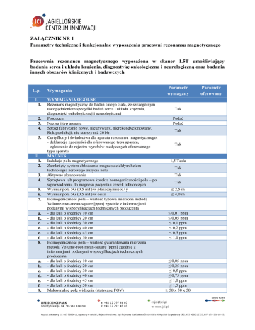 ZAŁĄCZNIK NR 1 Parametry techniczne i funkcjonalne wyposażenia pracowni rezonansu magnetycznego Pracownia rezonansu magnetycznego wyposażona w skaner 1.5T umożliwiający badania serca i układu krążenia, diagnostykę onkologiczną i neurologiczną oraz badania innych obszarów klinicznych i badawczych L.p. I. 1. 2. 3. 4. 5. II. 1. 2. 3. 4. 5. 6. 7. a. b. c. d. e. f. 8. a. b. c. d. e. f. 9. Wymagania WYMAGANIA OGÓLNE Rezonans magnetyczny do badań całego ciała, ze szczególnym uwzględnieniem specyfiki badań serca i układu krążenia, diagnostyki onkologicznej i neurologicznej Producent Nazwa i typ aparatu Sprzęt fabrycznie nowy, nieużywany, nierekondycjonowany. Rok produkcji: nie starszy niż 2014r. Certyfikaty i świadectwa dla aparatu rezonansu magnetycznego: - deklaracja zgodności dla oferowanego typu aparatu, - zgłoszenie do rejestru wyrobów medycznych oferowanego typu aparatu MAGNES: Indukcja pola magnetycznego Zamknięty system chłodzenia magnesu ciekłym helem technologia zerowego zużycia helu Aktywne ekranowanie Sprzętowa lub programowa korekta homogeniczności pola – po wprowadzeniu do magnesu pacjenta i cewek odbiorczych Wymiar pola 5G (0,5 mT) w płaszczyźnie x / y Wymiar pola 5G (0,5 mT) w osi z Homogeniczność pola – wartość typowa mierzona metodą Volume-root-mean-square [ppm] zgodnie z informacjami podanymi w specyfikacjach technicznych producenta - dla kuli o średnicy 10 cm - dla kuli o średnicy 20 cm - dla kuli o średnicy 30 cm - dla kuli o średnicy 40 cm - dla kuli o średnicy 45 cm - dla kuli o średnicy 50 cm Homogeniczność pola – wartość gwarantowana mierzona metodą Volume-root-mean-square [ppm] zgodnie z informacjami podanymi w specyfikacjach technicznych producenta - dla kuli o średnicy 10 cm - dla kuli o średnicy 20 cm - dla kuli o średnicy 30 cm - dla kuli o średnicy 40 cm - dla kuli o średnicy 45 cm - dla kuli o średnicy 50 cm Maksymalne pole widzenia (statyczne FOV) Parametr wymagany Parametr oferowany Tak Podać Podać Tak Tak 1,5 Tesla Tak Tak Tak ≤ 2,5 m ≤ 4,0 m ≤ 0,01 ppm ≤ 0,05 ppm ≤ 0,1 ppm ≤ 0,2 ppm ≤ 0,5 ppm ≤ 1,0 ppm ≤ 0,05 ppm ≤ 0,25 ppm ≤ 0,5 ppm ≤ 0,75 ppm ≤ 1,0 ppm ≤ 1,5 ppm ≥ 50 x 50 x 50 Strona 1 z 11 cm (x, y, z) III. 1. 2. 3. IV. 1. 2. 3. 4. 5. 6. 7. 8. V. 1. 2. 3. 4. 5. 6. 7. 8. 9. SYSTEM GRADIENTOWY: Maksymalna amplituda gradientów w każdej osi (x, y, z) jednocześnie - z osobna w tym samym czasie dla pełnego obszaru badania Maksymalny slew rate gradientów w każdej osi jednocześnie dla amplitudy podanej w punkcie powyżej Powyższe wartości muszą być uzyskiwane jednoczasowo i dla max. statycznego FOV SYSTEM RF: Moc wyjściowa wzmacniacza Dynamika odbiornika (z automatyczną kontrolą) Rozdzielczość odbiornika Szerokość pasma przenoszenia (receive bandwidth) Tor radiowy zbudowany w oparciu o technologię umożliwiającą zintegrowaną pracę cewek W pełni cyfrowa transmisja sygnału nadawczego (Tx) pomiędzy maszynownią a pomieszczeniem magnesu W pełni cyfrowa transmisja sygnału odbiorczego (Rx) pomiędzy pomieszczeniem magnesu a maszynownią zapewniająca zmniejszenie zaszumienia sygnału i wzrost SNR Liczba jednoczesnych, równoległych kanałów odbiorczych z pełną ścieżką cyfrową o rzeczywistym zastosowaniu praktycznym (możliwych do wykorzystania w maksymalnym polu widzenia). Pełna ścieżka cyfrowa tj. linia zawierająca: wzmacniacz, przetwornik analogowo-cyfrowy, rekonstruktor CEWKI WIELOKANAŁOWE / MATRYCE OBRAZUJĄCE Cewka wielokanałowa typu matrycowego przeznaczona do badań głowy, posiadająca w badanym obszarze min. 16 elementów pomiarowych obrazujących jednocześnie i pozwalająca na akwizycje równoległe, kompatybilna ze spektroskopią - rozwiązanie dedykowane Cewka wielokanałowa typu matrycowego lub zestaw cewek przeznaczona do badań głowy i szyi (badania neurowaskularne), posiadająca w badanym obszarze min. 20 elementów pomiarowych obrazujących jednocześnie i pozwalająca na akwizycje - rozwiązanie dedykowane Cewka wielokanałowa (matryca obrazująca), min. 8 kanałowa, przeznaczona do badań tętnic szyjnych w małym FOV, obustronnie w tym samym czasie - rozwiązanie dedykowane Cewka wielokanałowa (matryca obrazująca) przeznaczona do badań kręgosłupa w odcinku C - rozwiązanie dedykowane Cewka wielokanałowa (matryca obrazująca) przeznaczona do badań kręgosłupa w odcinku Th - rozwiązanie dedykowane Cewka wielokanałowa (matryca obrazująca) przeznaczona do badań kręgosłupa w odcinku L - rozwiązanie dedykowane Cewka wielokanałowa (matryca obrazująca), min. 30 elementowa, przeznaczona do badań całego kręgosłupa (odcinki C + Th + L) - rozwiązanie dedykowane Cewka wielokanałowa (matryca obrazująca), min. 50 elementowa, przeznaczona do badań całego centralnego układu nerwowego (głowa + cały kręgosłup) - rozwiązanie dedykowane Cewka wielokanałowa (matryca obrazująca), min. 30 kanałowa, ≥ 40 mT/m ≥ 200 T/m/s Tak ≥ 16 kW ≥ 160 dB ≥ 16 bit ≥ 1 MHz Tak Tak Tak ≥ 40 Tak Tak Tak Tak Tak Tak Tak Tak Tak Strona 2 z 11 10. 11. 12. 13. 14. 15. 16. 17. VI. przeznaczona do badań serca i klatki piersiowej - rozwiązanie dedykowane Cewka wielokanałowa (matryca obrazująca), min. 30 kanałowa, przeznaczona do badań tułowia (jama brzuszna, miednica) rozwiązanie dedykowane Cewka wielokanałowa (matryca obrazująca), min. 30 elementowa, przeznaczona do badań kończyn dolnych, obustronnie w tym samym czasie (badania waskularne). Cewka wyposażona w zintegrowane podparcie by uniknąć obciążania kończyn masą cewki i dedykowana do ww. celu. Cewka wielokanałowa sztywna, min. 16 kanałowa, przeznaczona do badań barku - rozwiązanie dedykowane (zestaw w dwóch różnych rozmiarach) Cewka wielokanałowa (matryca obrazująca), min. 4 kanałowa, przeznaczona do badań nadgarstka - rozwiązanie dedykowane lub uniwersalne Cewka sztywna przeznaczona do badań stawu kolanowego rozwiązanie ded