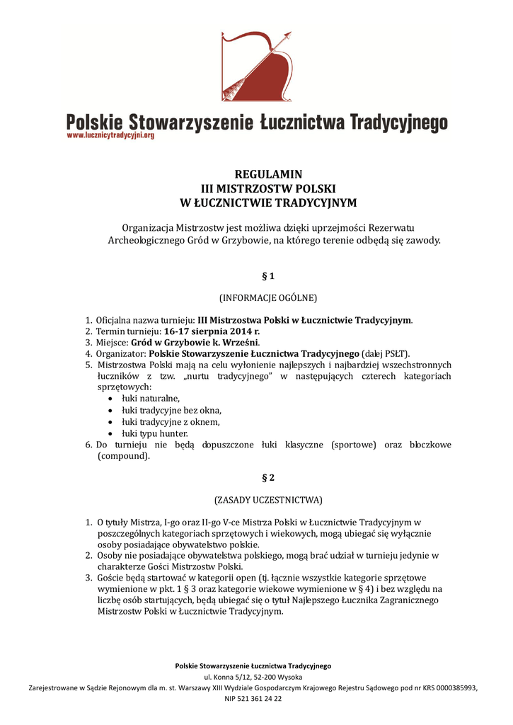 REGULAMIN III MISTRZOSTW POLSKI W ŁUCZNICTWIE TRADYCYJNYM Organizacja Mistrzostw jest możliwa dzięki uprzejmości Rezerwatu Archeologicznego Gród w Grzybowie, na którego terenie odbędą się zawody. §1 (INFORMACJE OGÓLNE) 1. 2. 3. 4. 5. Oficjalna nazwa turnieju: III Mistrzostwa Polski w Łucznictwie Tradycyjnym. Termin turnieju: 16-17 sierpnia 2014 r. Miejsce: Gród w Grzybowie k. Wrześni. Organizator: Polskie Stowarzyszenie Łucznictwa Tradycyjnego (dalej PSŁT). Mistrzostwa Polski mają na celu wyłonienie najlepszych i najbardziej wszechstronnych łuczników z tzw. „nurtu tradycyjnego” w następujących czterech kategoriach sprzętowych: łuki naturalne, łuki tradycyjne bez okna, łuki tradycyjne z oknem, łuki typu hunter. 6. Do turnieju nie będą dopuszczone łuki klasyczne (sportowe) oraz bloczkowe (compound). §2 (ZASADY UCZESTNICTWA) 1. O tytuły Mistrza, I-go oraz II-go V-ce Mistrza Polski w Łucznictwie Tradycyjnym w poszczególnych kategoriach sprzętowych i wiekowych, mogą ubiegać się wyłącznie osoby posiadające obywatelstwo polskie. 2. Osoby nie posiadające obywatelstwa polskiego, mogą brać udział w turnieju jedynie w charakterze Gości Mistrzostw Polski. 3. Goście będą startować w kategorii open (tj. łącznie wszystkie kategorie sprzętowe wymienione w pkt. 1 § 3 oraz kategorie wiekowe wymienione w § 4) i bez względu na liczbę osób startujących, będą ubiegać się o tytuł Najlepszego Łucznika Zagranicznego Mistrzostw Polski w Łucznictwie Tradycyjnym. Polskie Stowarzyszenie Łucznictwa Tradycyjnego ul. Konna 5/12, 52-200 Wysoka Zarejestrowane w Sądzie Rejonowym dla m. st. Warszawy XIII Wydziale Gospodarczym Krajowego Rejestru Sądowego pod nr KRS 0000385993, NIP 521 361 24 22 §3 (KATEGORIE SPRZĘTOWE) 1. Zawodnicy mogą startować tylko w jednej z poniższych kategorii sprzętowych: 2. 3. ŁUKI NATURALNE – kategoria łuku naturalnego obejmuje wszystkie łuki tradycyjne, wykonane w całości z materiałów naturalnych jako repliki łuków historycznych. Cięciwy – z dowolnych materiałów. Strzały – wyłącznie drewniane z opierzeniem naturalnym, groty tarczowe, osady wykonane z materiałów naturalnych. Miejsce przyłożenia strzały może być oznaczone. Niedozwolone są podpórki pod strzałę. ŁUKI TRADYCJNE BEZ OKNA – kategoria łuku tradycyjnego bez okna obejmuje wszystkie łuki tradycyjne, wykonane częściowo lub w całości z materiałów nienaturalnych jako repliki łuków historycznych. Wcięcie w majdanie nie może być większe niż średnica strzały używanej do tego łuku w najwęższym miejscu promienia (pomiar dokonuje się w miejscu uchwytu łuku), a strzała nie może dotykać osi symetrii łuku. Cięciwy – z dowolnych materiałów. Strzały – wyłącznie drewniane z opierzeniem naturalnym, groty tarczowe, osady wykonane z dowolnych materiałów. Dozwolone są podpórki pod strzałę wykonane ze skóry, drewna, rogu lub włosia. ŁUKI TRADYCYJNE Z OKNEM – kategoria łuku tradycyjnego z oknem obejmuje wszystkie łuki tradycyjne, wykonane częściowo lub w całości z materiałów nienaturalnych jako repliki łuków historycznych. Wcięcie w majdanie może być większe niż średnica strzały używanej do tego łuku w najwęższym miejscu promienia (pomiar dokonuje się w miejscu uchwytu łuku), a strzała nie może przekraczać osi symetrii łuku. Cięciwy – z dowolnych materiałów. Strzały – wyłącznie drewniane z opierzeniem naturalnym, groty tarczowe, osady wykonane z dowolnych materiałów. Dozwolone są podpórki pod strzałę wykonane ze skóry, drewna, rogu lub włosia. ŁUKI TYPU HUNTER – kategoria łuków typu hunter obejmuje wszystkie jednorodne bądź składane, współczesne łuki tradycyjne, wykonane częściowo lub w całości z materiałów nienaturalnych z tzw. uchwytem pistoletowym wykonanym z drewna. Cięciwy – z dowolnych materiałów. Strzały – promienie dowolne, opierzenie dowolne, groty tarczowe, osady wykonane z dowolnych materiałów. Dozwolone są podpórki pod strzałę wykonane ze skóry, drewna, rogu, włosia lub z innych materiałów. Minimalna liczba osób tworząca daną kategorię sprzętową to 6 (sześć). W przypadku mniejszej liczby osób, będą one zakwalifikowane do kategorii wyższej, a w przypadku jej braku nie będą klasyfikowani, ale mogą brać udział w zawodach. O przynależności do konkretnej kategorii sprzętowej będzie decydować Komisja Weryfikująca Sprzęt przed rozpoczęciem Mistrzostw Polski. Nie wprowadza się limitu siły naciągu łuków. Polskie Stowarzyszenie Łucznictwa Tradycyjnego ul. Konna 5/12, 52-200 Wysoka Zarejestrowane w Sądzie Rejonowym dla m. st. Warszawy XIII Wydziale Gospodarczym Krajowego Rejestru Sądowego pod nr KRS 0000385993, NIP 521 361 24 22 4. 5. 6. W każdej z w/w kategorii sprzętowej obowiązuje bezwzględny zakaz używania jakichkolwiek przyrządów celowniczych (dozwolone są jedynie oznaczenia miejsca osadzenia strzały na cięciwie oraz przyłożenia strzały na rękojeści łuku). Podczas całego przebiegu Mistrzostw Polski zawodnicy zobowiązani są do posługiwania się tym samym łukiem i kompletem strzał, jaki okazali Komisji Weryfikacyjnej. Niestosowanie się do powyższego spowoduje natychmiastową dyskwalifikację zawodnika. Wyjątkiem jest sytuacja, kiedy łuk ulegnie awarii. Łuk zastępczy musi być zakwalifikowany w tej samej kategorii sprzętowej, co poprzedni. Weryfikację przeprowadza Sędzia Prowadzący daną grupę. Każdy Zawodnik zobowiązany jest posiadać własne strzały w ilości min. 10 sztuk. Strzały powinny być podpisane imieniem i nazwiskiem, bądź oznaczone w taki sposób, aby było możliwe ich szybkie i bezproblemowe odróżnienie. §4 (KATEGORIE WIEKOWE) 1. 2. 3. Zawodnicy powyżej 16 roku życia zostaną podzieleni bez względu na płeć na kategorie sprzętowe wg zapisów § 3 Regulaminu. Zawodników poniżej 16 roku życia nie dotyczą kategorie sprzętowe w