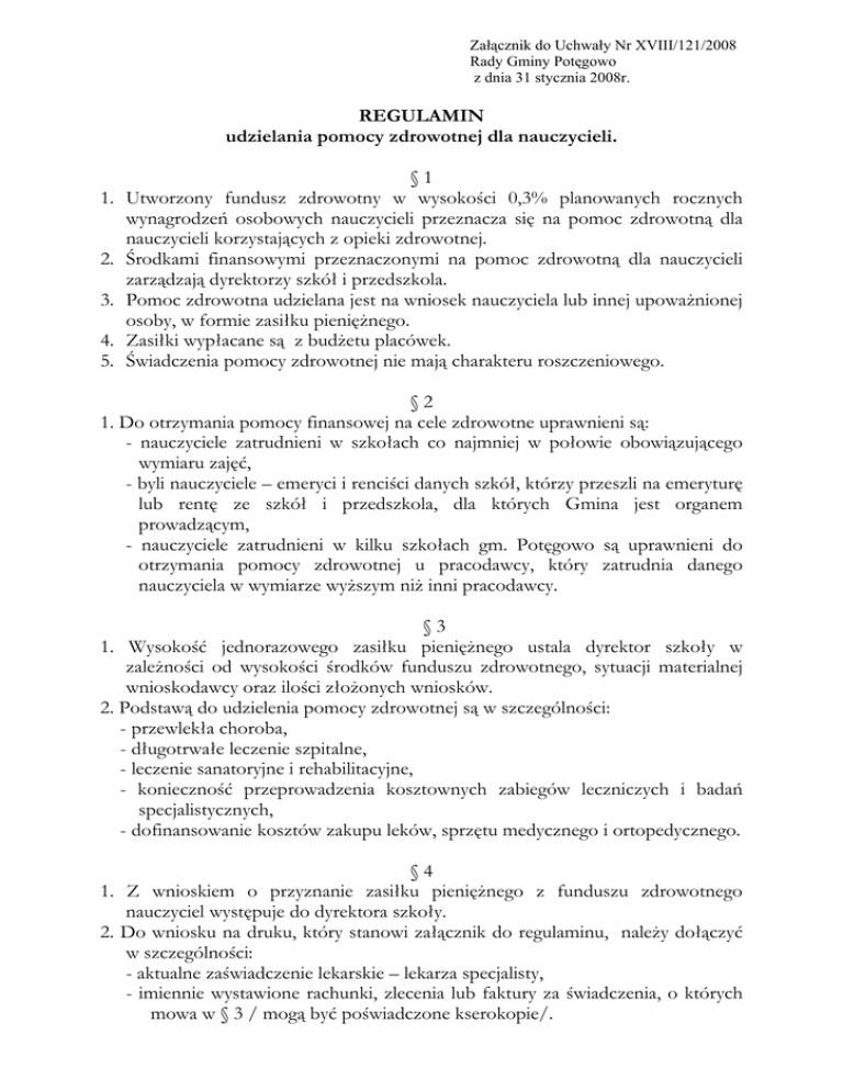 Załącznik do Uchwały Nr XVIII/121/2008 Rady Gminy Potęgowo z dnia 31 stycznia 2008r. REGULAMIN udzielania pomocy zdrowotnej dla nauczycieli. 1. 2. 3. 4. 5. §1 Utworzony fundusz zdrowotny w wysokości 0,3% planowanych rocznych wynagrodzeń osobowych nauczycieli przeznacza się na pomoc zdrowotną dla nauczycieli korzystających z opieki zdrowotnej. Środkami finansowymi przeznaczonymi na pomoc zdrowotną dla nauczycieli zarządzają dyrektorzy szkół i przedszkola. Pomoc zdrowotna udzielana jest na wniosek nauczyciela lub innej upoważnionej osoby, w formie zasiłku pieniężnego. Zasiłki wypłacane są z budżetu placówek. Świadczenia pomocy zdrowotnej nie mają charakteru roszczeniowego. §2 1. Do otrzymania pomocy finansowej na cele zdrowotne uprawnieni są: - nauczyciele zatrudnieni w szkołach co najmniej w połowie obowiązującego wymiaru zajęć, - byli nauczyciele – emeryci i renciści danych szkół, którzy przeszli na emeryturę lub rentę ze szkół i przedszkola, dla których Gmina jest organem prowadzącym, - nauczyciele zatrudnieni w kilku szkołach gm. Potęgowo są uprawnieni do otrzymania pomocy zdrowotnej u pracodawcy, który zatrudnia danego nauczyciela w wymiarze wyższym niż inni pracodawcy. §3 1. Wysokość jednorazowego zasiłku pieniężnego ustala dyrektor szkoły w zależności od wysokości środków funduszu zdrowotnego, sytuacji materialnej wnioskodawcy oraz ilości złożonych wniosków. 2. Podstawą do udzielenia pomocy zdrowotnej są w szczególności: - przewlekła choroba, - długotrwałe leczenie szpitalne, - leczenie sanatoryjne i rehabilitacyjne, - konieczność przeprowadzenia kosztownych zabiegów leczniczych i badań specjalistycznych, - dofinansowanie kosztów zakupu leków, sprzętu medycznego i ortopedycznego. §4 1. Z wnioskiem o przyznanie zasiłku pieniężnego z funduszu zdrowotnego nauczyciel występuje do dyrektora szkoły. 2. Do wniosku na druku, który stanowi załącznik do regulaminu, należy dołączyć w szczególności: - aktualne zaświadczenie lekarskie – lekarza specjalisty, - imiennie wystawione rachunki, zlecenia lub faktury za świadczenia, o których mowa w § 3 / mogą być poświadczone kserokopie/. - oświadczenie wnioskodawcy o osiągniętych dochodach brutto na jedną osobę w gospodarstwie domowym nauczyciela wyliczone jako średnia z ostatnich trzech miesięcy poprzedzających miesiąc złożenia wniosku. 3. Posiedzenia Komisji Zdrowotnej odbywają się dwa razy w roku. 4. W szczególnie uzasadnionych przypadkach posiedzenia Komisji mogą odbywać się częściej. §5 1. Dyrektor szkoły przyznaje zasiłki po zaopiniowaniu wniosków przez komisję do spraw pomocy finansowej na cele zdrowotne zwaną Komisją Zdrowotną. 2. Komisję, o której mowa w ust. 1 powołuje dyrektor szkoły lub przedszkola w składzie: - z-ca dyrektora, a w przypadku braku jego zastępcy osoba upoważniona przez dyrektora szkoły /przedszkola/ jako przewodniczący Komisji, - nauczyciel wytypowany przez Radę Pedagogiczną, - po jednym przedstawicielu związków zawodowych działających w szkole. 3. Na wniosek Rady Pedagogicznej i Związków Zawodowych działających w szkole /przedszkolu/ dyrektor dokonuje zmiany członków Komisji przez nich zgłoszonych. 4. Opinia Komisji Zdrowotnej podejmowana jest po zapoznaniu się i omówieniu wniosków w głosowaniu jawnym zwykłą większością głosów przy udziale co najmniej 2/3 członków Komisji. 5. Do szczegółowych zadań Komisji Zdrowotnej należy: - opiniowanie wniosków o przyznanie pomocy zdrowotnej, - wnioskowanie do dyrektora o przyznanie pomocy zdrowotnej w formie odpowiedniego świadczenia osobom o których mowa w § 2. §6 1. Członkowie Komisji Zdrowotnej są zobowiązani do zachowania w tajemnicy informacji o stanie zdrowia i sytuacji materialnej nauczycieli ubiegających się o pomoc zdrowotną. §7 1. Zasiłek na pomoc zdrowotną może być przyznany nauczycielowi nie częściej niż raz w roku. 2. W szczególnie uzasadnionym przypadku zasiłek może być przyznawany dwa razy w roku. §8 1. Świadczenia zdrowotne będą przyznawane w zależności od posiadanych środków. Załącznik do regulaminu udzielania pomocy zdrowotnej dla nauczycieli WNIOSEK O PRZYZNANIE POMOCY ZDROWOTNEJ …………………………………………….. Wnioskodawca (imię i nazwisko) …………………………………………….. Adres zamieszkania i nr tel. …………………………………………….. Placówka, w której wnioskodawca jest lub był zatrudniony Uzasadnienie: …………………………………………………………………………………… ……………………………………………………………………………………. ……………………………………………………………………………………. ……………………………………………………………………………………. (w załączeniu: aktualne zaświadczenie lekarskie o chorobie nauczyciela, dokumenty potwierdzające poniesione koszty leczenia) ……………………………………... Data i podpis wnioskodawcy Opinia Komisji Zdrowotnej i proponowana wysokość pomocy finansowej: …………………………………………………………………………… …………………………………………………………………………… …………………………………………………………………………… Podpisy członków Komisji Zdrowotnej: ………………………………………. ………………………………………. ………………………………………. ………………………………………. Dyrektor szkoły: Przyznaję pomoc zdrowotną w wysokości ………………………………. (kwota) ……………………………… Data i podpis