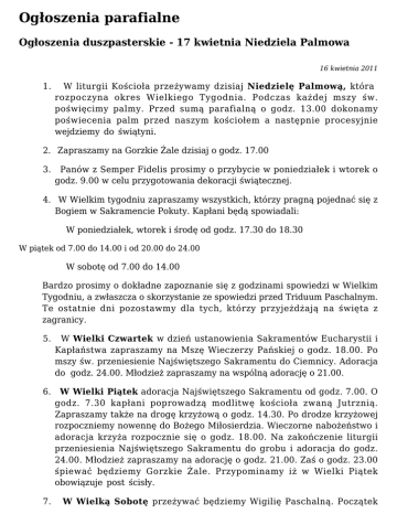 Ogłoszenia parafialne Ogłoszenia duszpasterskie - 17 kwietnia Niedziela Palmowa 16 kwietnia 2011 1. W liturgii Kościoła przeżywamy dzisiaj Niedzielę Palmową, która rozpoczyna okres Wielkiego Tygodnia. Podczas każdej mszy św. poświęcimy palmy. Przed sumą parafialną o godz. 13.00 dokonamy poświecenia palm przed naszym kościołem a następnie procesyjnie wejdziemy do świątyni. 2. Zapraszamy na Gorzkie Żale dzisiaj o godz. 17.00 3. Panów z Semper Fidelis prosimy o przybycie w poniedziałek i wtorek o godz. 9.00 w celu przygotowania dekoracji świątecznej. 4. W Wielkim tygodniu zapraszamy wszystkich, którzy pragną pojednać się z Bogiem w Sakramencie Pokuty. Kapłani będą spowiadali: W poniedziałek, wtorek i środę od godz. 17.30 do 18.30 W piątek od 7.00 do 14.00 i od 20.00 do 24.00 W sobotę od 7.00 do 14.00 Bardzo prosimy o dokładne zapoznanie się z godzinami spowiedzi w Wielkim Tygodniu, a zwłaszcza o skorzystanie ze spowiedzi przed Triduum Paschalnym. Te ostatnie dni pozostawmy dla tych, którzy przyjeżdżają na święta z zagranicy. 5. W Wielki Czwartek w dzień ustanowienia Sakramentów Eucharystii i Kapłaństwa zapraszamy na Mszę Wieczerzy Pańskiej o godz. 18.00. Po mszy św. przeniesienie Najświętszego Sakramentu do Ciemnicy. Adoracja do godz. 24.00. Młodzież zapraszamy na wspólną adorację o 21.00. 6. W Wielki Piątek adoracja Najświętszego Sakramentu od godz. 7.00. O godz. 7.30 kapłani poprowadzą modlitwę kościoła zwaną Jutrznią. Zapraszamy także na drogę krzyżową o godz. 14.30. Po drodze krzyżowej rozpoczniemy nowennę do Bożego Miłosierdzia. Wieczorne nabożeństwo i adoracja krzyża rozpocznie się o godz. 18.00. Na zakończenie liturgii przeniesienia Najświętszego Sakramentu do grobu i adoracja do godz. 24.00. Młodzież zapraszamy na adorację o godz. 21.00. Zaś o godz. 23.00 śpiewać będziemy Gorzkie Żale. Przypominamy iż w Wielki Piątek obowiązuje post ścisły. 7. W Wielką Sobotę przeżywać będziemy Wigilię Paschalną. Początek adoracji o godz. 7.00. O 7.30 wspólnie odmówimy modlitwę Kościoła zwaną Jutrznią. Poświęcenie pokarmów wielkanocnych od godz. 10.00 do 15.00. W tym dniu będzie też można złożyć ofiarę dla najuboższych z naszej parafii. Wieczorną liturgię Wielkiej Soboty połączoną z procesją rezurekcyjną rozpoczniemy o godz. 22.00. Prosimy o przyniesienie świec zaś wszystkie grupy duszpasterskie o przygotowanie chorągwi i sztandarów na procesję. 8. W Niedzielę Zmartwychwstania Pańskiego odprawimy msze św. wg porządku niedzielnego tzn. o godz. 6.30, 8.00, 9.30, 11.00, 12.00, 13.00, 18.00 i 20.00.W II dzień Świąt Wielkanocnych msze św. jak w każdą niedzielę. Tradycyjnie taca w tym dniu przeznaczona jest na potrzeby Katolickiego Uniwersytetu Lubelskiego. 9. Biuro parafialne będzie w tym tygodniu czynne tylko w poniedziałek i środę. 10. Informujemy iż istnieje możliwość odwiedzenia przed świętami chorych, którzy nie korzystają z posługi pierwszopiatkowej. Prosimy o zgłaszanie takich osób do wtorku w biurze parafialnym lub w zakrystii. 11. Dziękujemy za wszystkie ofiary składane na potrzeby parafii. W ciągu najbliższych trzech dni (do środy) zamontowane zostaną dwa witraże oraz dębowa balustrada na chór. Dzisiejsza taca jest przeznaczona na ten cel. Z tyłu kościoła, za ławkami, znajduje się skarbona do której można składać ofiary na kwiaty do dekoracji Grobu Pańskiego. Dzisiaj przed kościołem dzieci ze SP nr 80 przygotowały ozdoby świąteczne w ramach kiermaszu szkolnego. 12. Dziękujemy wszystkim za udział w rekolekcjach wielkopostnych oraz za udział w piątkowej drodze krzyżowej przygotowanej przez naszą młodzież. 13. W naszym kiosku zachęcamy do nabycia małych paschałów na stół wielkanocny oraz palm przygotowanych na dzisiejszą niedzielę. Jest także bogaty wybór prasy katolickiej. Szczególnie zaś polecamy świąteczny numer Głosu Brata, w którym zawarliśmy wiele ciekawych informacji i zdjęć z życia naszej parafii. 14. Zapraszamy do odwiedzania parafialnej strony internetowej. Polecamy kartki Wielkanocne oraz bogaty materiał zdjęciowy z wydarzeń parafialnych. 15. Na zakończenie pomódlmy się za wszystkich zmarłych naszych parafian i za zmarłych z naszych rodzin. W ostatnim tygodniu odeszła do wieczności: Śp. Teresa Dampc z ul. Olsztyńskiej l. 85