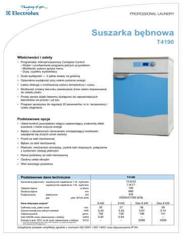 PROFESSIONAL LAUNDRY Suszarka bębnowa T4190 Właściwości i zalety • Programator mikroprocesorowy Compass Control - Wybór i uruchamianie programu jednym przyciskiem - Możliwość wyboru języka menu - Duży, czytelny wyświetlacz • Duża wydajność — 2 pełne wsady na godzinę • Optymalna wydajność przy niskim poborze energii • Łatwa obsługa z możliwością wyboru temperatury i czasu • Możliwość zmiany kierunku zawieszenia drzwi celem dopasowania do układu pralni • Prosty serwis dzięki łatwemu dostępowi do najważniejszych elementów od przodu i od tyłu • Program serwisowy do regulacji 20 parametrów, m.in. temperatury i czasu stygnięcia Podstawowe opcje • Układ kontroli pozostałości wilgoci zapewniający znakomity efekt suszenia i niskie zużycie energii • Bęben z obustronnym obracaniem zmniejszający możliwość zaplątania się dużych sztuk odzieży • Przód ze stali nierdzewnej • Bęben ze stali nierdzewnej • Płatność: mechanizm wrzutowy, czytnik kart chipowych, połączenie z systemem obsługi płatności • Rama podstawy ze stali nierdzewnej • Osobny układ skroplin • Wlot świeżego powietrza Podstawowe dane techniczne T4190 Nominalna pojemność, Objętość bębna Średnica bębna Podgrzewanie, 10.6/23 7.6/17 190 680 6/8 20500/27300 (6/8) współczynnik napełnienia 1:18 kg/funtów współczynnik napełnienia 1:25 kg/funtów w litrach mm elektryczne kW gaz jedn. BTU/h (kW) Dane dotyczące zużycia* Całkowity czas, pełen wsad Zużycie energii przy pełnym wsadzie Odparowywanie Ilość kWh/litr wody odparowanej z odzieży Energia w jedn. BTU na litr wody odparowanej z odzieży * Przy znamionowej pojemności, wsad 100% bawełny o początkowej wilgotności 50% osuszany do 0% wilgotności. min. kWh g/min. kWh/l BTU/l 6 kW 8 kW Gaz 6 kW Gaz 8 kW 35 3.45 102 0.92 – 27 3.53 129 0.94 – 36 3.67 106 – 3296 29 3.74 131 – 3359 Urządzenie posiada certyfikaty zgodnie z normami ISO 9001 i ISO 14001 oraz dopuszczenie IP X4. Połączenia elektryczne* T4190 El. 230 - 240 V, 1-fazowe, 50/60 Hz kW(A) 208–240 V, 3-fazowe, 60 Hz kW(A) 230–240 V, 3-fazowe, 50/60 Hz kW(A) 6.3 (35) 6.3 (20) 8.3 (25) 400 V, 3-fazowe (N), 50/60 Hz 400 V, 3-fazowe (N), 50/60 Hz kW(A) kW(A) 6.3 (10) 8.3 (16) Gaz 230 - 240 V, 1-fazowe, 50/60 Hz 208–240 V, 3-fazowe, 60 Hz 230–240 V, 3-fazowe, 50/60 Hz 400 V, 3-fazowe (N), 50/60 Hz kW(A) kW(A) kW(A) kW(A) 0.25 (10) 0.25 (10) 0.25 (10) 0.25 (10) Podgrzewanie Napięcie Przyłącza gazu i powietrza A 1 Gaz Ciśnienie gazu Wylot powietrza ISO 7/1-R Gaz ziemny Pa mbar Propan Pa mbar ø mm Przepływ odprowadzanego powietrza 6 kW m3/h 8 kW Spadek ciśnienia 6 kW Maks. w Pa 8 kW 1/2” 2000 20 2800-5000 30 125 270 290 380 350 C D 6691 Strona przednia Poziomy hałasu Poziom hałasu w powietrzu LW dB(A) B <68 Ciepło emitowane % zainstalowanej mocy, maks. 15 Dane transportowe netto, kg ze skrzynią, kg ze skrzynią, m3 103 114 0.8 720 745 1130 420 110 120 960 45 55 575 80 1445 Wymiary w mm 1 Otwór drzwiczek ø 400 2 Przyłącze elektryczne 3 Przyłącze wylotowe 6692 Strona lewa H 4 I 4 Przyłącze centralnego systemu obsługi płatności 5 Przyłącze gazu 2 * Możliwe są również inne wartości napięcia, zob. instrukcja instalacji. G 5 3 3 K E 6694 M 6693 F L Strona tylna www.electrolux.com/laundrysystems Share more of our thinking at www.electrolux.com Art. No. 438903174/09.43 Widok z góry Zastrzega się prawo do zmiany danych technicznym bez powiadomienia. A Szerokość B Głębokość C Wysokość D E F G H I K L M