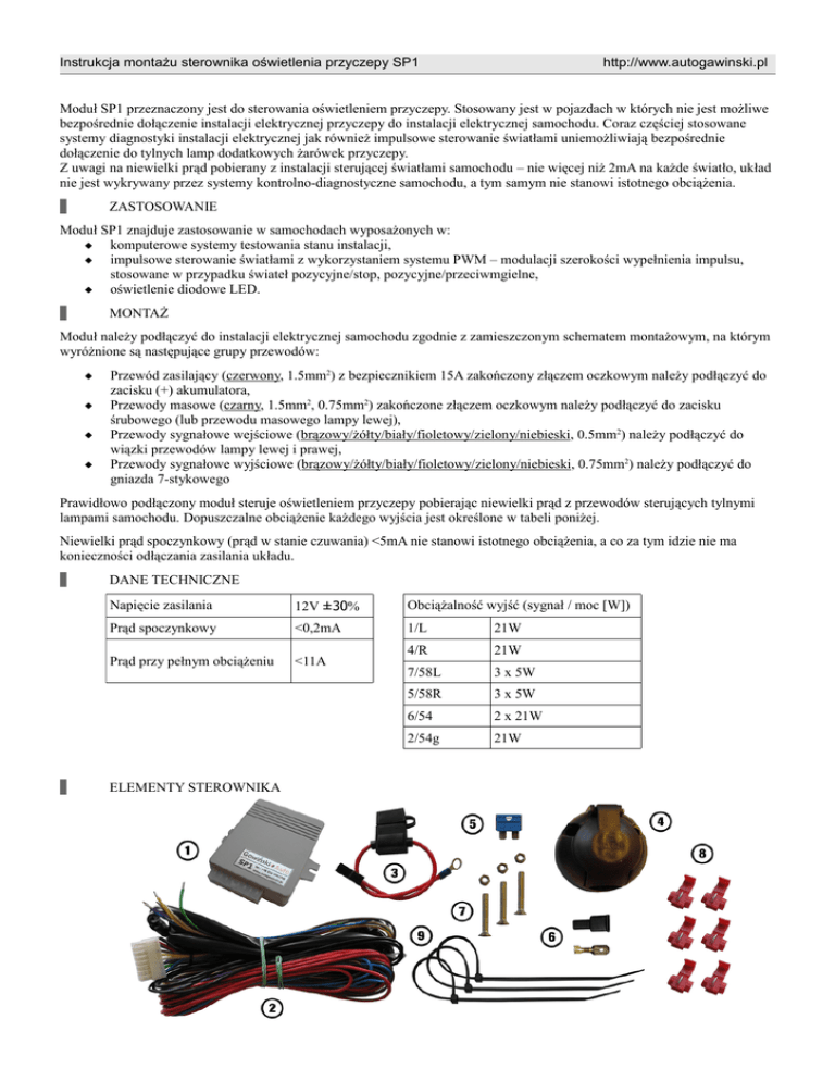 Instrukcja montażu sterownika oświetlenia przyczepy SP1 http://www.autogawinski.pl Moduł SP1 przeznaczony jest do sterowania oświetleniem przyczepy. Stosowany jest w pojazdach w których nie jest możliwe bezpośrednie dołączenie instalacji elektrycznej przyczepy do instalacji elektrycznej samochodu. Coraz częściej stosowane systemy diagnostyki instalacji elektrycznej jak również impulsowe sterowanie światłami uniemożliwiają bezpośrednie dołączenie do tylnych lamp dodatkowych żarówek przyczepy. Z uwagi na niewielki prąd pobierany z instalacji sterującej światłami samochodu – nie więcej niż 2mA na każde światło, układ nie jest wykrywany przez systemy kontrolno-diagnostyczne samochodu, a tym samym nie stanowi istotnego obciążenia. ZASTOSOWANIE Moduł SP1 znajduje zastosowanie w samochodach wyposażonych w: komputerowe systemy testowania stanu instalacji, impulsowe sterowanie światłami z wykorzystaniem systemu PWM – modulacji szerokości wypełnienia impulsu, stosowane w przypadku świateł pozycyjne/stop, pozycyjne/przeciwmgielne, oświetlenie diodowe LED. MONTAŻ Moduł należy podłączyć do instalacji elektrycznej samochodu zgodnie z zamieszczonym schematem montażowym, na którym wyróżnione są następujące grupy przewodów: Przewód zasilający (czerwony, 1.5mm2) z bezpiecznikiem 15A zakończony złączem oczkowym należy podłączyć do zacisku (+) akumulatora, Przewody masowe (czarny, 1.5mm2, 0.75mm2) zakończone złączem oczkowym należy podłączyć do zacisku śrubowego (lub przewodu masowego lampy lewej), Przewody sygnałowe wejściowe (brązowy/żółty/biały/fioletowy/zielony/niebieski, 0.5mm2) należy podłączyć do wiązki przewodów lampy lewej i prawej, Przewody sygnałowe wyjściowe (brązowy/żółty/biały/fioletowy/zielony/niebieski, 0.75mm2) należy podłączyć do gniazda 7-stykowego Prawidłowo podłączony moduł steruje oświetleniem przyczepy pobierając niewielki prąd z przewodów sterujących tylnymi lampami samochodu. Dopuszczalne obciążenie każdego wyjścia jest określone w tabeli poniżej. Niewielki prąd spoczynkowy (prąd w stanie czuwania) <5mA nie stanowi istotnego obciążenia, a co za tym idzie nie ma konieczności odłączania zasilania układu. DANE TECHNICZNE Napięcie zasilania 12V ±30% Obciążalność wyjść (sygnał / moc [W]) Prąd spoczynkowy <0,2mA 1/L 21W Prąd przy pełnym obciążeniu <11A 4/R 21W 7/58L 3 x 5W 5/58R 3 x 5W 6/54 2 x 21W 2/54g 21W ELEMENTY STEROWNIKA Gawiński – Auto Nowe Boryszewo 134A 09-410 Płock L 54 światło stop światło kierunku jazdy L 54g światło przeciwmgielne STOP 58L Masa Złącze 6,3mm światło pozycyjne lewe Masa 15A Bezpiecznik L 1 8 zielony fioletowy biały żółty niebieski zielony fioletowy biały żółty brązowy czarny niebieski brązowy 2 x 0.5mm2, 3m Podłączenie do lamp tylnych samochodu 4 x 0.5mm2, 1.5m 0.75mm2, 1.2m czarny 9 16 czerwony, 1.5mm2, 5m 6 x 0.75mm2, 1.8m 1.5mm2, 2m R R 58R 4/R 1/L 6/54 2/54g 7/58L 5/58R 3/31 Światło kierunku jazdy prawe Światło kierunku jazdy lewe Światło stop 5/58R 6/54 3/31 2/54g światło kierunku jazdy R światło pozycyjne R 4/R 7/58L 1/L Widok złącza 7-stykowego 12V/N od strony podłączenia wtyczki STOP Światło przeciwmgielne Światło pozycyjne lewe Światło pozycyjne prawe Masa Opis wyprowadzeń 7-stykowego gniazda 12V/N Instrukcja montażu sterownika oświetlenia przyczepy SP1 http://www.autogawinski.pl SCHEMAT MONTAŻOWY STEROWNIKA tel. /024/ 2641706 http://www.autogawinski.pl [email protected]