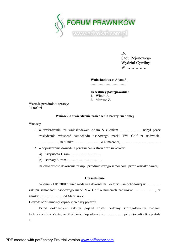 Do Sądu Rejonowego Wydział Cywilny W …………… Wnioskodawca: Adam S. …………………………. Uczestnicy postępowania: 1. Witold A. 2. Mariusz Z. Wartość przedmiotu sprawy: 14.000 zł Wniosek o stwierdzenie zasiedzenia rzeczy ruchomej Wnoszę: 1. o stwierdzenie, że wnioskodawca Adam S z dniem ……………… nabył przez zasiedzenie własność samochodu osobowego marki VW Golf nr nadwozia: …………….., nr silnika: …………………, o numerze rej. …………………………… 2. o dopuszczenie dowodu z przesłuchania stron oraz świadków: a) Krzysztofa J. zam. …………………….. b) Barbary S. zam ………………………… na okoliczność dokonania zakupu przedmiotowego samochodu przez wnioskodawcę. Uzasadnienie W dniu 21.05.2001r. wnioskodawca dokonał na Giełdzie Samochodowej w ………… zakupu samochodu osobowego marki VW Golf o numerach nadwozia: ………………, nr silnika: ……………….. od Mariusza Z. Dowód: odpis umowy kupna-sprzedaży pojazdu. Przed dokonaniem zakupu pojazd został poddany szczegółowemu badaniu technicznemu w Zakładzie Mechaniki Pojazdowej w …………….. przez świadka Krzysztofa J. PDF created with pdfFactory Pro trial version www.pdffactory.com Dowód: wydruk zlecenia badania technicznego pojazdu W trakcie badanie nie ujawniono żadnych usterek, ani przeróbek w polu numerów identyfikacyjnych pojazdu. Cena nabycia pojazdu, określona na kwotę ………. zł – również nie wzbudzała u wnioskodawcy żadnych wątpliwości, bowiem była to średnia cena rynkowa dla rocznika przedmiotowego pojazdu. Dowód: zeznania zawnioskowanych świadków W dniu 29.05.2001 roku wnioskodawca dokonał przerejestrowania na siebie zakupionego pojazdu w Wydziale Komunikacji Starostwa Powiatowego w ………….. Podczas przerejestrowywania Wydział Komunikacji również nie stwierdził żadnych nieprawidłowości co do stanu prawnego przedmiotowego pojazdu. W dniu 17.07.2004r. wnioskodawca został zatrzymany do rutynowej kontroli drogowej, podczas której doszło do weryfikacji numerów identyfikacyjnych pojazdu. Wówczas to okazało się, że pojazd o takich numerach został wpisany do systemu jako skradziony w dniu 13.03.2001r. na szkodę Witolda A. W tej sytuacji należy stwierdzić, że wnioskodawca posiadał przedmiotowy samochód nieprzerwanie od trzech lat jako posiadacz samoistny w dobrej wierze. Przyłożył on bowiem maksimum starań, aby sprawdzić stan techniczny i prawny pojazdu. Nic nie wskazywało bowiem na to, że dowód rejestracyjny przekazany mu przez Mariusza Z. został przerobiony. Takiej okoliczności nie odkrył nie tylko warsztat samochodowy specjalizujący się w ocenie stanu technicznego i legalności kupowanych na giełdzie pojazdów, ale również Wydział Komunikacji Starostwa Powiatowego w …………… Mając powyższe na uwadze, wniosek niniejszy jest uzasadniony. …………………… PDF created with pdfFactory Pro trial version www.pdffactory.com