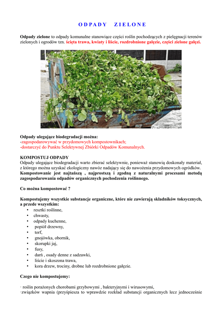 O D PA D Y Z IE LO N E Odpady zielone to odpady komunalne stanowiące części roślin pochodzących z pielęgnacji terenów zielonych i ogrodów tzn. ścięta trawa, kwiaty i liście, rozdrobnione gałęzie, części zielone gałęzi. Odpady ulegające biodegradacji można: -zagospodarowywać w przydomowych kompostownikach; -dostarczyć do Punktu Selektywnej Zbiórki Odpadów Komunalnych. KOMPOSTUJ ODPADY Odpady ulegające biodegradacji warto zbierać selektywnie, ponieważ stanowią doskonały materiał, z którego można uzyskać ekologiczny nawóz nadający się do nawożenia przydomowych ogródków. Kompostowanie jest najtańszą , najprostszą i zgodną z naturalnymi procesami metodą zagospodarowania odpadów organicznych pochodzenia roślinnego. Co można kompostować ? Kompostujemy wszystkie substancje organiczne, które nie zawierają składników toksycznych, a przede wszystkim: • resztki roślinne, • chwasty, • odpady kuchenne, • popiół drzewny, • torf, • gnojówka, obornik, • skorupki jaj, • fusy, • darń , osady denne z sadzawki, • liście i skoszona trawa, • kora drzew, trociny, drobne lub rozdrobnione gałęzie. Czego nie kompostujemy: · roślin porażonych chorobami grzybowymi , bakteryjnymi i wirusowymi, ·związków wapnia (przyśpiesza to wprawdzie rozkład substancji organicznych lecz jednocześnie usuwa azot i blokuje rozpuszczalne w wodzie fosforany), · materiału niedostatecznie rozdrobnionego, · materiałów skażonych metalami ciężkimi , pozyskiwanych np. z okolic dróg o dużym nasileniu ruchu, · materiałów wcześniej konserwowanych chemicznie np. skórki pomarańczy , bananów i innych cytrusów. Miejsce przeznaczone do kompostowania powinno być nieco wzniesione, by zabezpieczyć powstający kompost przed zalewaniem wodą opadową. Ważnym jest także ocienienie pryzmy przez drzewa lub krzewy i osłonięcie od wiatru. Niezwykle użytecznym krzewem jest czarny bez, który pochłania zapachy powstające podczas procesu rozkładu substancji organicznych. Proces kompostowania może przebiegać w pryzmach, w kompostownikach wykonanych własnoręcznie lub kupionych w sklepach ogrodniczych. W każdym przypadku, w ogrodzie, należy przewidzieć miejsce magazynowania materiałów przeznaczonych do kompostowania oraz miejsce magazynowania gotowego kompostu. Odpadów zielonych nie powinno się przechowywać zbyt długo w workach, z uwagi na zachodzące wówczas procesy gnilne. „ odpady „zielone” można przekazać na bieżąco do Punktu Selektywnej Zbiórki Odpadów w miejscowości Karzniczka. ! Pamiętaj nigdy nie umieszczaj odpadów „zielonych” w pojemnikach, workach na odpady zmieszane.