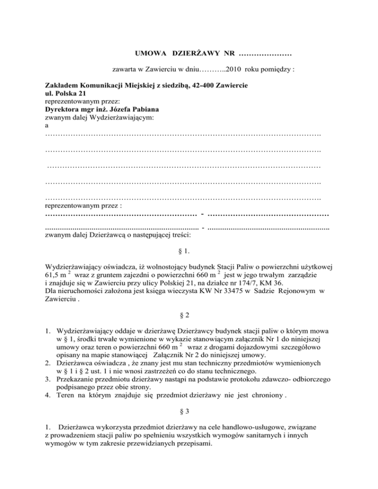 umowa dzierżawa nr - Urząd Miejski w Zawierciu