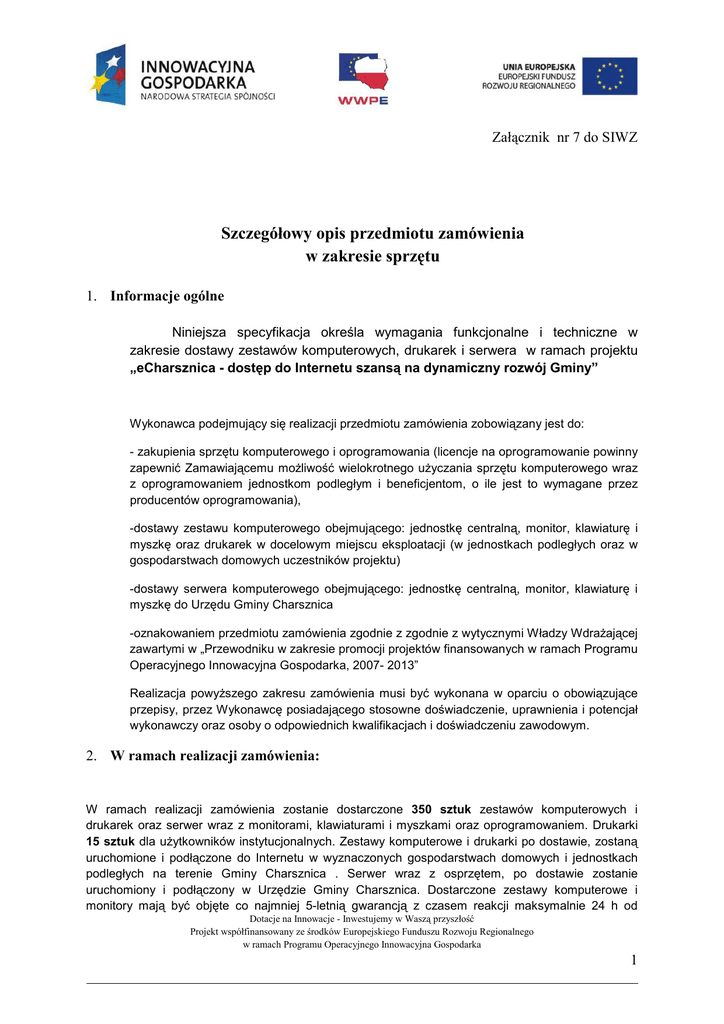Załącznik nr 7 do SIWZ Szczegółowy opis przedmiotu zamówienia w zakresie sprzętu 1. Informacje ogólne Niniejsza specyfikacja określa wymagania funkcjonalne i techniczne w zakresie dostawy zestawów komputerowych, drukarek i serwera w ramach projektu „eCharsznica - dostęp do Internetu szansą na dynamiczny rozwój Gminy” Wykonawca podejmujący się realizacji przedmiotu zamówienia zobowiązany jest do: - zakupienia sprzętu komputerowego i oprogramowania (licencje na oprogramowanie powinny zapewnić Zamawiającemu możliwość wielokrotnego użyczania sprzętu komputerowego wraz z oprogramowaniem jednostkom podległym i beneficjentom, o ile jest to wymagane przez producentów oprogramowania), -dostawy zestawu komputerowego obejmującego: jednostkę centralną, monitor, klawiaturę i myszkę oraz drukarek w docelowym miejscu eksploatacji (w jednostkach podległych oraz w gospodarstwach domowych uczestników projektu) -dostawy serwera komputerowego obejmującego: jednostkę centralną, monitor, klawiaturę i myszkę do Urzędu Gminy Charsznica -oznakowaniem przedmiotu zamówienia zgodnie z zgodnie z wytycznymi Władzy Wdrażającej zawartymi w „Przewodniku w zakresie promocji projektów finansowanych w ramach Programu Operacyjnego Innowacyjna Gospodarka, 2007- 2013” Realizacja powyższego zakresu zamówienia musi być wykonana w oparciu o obowiązujące przepisy, przez Wykonawcę posiadającego stosowne doświadczenie, uprawnienia i potencjał wykonawczy oraz osoby o odpowiednich kwalifikacjach i doświadczeniu zawodowym. 2. W ramach realizacji zamówienia: W ramach realizacji zamówienia zostanie dostarczone 350 sztuk zestawów komputerowych i drukarek oraz serwer wraz z monitorami, klawiaturami i myszkami oraz oprogramowaniem. Drukarki 15 sztuk dla użytkowników instytucjonalnych. Zestawy komputerowe i drukarki po dostawie, zostaną uruchomione i podłączone do Internetu w wyznaczonych gospodarstwach domowych i jednostkach podległych na terenie Gminy Charsznica . Serwer wraz z osprzętem, po dostawie zostanie uruchomiony i podłączony w Urzędzie Gminy Charsznica. Dostarczone zestawy komputerowe i monitory mają być objęte co najmniej 5-letnią gwarancją z czasem reakcji maksymalnie 24 h od Dotacje na Innowacje - Inwestujemy w Waszą przyszłość Projekt współfinansowany ze środków Europejskiego Funduszu Rozwoju Regionalnego w ramach Programu Operacyjnego Innowacyjna Gospodarka 1 momentu zgłoszenia usterki - w następny dzień roboczy- na miejscu bezpośrednio u klienta (on site) i czasem naprawy 3 dni. Dostarczony serwer wraz z osprzętem mają być objęte co najmniej 3-letnią gwarancją z czasem reakcji maksymalnie 24 h od momentu zgłoszenia usterki - w następny dzień roboczy- na miejscu bezpośrednio u klienta (on site) i czasem naprawy 3 dni. Drukarki mają być objęte 2 letnią gwarancją. Do napraw gwarancyjnych mają być wykorzystywane elementy fabrycznie nowe o parametrach nie gorszych niż parametry wymienianych elementów. Wymagania ogólne stawiane wszystkim urządzeniom: • Wszystkie oferowane urządzenia muszą być fabrycznie nowe, • Urządzenia muszą być dostarczone Zamawiającemu w oryginalnych opakowaniach fabrycznych, • Do każdego urządzenia musi być dostarczony komplet standardowej dokumentacji w języku polskim w formie papierowej lub elektronicznej. • Do każdego urządzenia musi być dostarczony komplet nośników umożliwiających odtworzenie oprogramowania zainstalowanego w urządzeniu. • Wszystkie urządzenia zostaną dostarczone z niezbędnym okablowaniem zasilającym i transmisyjnym. Wymagane minimalne podstawowe parametry oraz warunki równoważności stawiane zamawianym komputerom 350 sztuk Parametr, cecha, funkcjonalność Opis Typ komputera Komputer stacjonarny Procesor Procesor, min. wielordzeniowy umożliwiający osiągnięcie przez oferowany zestaw w teście SYSmark® 2012 wyniku całkowitego Rating – 140 punktów, Wymagane dołączenie do oferty wyniku testu przeprowadzonego na oferowanej konfiguracji i potwierdzającego osiągnięcie przez oferowany zestaw komputerowy wymaganego wyniku (wynik w postaci wydruku z programu Sysmark 2012). Płyta główna Chipset: minimum współpracujący z procesorami min. wielordzeniowymi Typ podstawki: dedykowany dla procesora 4 porty SATA2 4 x USB 2.0 4 x USB 3.0 Dotacje na Innowacje - Inwestujemy w Waszą przyszłość Projekt współfinansowany ze środków Europejskiego Funduszu Rozwoju Regionalnego w ramach Programu Operacyjnego Innowacyjna Gospodarka 2 1 x PCI Express x 16 3.0 1 x PCI Express x 1 Wbudowany system kontroli szybkości wentylatorów procesora i obudowy zapewniający optymalne chłodzenie przy minimalnej prędkości obrotowej wentylatorów Pamięć operacyjna Pamięć RAM 8 GB , z możliwością rozbudowy przynajmniej do 32GB Przynajmniej 2 wolne złącza do rozszerzenia pamięci Porty w tylnej części komputera Porty w przedniej części komputera Komputer wyposażony w następujące gniazda na tylnym panelu I/O: • co najmniej 6 gniazd USB; • 1 gniazdo portu LAN RJ-45; • 1 gniazdo do podłączenia zaoferowanego monitora; • 1 gniazdo Display Port; Komputer wyposażony w następujące gniazda na przednim panelu obudowy • 2 gniazda USB; • 1 gniazdo do przyłączenia słuchawek i 1 gniazdo do przyłączenia mikrofonu; HDD O pojemności 500 GB, Napęd optyczny Nagrywarka standardu DVD+/-RW z oprogramowaniem Karta dźwiękowa Zintegrowana z płytą główną, wielokanałowa. Karta graficzna Zintegrowana z płytą główną lub procesorem, umożliwiająca pracę dwumonitorową Karta sieciowa Zintegrowana z płytą główną, o prędkości 10/100/1000. Klawiatura Klawiatura USB standard QWERTY Mysz Mysz USB optyczna z rolką Obudowa Typu do pracy w pozycji pionowej, wyposażona przynajmniej w: • 1 zewnętrzne zatoki 5.25'' • 2 wewnętrzne zatoki 3,5” Dotacje na Innowacje - Inwestujemy w Waszą przyszłość Projekt współfinansowany ze