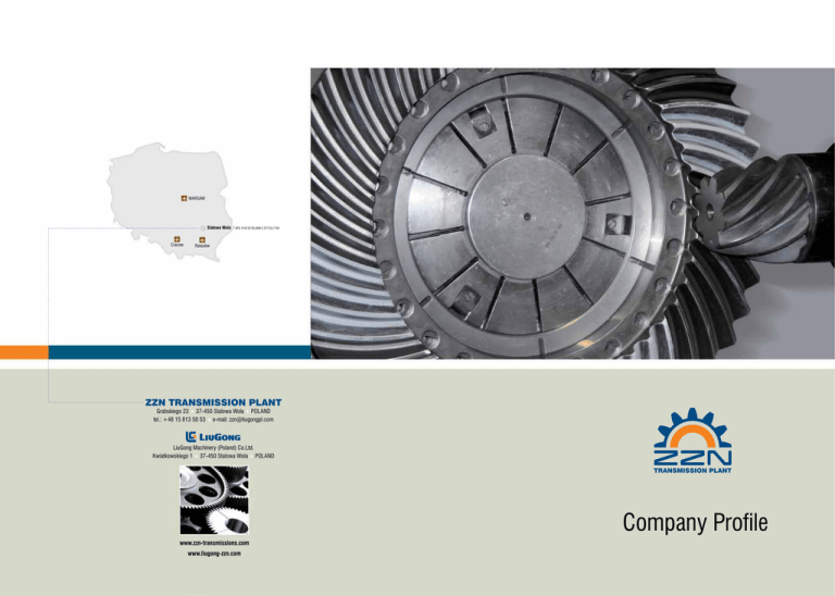 WARSAW Stalowa Wola / GPS: N 50°32’50,3096 E 22°3’32,7159 Cracow Rzeszów ZZN TRANSMISSION PLANT Grabskiego 23 37-450 Stalowa Wola POLAND tel.: +48 15 813 50 53 e-mail: [email protected] LiuGong Machinery (Poland) Co.Ltd. Kwiatkowskiego 1 37-450 Stalowa Wola POLAND TRANSMISSION PLANT Company Profile www.zzn-transmissions.com www.liugong-zzn.com ZZN Transmission Plant TRANSMISSION PLANT About Company O firmie The ZZN Transmission Plant has over 35 years of experience in manufacturing powertrain components. Its production facilities and highly qualified staff guarantee the world’s top quality products. Numerically controlled machines, machining centers, electron beam vacuum welding center and modern heat treatment equipment enable the manufacture of high quality products such as: transmissions for crawler tractors transmissions for wheel loaders powertrain components for combine harvesters toothed assemblies and parts for agricultural tractors toothed parts for automotive and railway industries single- and two-speed steering drives final drives axles Gleason type spiral bevel gear gears and toothed parts splined shafts clutch discs housing for powertrain components Zakład Zespołów Napędowych posiada ponad 35-cio letnie doświadczenie w produkcji zespołów napędowych. Posiadany park maszynowy, urządzenia oraz wysokie kwalifikacje załogi gwarantują światowy poziom jakości produkcji. Obrabiarki sterowane numerycznie, centra obróbcze, urządzenia do spawania w próżni wiązką elektronów oraz nowoczesne urządzenia obróbki cieplnej pozwalają na wykonanie wysokiej jakości wyrobów takich jak: skrzynie biegów do ciągników gąsienicowych skrzynie biegów do ładowarek kołowych zespoły napędu jazdy kombajnów zbożowych zespoły i elementy uzębione do ciągników rolniczych elementy uzębione dla motoryzacji i kolejnictwa mechanizmy skrętu jedno i dwubiegowe przekładnie boczne mosty napędowe przekładnie łukowe Gleasona koła zębate i elementy uzębione wałki wielowypustowe tarcze sprzęgłowe korpusy zespołów napędowych The ZZN Transmission Plant is currently one of the worldwide leaders in powertrain components used in construction equipment and intends to be the substantial supplier of powertrain components for the automotive and railway industry, agricultural machinery, energy and power industry, and for the national defense needs. The Quality Management System of the Company has been approved by Lloyd`s Register Quality Assurance as conformable to ISO 9001 International Standards. Zakład Zespołów Napędowych jest jednym ze światowych liderów w branży zespołów napędowych mających zastosowanie w maszynach budowlanych i zamierza zostać znaczącym dostawcą zespołów dla przemysłu motoryzacyjnego, kolejnictwa, maszyn rolniczych, dla przemysłu energetycznego oraz na potrzeby obronności i bezpieczeństwa kraju. System Zarządzania Jakością Przedsiębiorstwa został zatwierdzony przez Lloyd`s Register Quality Assurance jako zgodny z normą ISO 9001. 3 ZZN Transmission Plant TRANSMISSION PLANT Short History Krótka historia The manufacturing tradition of gear and powertrain components in the ZZN Transmission Plant at LiuGong Machinery (Poland) dates back to the 70’s of the last century. The company was originally formed by Huta Stalowa Wola in order to supply high quality products employed in the construction equipment manufactured in Stalowa Wola, Poland. Tradycja produkcji kół zębatych i zespołów napędowych w Zakładzie Zespołów Napędowych LiuGong Machinery (Poland) sięga lat siedemdziesiątych ubiegłego stulecia. Powstał wtedy Zakład Kół Zębatych i Skrzyń Przekładniowych będący producentem wysokiej jakości produktów wykorzystywanych przede wszystkim w maszynach budowlanych produkowanych w Stalowej Woli. Developing its technologies and production capacity, the Plant eventually became a significant supplier of gears and toothed units for the leading construction, railway and agriculture equipment manufacturers worldwide and in Poland. By the mid 90’s, the plant was Poland’s leading manufacturer of driveline components. Rozwijając swoje możliwości produkcyjne i technologiczne zakład z czasem stał się znaczącym dostawcą kół zębatych i elementów uzębionych dla czołowych polskich i światowych producentów maszyn budowlanych, pojazdów kolejowych oraz sprzętu rolniczego. W połowie lat dziewięćdziesiątych Zakład był już krajowym liderem w produkcji zespołów napędowych. Since its formation, the ZZN Transmission Plant has been focused on producing high quality geared components. After 40 years of refining and perfecting all driveline components, the Plant continuously offers world-class production quality, skilled and experienced personnel, along with vast know-how and large technological capabilities - all major factors which have helped the company thrive. Od początku swojej historii Zakład koncentrował się na produkcji wysokiej jakości elementów uzębionych, a doświadczona załoga i rozległa wiedza technologiczna wraz z dużymi możliwościami technicznymi są wpisane w charakterystykę Zakładu. Obecnie Zakład Zespołów Napędowych stanowi jedną z jednostek organizacyjnych firmy LiuGong Machinery (Poland) Sp. z o.o. Now, the ZZN Transmission Plant is one of the organizational units of LiuGong Machinery (Poland) Co.Ltd. 5 ZZN Transmission Plant TRANSMISSION PLANT Manufacturing capabilities surface milling on vertical and horizontal milling machines surface grinding parallel to milling table hole drilling on multiple-spindle drilling machines boring, drilling and threading on numerically controlled machines or on conventional boring machines milling and boring on numerical controlled machines and in machining centers washing and painting Możliwości produkcyjne frezowanie powierzchni na frezarkach pionowych i poziomych szlifowanie płaszczyzn równoległych do stołu obrabiarki wierc