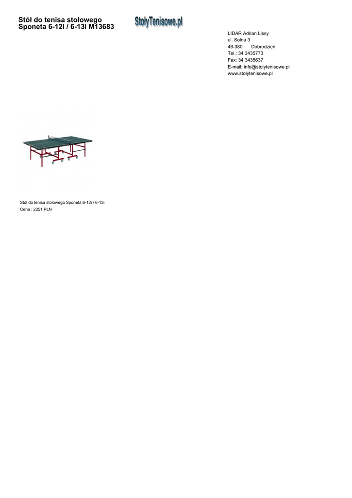 Stół do tenisa stołowego Sponeta 6-12i / 6-13i M13683 LIDAR Adrian Lissy ul. Solna 3 46-380 Dobrodzień Tel.: 34 3435773 Fax: 34 3435637 E-mail: [email protected] www.stolytenisowe.pl Stół do tenisa stołowego Sponeta 6-12i / 6-13i Cena : 2251 PLN