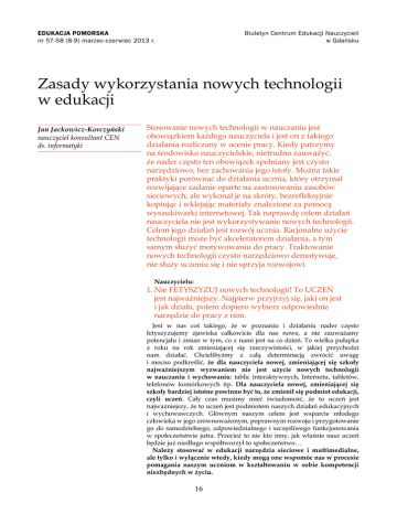 Biuletyn Centrum Edukacji Nauczycieli w Gdańsku EDUKACJA POMORSKA nr 57-58 (8-9) marzec-czerwiec 2013 r. Zasady wykorzystania nowych technologii w edukacji Jan Jackowicz-Korczyński nauczyciel konsultant CEN ds. informatyki Stosowanie nowych technologii w nauczaniu jest obowiązkiem każdego nauczyciela i jest on z takiego działania rozliczany w ocenie pracy. Kiedy patrzymy na środowisko nauczycielskie, nietrudno zauważyć, że nader często ten obowiązek spełniany jest czysto narzędziowo, bez zachowania jego istoty. Można takie praktyki porównać do działania ucznia, który otrzymał rozwijające zadanie oparte na zastosowaniu zasobów sieciowych, ale wykonał je na skróty, bezrefleksyjnie kopiując i wklejając materiały znalezione za pomocą wyszukiwarki internetowej. Tak naprawdę celem działań nauczyciela nie jest wykorzystywanie nowych technologii. Celem jego działań jest rozwój ucznia. Racjonalne użycie technologii może być akceleratorem działania, a tym samym służyć motywowaniu do pracy. Traktowanie nowych technologii czysto narzędziowo demotywuje, nie służy uczeniu się i nie sprzyja rozwojowi. Nauczycielu: 1.Nie FETYSZYZUJ nowych technologii! To UCZEŃ jest najważniejszy. Najpierw przyjrzyj się, jaki on jest i jak działa, potem dopiero wybierz odpowiednie narzędzie do pracy z nim. Jest w nas coś takiego, że w poznaniu i działaniu nader często fetyszyzujemy zjawiska całkowicie dla nas nowe, a nie zauważamy potencjału i zmian w tym, co z nami jest na co dzień. To wielka pułapka z roku na rok zmieniającej się rzeczywistości, w jakiej przychodzi nam działać. Chcielibyśmy z całą determinacją zwrócić uwagę i mocno podkreślić, że dla nauczyciela nowej, zmieniającej się szkoły najważniejszym wyzwaniem nie jest użycie nowych technologii w nauczaniu i wychowaniu: tablic interaktywnych, Internetu, tabletów, telefonów komórkowych itp. Dla nauczyciela nowej, zmieniającej się szkoły bardziej istotne powinno być to, że zmienił się podmiot edukacji, czyli uczeń. Cały czas musimy mieć świadomość, że to uczeń jest najważniejszy, że to uczeń jest podmiotem naszych działań edukacyjnych i wychowawczych. Głównym naszym celem jest wsparcie młodego człowieka w jego zrównoważonym, poprawnym rozwoju i przygotowanie go do samodzielnego, odpowiedzialnego i szczęśliwego funkcjonowania w społeczeństwie jutra. Przecież to nie kto inny, jak właśnie nasz uczeń będzie już niedługo współtworzył to społeczeństwo… Należy stosować w edukacji narzędzia sieciowe i multimedialne, ale tylko i wyłącznie wtedy, kiedy mogą one wspomóc nas w procesie pomagania naszym uczniom w kształtowaniu w sobie kompetencji niezbędnych w życiu. 16 Biuletyn Centrum Edukacji Nauczycieli w Gdańsku Fot. B. Kwaśniewska EDUKACJA POMORSKA nr 57-58 (8-9) marzec-czerwiec 2013 r. Warto przy tej okazji przypomnieć o zmianach, jakie zauważamy u współczesnych uczniów. Ta wiedza powinna pomagać nam w rozumieniu naszych podopiecznych i ułatwiać pracę z nimi. A zatem: jacy są obecnie uczniowie? Przydatne zestawienie cech współczesnych młodych ludzi zawiera prezentacja Witolda Kołodziejczyka i jego wykład. Jak tworzyć przestrzeń dla kreatywności ucznia w szkole? (www.cen.gda.pl). UWAGA! Nie mierz swoich uczniów wyłącznie tą miarą. Generalnie, jak łatwo zauważyć, oni rzeczywiście mają takie cechy, jak przedstawiono w ww. opracowaniu. Ale są też konkretnymi uczniami w uwarunkowaniach konkretnych rodzin i środowiska rówieśniczego. Musisz samemu przyjrzeć się swoim uczniom, a raczej ustawicznie poznawać, jacy są. Oni ciągle będą się zmieniać i jeszcze nie raz niejednym nas zaskoczą. Ale bez naszego zaprzyjaźnienia się z tym, jacy są naprawdę i naszego pozytywnego nastawienia do ich procesu rozwoju, wszelkie stosowane przez nas techniki nauczania i wychowania, a już w szczególności próby zapunktowania naszą nowoczesnością poprzez użycie nowych technologii będą co najwyżej żałosne, na pewno bardziej szkodliwe niż pożyteczne. A teraz, nauczycielu, spróbuj przyjrzeć się swoim uczniom, a jeśli nie widzisz, jacy naprawdę są, zacznij się interesować się tym, jakimi się stają… Może warto czasami stracić trochę czasu na „pogaduchy” lekcyjne kosztem materiału, którego i tak nigdy nie zrealizujesz w 100%? 17 I jeszcze jedna uwaga, która wydaje się bardzo ważna. Długoletnia praktyka nauczycielska pozbawiła nas złudzeń: nauczyciel nie dokona cudu, jeśli uczeń nie będzie sam chciał zmiany. Nie zwalnia nas to jednak z obowiązku ponawiania nieustannych prób dotarcia do niego i wykrzesania w nim chociaż iskierki czegoś więcej niż ludyczne i konsumpcyjne zabijanie czasu. 2.Technologie się zmieniają. Powstają nowe narzędzia. Nigdy nie będziesz w stanie panować nad wszystkim. Musisz ROZUMIEĆ, JAK DZIAŁAJĄ te narzędzia. Znajdziesz odpowiednie, kiedy będziesz go potrzebował, może wczoraj jeszcze takiego narzędzia nie było. Obecnie mamy dostęp do przerażająco wręcz dużej liczby narzędzi elektronicznych. Warto jednak wiedzieć, że wszystkie one działają podobnie i w oparciu o takie same powszechnie dostępne funkcje. Jeszcze rok temu zajmowałem się inwentaryzowaniem tych narzędzi i pisaniem ich rekomendacji, polecaniem w blogowych zapiskach. Obecnie powstaje ich tak dużo, że nie mam już możliwości bycia na bieżąco w tej tematyce. Zresztą nasi uczniowie, nawet ci najbardziej biegli w nowych technologiach, znają tylko niewielką część dostępnych możliwości. Najczęściej posługują się biegle tylko Biuletyn Centrum Edukacji Nauczycieli w Gdańsku EDUKACJA POMORSKA nr 57-58 (8-9) marzec-czerwiec 2013 r. narzędziami umożliwiającymi im zabawę, kontakty z rówieśnikami na portalach społecznych czy konsumowanie ulubionych multimediów przez sieć… Czyli to wszystko, co zabiera im czas, uzależnia i wciąga… Jeśli chce