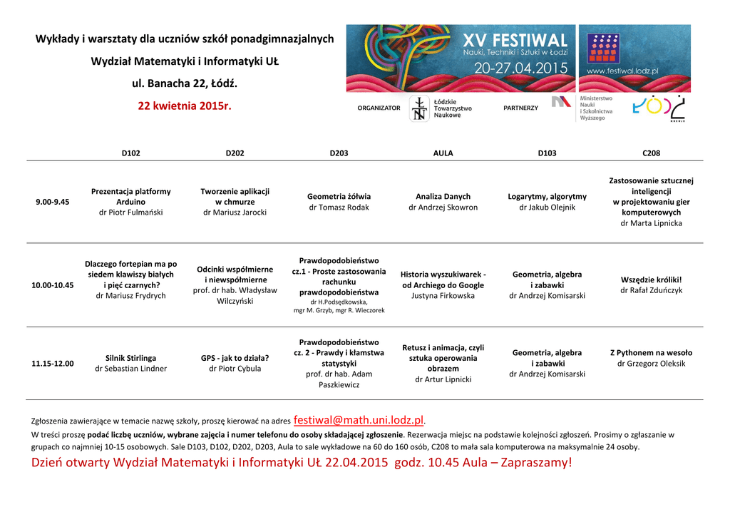 Wykłady i warsztaty dla uczniów szkół ponadgimnazjalnych Wydział Matematyki i Informatyki UŁ ul. Banacha 22, Łódź. 22 kwietnia 2015r. 9.00-9.45 10.00-10.45 11.15-12.00 D102 D202 Prezentacja platformy Arduino dr Piotr Fulmański Tworzenie aplikacji w chmurze dr Mariusz Jarocki Dlaczego fortepian ma po siedem klawiszy białych i pięć czarnych? dr Mariusz Frydrych Silnik Stirlinga dr Sebastian Lindner Odcinki współmierne i niewspółmierne prof. dr hab. Władysław Wilczyński GPS - jak to działa? dr Piotr Cybula Zgłoszenia zawierające w temacie nazwę szkoły, proszę kierować na adres D203 AULA D103 C208 Geometria żółwia dr Tomasz Rodak Analiza Danych dr Andrzej Skowron Logarytmy, algorytmy dr Jakub Olejnik Zastosowanie sztucznej inteligencji w projektowaniu gier komputerowych dr Marta Lipnicka Prawdopodobieństwo cz.1 - Proste zastosowania rachunku prawdopodobieństwa Historia wyszukiwarek od Archiego do Google Justyna Firkowska Geometria, algebra i zabawki dr Andrzej Komisarski Wszędzie króliki! dr Rafał Zduńczyk Retusz i animacja, czyli sztuka operowania obrazem dr Artur Lipnicki Geometria, algebra i zabawki dr Andrzej Komisarski dr H.Podsędkowska, mgr M. Grzyb, mgr R. Wieczorek Prawdopodobieństwo cz. 2 - Prawdy i kłamstwa statystyki prof. dr hab. Adam Paszkiewicz Z Pythonem na wesoło dr Grzegorz Oleksik [email protected]. W treści proszę podać liczbę uczniów, wybrane zajęcia i numer telefonu do osoby składającej zgłoszenie. Rezerwacja miejsc na podstawie kolejności zgłoszeń. Prosimy o zgłaszanie w grupach co najmniej 10-15 osobowych. Sale D103, D102, D202, D203, Aula to sale wykładowe na 60 do 160 osób, C208 to mała sala komputerowa na maksymalnie 24 osoby. Dzień otwarty Wydział Matematyki i Informatyki UŁ 22.04.2015 godz. 10.45 Aula – Zapraszamy!
