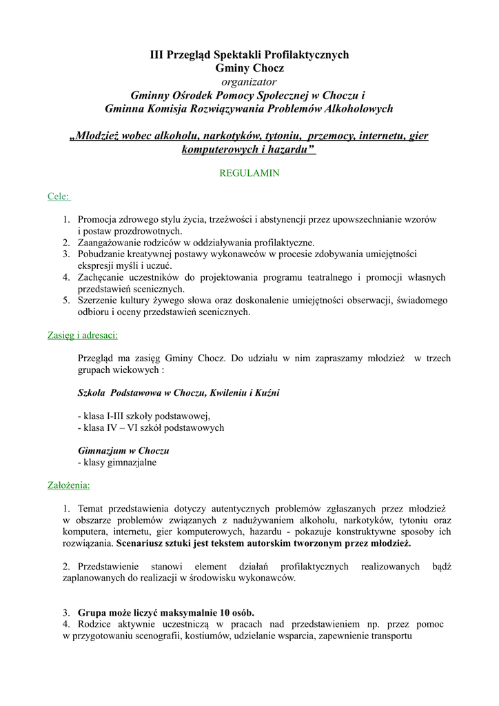 III Przegląd Spektakli Profilaktycznych Gminy Chocz organizator Gminny Ośrodek Pomocy Społecznej w Choczu i Gminna Komisja Rozwiązywania Problemów Alkoholowych „Młodzież wobec alkoholu, narkotyków, tytoniu, przemocy, internetu, gier komputerowych i hazardu” REGULAMIN Cele: 1. Promocja zdrowego stylu życia, trzeźwości i abstynencji przez upowszechnianie wzorów i postaw prozdrowotnych. 2. Zaangażowanie rodziców w oddziaływania profilaktyczne. 3. Pobudzanie kreatywnej postawy wykonawców w procesie zdobywania umiejętności ekspresji myśli i uczuć. 4. Zachęcanie uczestników do projektowania programu teatralnego i promocji własnych przedstawień scenicznych. 5. Szerzenie kultury żywego słowa oraz doskonalenie umiejętności obserwacji, świadomego odbioru i oceny przedstawień scenicznych. Zasięg i adresaci: Przegląd ma zasięg Gminy Chocz. Do udziału w nim zapraszamy młodzież w trzech grupach wiekowych : Szkoła Podstawowa w Choczu, Kwileniu i Kuźni - klasa I-III szkoły podstawowej, - klasa IV – VI szkół podstawowych Gimnazjum w Choczu - klasy gimnazjalne Założenia: 1. Temat przedstawienia dotyczy autentycznych problemów zgłaszanych przez młodzież w obszarze problemów związanych z nadużywaniem alkoholu, narkotyków, tytoniu oraz komputera, internetu, gier komputerowych, hazardu - pokazuje konstruktywne sposoby ich rozwiązania. Scenariusz sztuki jest tekstem autorskim tworzonym przez młodzież. 2. Przedstawienie stanowi element działań profilaktycznych zaplanowanych do realizacji w środowisku wykonawców. realizowanych bądź 3. Grupa może liczyć maksymalnie 10 osób. 4. Rodzice aktywnie uczestniczą w pracach nad przedstawieniem np. przez pomoc w przygotowaniu scenografii, kostiumów, udzielanie wsparcia, zapewnienie transportu Wymagania: 1. Czas trwania przedstawienia – do 20 minut, plus łączny czas na montaż i demontaż scenografii 10 minut. 2. Każda szkoła może wystawić do konkursu od 1 zespół. Kryteria oceny: Profesjonalne jury podda ocenie: (karty oceny dla każdego zespołu) Konstruktywny, profilaktyczny przekaz treści, Przekaz dostosowany do wieku odbiorców, Autentyczność wypowiedzi młodych ludzi, Poziom artystyczny spektaklu, Reakcję publiczności na spektakl, Skład jury: - przedstawiciel Urzędu Miasta Gminy w Choczu - przedstawiciel Komisji Oświaty, Kultury i Polityki Społecznej- Rady Miejskiej Gminy w Choczu - przedstawiciel Gminnego Ośrodka Pomocy Społecznej w Choczu - przedstawiciel GKRPA - przedstawiciel Starostwa Powiatu - przedstawiciel Sądu w Pleszewie Sprawy organizacyjne: 1. Przegląd odbędzie się w maju 2016 r. w Gminnym Ośrodku Kultury w Choczu 2. Przegląd ma charakter jednoetapowy. 3. Warunkiem uczestnictwa w Przeglądzie jest przesłanie zgłoszenia do Gminnego Ośrodka Pomocy Społecznej w Choczu w terminie do 25.03.2016 r. Postanowienia końcowe: 1. 2. 3. 4. 5. Postanowienia niniejszego regulaminu są wyłączną podstawą prowadzenia konkursu a ich wykładnia i interpretacja należy do organizatora. Organizator zastrzega sobie prawo do zmiany zasad konkursu i treści regulaminu. Organizator zastrzega sobie możliwość odwołania konkursu w każdym czasie. Zespoły powinny mieć odpowiednią liczbę opiekunów, gwarantujących porządek i bezpieczeństwo uczestników. Nadesłanie karty zgłoszenia jest jednoznaczne z akceptacją regulaminu konkursu. Przewidywane nagrody w konkursie: miejsce I – Dyplom za zajęcie I miejsca oraz nagrody rzeczowe miejsce II – Dyplom za zajęcie II miejsca oraz nagrody rzeczowe miejsce III – Dyplom za zajęcie III miejsca oraz nagrody rzeczowe Organizatorzy: Gminny Ośrodek Pomocy Społecznej w Choczu, Gminną Komisją Rozwiązywania Problemów Alkoholowych. W przypadku pytań, wątpliwości uprzejmie proszę o kontakt Małgorzata Woldańska – Kierownik GOPS w Choczu Pełnomocnik Wójta Gminy Chocz ds. Rozwiązywania Problemów Alkoholowych i NarkomaniiTel. 602 645 762