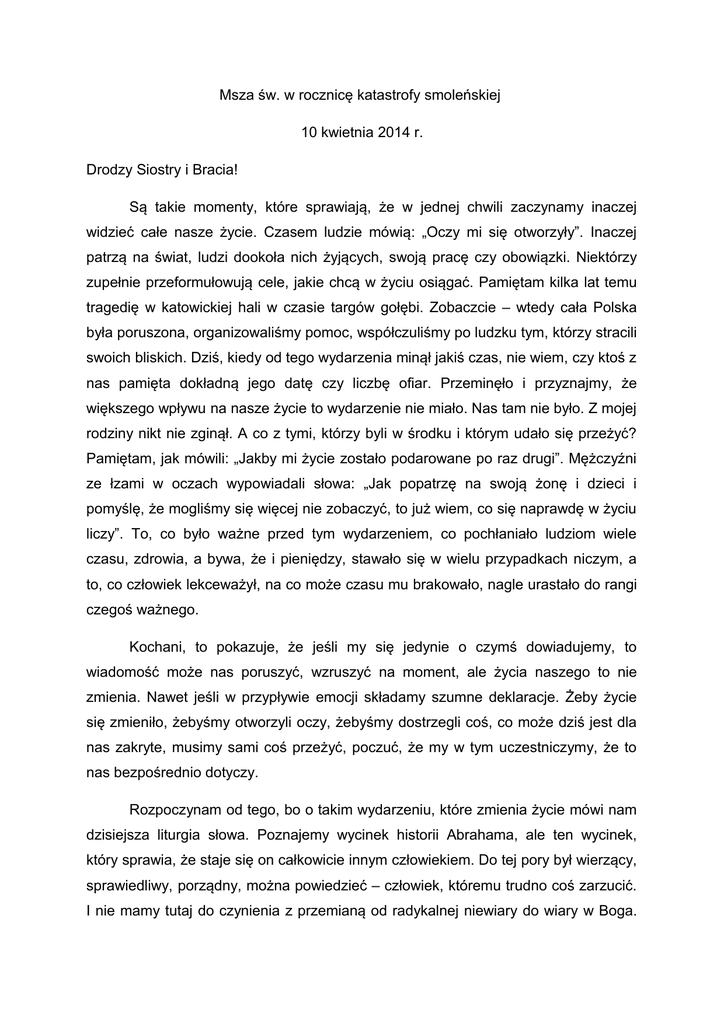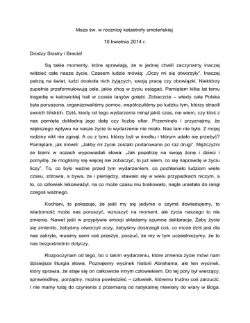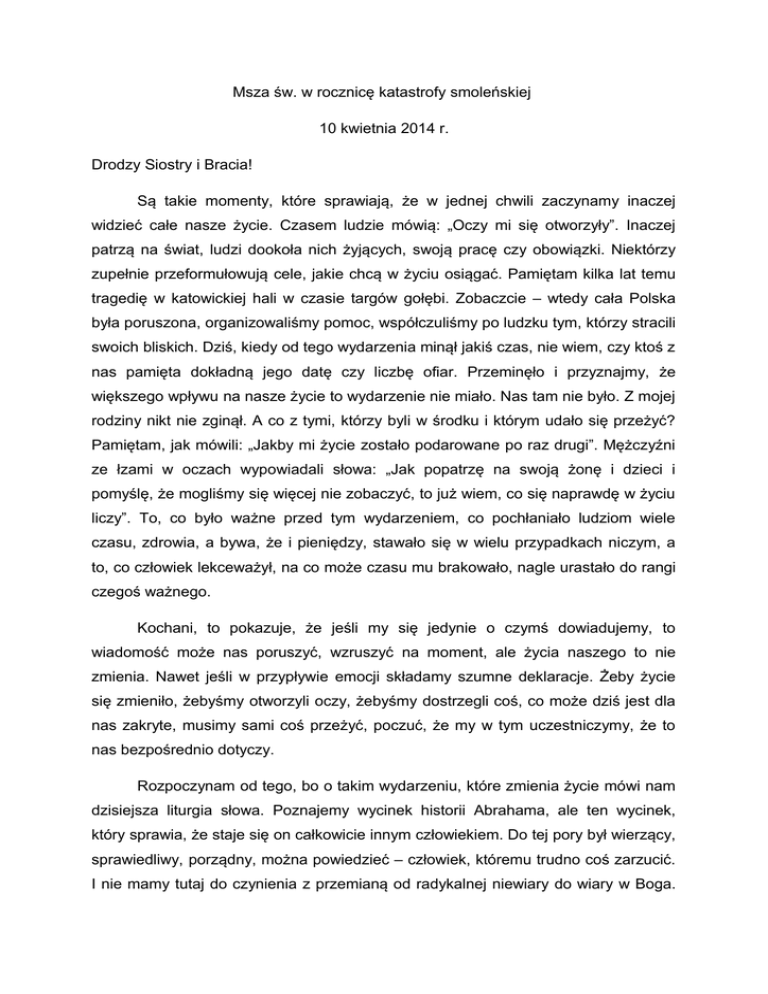Msza św. w rocznicę katastrofy smoleńskiej 10 kwietnia 2014 r. Drodzy Siostry i Bracia! Są takie momenty, które sprawiają, że w jednej chwili zaczynamy inaczej widzieć całe nasze życie. Czasem ludzie mówią: „Oczy mi się otworzyły”. Inaczej patrzą na świat, ludzi dookoła nich żyjących, swoją pracę czy obowiązki. Niektórzy zupełnie przeformułowują cele, jakie chcą w życiu osiągać. Pamiętam kilka lat temu tragedię w katowickiej hali w czasie targów gołębi. Zobaczcie – wtedy cała Polska była poruszona, organizowaliśmy pomoc, współczuliśmy po ludzku tym, którzy stracili swoich bliskich. Dziś, kiedy od tego wydarzenia minął jakiś czas, nie wiem, czy ktoś z nas pamięta dokładną jego datę czy liczbę ofiar. Przeminęło i przyznajmy, że większego wpływu na nasze życie to wydarzenie nie miało. Nas tam nie było. Z mojej rodziny nikt nie zginął. A co z tymi, którzy byli w środku i którym udało się przeżyć? Pamiętam, jak mówili: „Jakby mi życie zostało podarowane po raz drugi”. Mężczyźni ze łzami w oczach wypowiadali słowa: „Jak popatrzę na swoją żonę i dzieci i pomyślę, że mogliśmy się więcej nie zobaczyć, to już wiem, co się naprawdę w życiu liczy”. To, co było ważne przed tym wydarzeniem, co pochłaniało ludziom wiele czasu, zdrowia, a bywa, że i pieniędzy, stawało się w wielu przypadkach niczym, a to, co człowiek lekceważył, na co może czasu mu brakowało, nagle urastało do rangi czegoś ważnego. Kochani, to pokazuje, że jeśli my się jedynie o czymś dowiadujemy, to wiadomość może nas poruszyć, wzruszyć na moment, ale życia naszego to nie zmienia. Nawet jeśli w przypływie emocji składamy szumne deklaracje. Żeby życie się zmieniło, żebyśmy otworzyli oczy, żebyśmy dostrzegli coś, co może dziś jest dla nas zakryte, musimy sami coś przeżyć, poczuć, że my w tym uczestniczymy, że to nas bezpośrednio dotyczy. Rozpoczynam od tego, bo o takim wydarzeniu, które zmienia życie mówi nam dzisiejsza liturgia słowa. Poznajemy wycinek historii Abrahama, ale ten wycinek, który sprawia, że staje się on całkowicie innym człowiekiem. Do tej pory był wierzący, sprawiedliwy, porządny, można powiedzieć – człowiek, któremu trudno coś zarzucić. I nie mamy tutaj do czynienia z przemianą od radykalnej niewiary do wiary w Boga. Absolutnie. Abraham w czasie rozmowy z Bogiem, której fragment usłyszeliśmy w pierwszym czytaniu, miał 99 lat. Nie ulega wątpliwości, że zdobył już pewną mądrość życiową. Mogło mu się wydawać, że w jego życiu wszystko już jest poukładane. Wiedział i pogodził się z tym, że ze swoją żoną nie będzie miał potomstwa. Wszystko za tym przemawiało. I nagle w to logicznie poukładane życie wkracza Bóg i mówi: Abrahamie – nie jedno, ale będziesz miał mnóstwo dzieci i twoi potomkowie będą zasiadać na tronach. Nie ukrywajmy, że w pierwszym odruchu słowa Boga mogły temu człowiekowi wydawać się nielogiczne, całkowicie niedorzeczne. Abraham mógł powiedzieć: moja wiedza o świecie i moje doświadczenie przeczą temu, co mówi Bóg. Ale w tej historii Abraham przekonuje się o jednym: że to nie on ma mieć swoje życie pod kontrolą, że jego życie i bieg świata kontroluje i prowadzi Bóg. To ogromny przewrót w życiu Abrahama. Świadczy o tym zmiana jego imienia. W tamtej kulturze imię nie tylko wskazywało na daną osobę, ale także na jej misję. Zmiana imienia oznacza zmianę przeznaczenia. W jednym momencie zmienia się cel życia Abrahama. To jest metoda działania Boga. Bóg nie mówi człowiekowi: „zmień się” czy „zmień swoje postępowanie”. Bóg chce żebyśmy zmieniali się od środka. Zmienia nam imię. Zmienić postępowanie można na chwilę, bo mam w tym jakiś interes, bo to mi się opłaca. Mogę w danym momencie zaprzestać jakiegoś działania. Ale zmiana postawy, nastawienia, zmiana, która dokonuje się w nas, to coś o wiele głębszego. Kiedy rozważam ten moment z życia Abrahama, przypomina mi się rozmowa papieża Franciszka z rabinem Buenos Aires zapisana w książce W niebie i na ziemi. Papież rozważa tam historię Hioba i zwraca uwagę na słowa wypowiedziane przez tego człowieka w momencie, gdy zaczęły go trapić różne nieszczęścia. Hiob mówi do Boga: „Do tej pory znałem Cię ze słyszenia. Teraz poznało Cię moje serce” i wspaniale zauważył Ojciec święty, że wielu ludzi zna Boga tylko ze słyszenia. Układają świat po swojemu, wprowadzają swoje zasady i chcą sami decydować o swoim losie. Chcą mieć pod kontrolą swoje życie, innych ludzi, podczas gdy pewne niespodziewane sytuacje sprawiają, że zaczynają Boga poznawać sercem i papież kończy stwierdzeniem: „Zachęcam ludzi, by nie chcieli znać Boga tylko ze słyszenia”. Można zaryzykować stwierdzenie, że do tej pory Abraham znał Boga tylko ze słyszenia. Dopiero zmiana, jaka dokonała się w jego życiu, sprawiła, że poznał Go sercem. Potrzebne było mu to przekonanie, że nie ja mam wszystko pod kontrolą, nie moje logiczne przemyślenia, układy, to nie ja decyduję o losach świata… Abraham musiał uświadomić sobie, że jest tylko przechodniem na tej ziemi. Ale to Bóg wszystko prowadzi. Niestety taka zmiana myślenia nie jest rzeczą prostą. Kiedy Jezus usiłował dokładnie tę prawdę przypomnieć Izraelitom, ci chwycili kamienie i chcieli się go pozbyć. Ludzie często wolą żyć ułudą, że oni sami mogą ten świat urządzić. Że nikogo nie potrzebują, że wystarczą nasze układy, gry i ludzkie zabezpieczenia. Sami, bez Boga…, a nawet czasem wbrew Bogu. Jestem przekonany, że to nie przypadek, iż właśnie dziś, kiedy przeżywamy czwartą rocznicę katastrofy smoleńskiej i modlimy się za wszystkich, którzy w niej zginęli, otrzymujemy takie, a nie inne słowo Boże. Ono jest zawsze żywe i ma zawsze rzucać światło na to, czym żyje