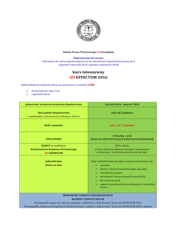 SzkołaPrawaProcesowegoAdExemplum RepetytoriumProcesowe skierowanedoosóbprzygotowującychsiędozawodowychegzaminówprawniczych [egzaminradcowski2016iegzaminadwokacki2016] kursintensywny ADEFFECTUM2016 ZałącznikamidoniniejszejofertysąwywieszonewsystemieADEX: Ø Ø harmonogramzajęćoraz regulaminkursu. planowanyterminprowadzeniaRepetytorium styczeń2016-marzec2016 ilośćgodzinRepetytorium min.82,5godziny wjednostkachszkoleniowychSzkołypo40min min.107casusów ilośćcasusów CENAKURSU 1750PLN+VAT [cenazacałośćkursuprzyjednorazowejpłatności] RABATnapublikacje 50%rabatu WydawnictwaNaukowo-Prawniczego ADEXEMPLUM wtymofertaspecjalnanaskryptyikomentarze praktyczne–materiałypomocniczedozajęć indywidualne stały,nielimitowanydostępwczasietrwaniakursudo: kontaon-line → casusów, → filmówzkonwersatoriów[adm,um,kar], → rozwiązańcasusów, → prezentacjiiopracowanychmateriałów, → listorzeczniczych. → nagrańkonwersatoriówzwiązanychztematyką kursu. MOŻLIWOŚĆZAKUPUPOSZCZEGÓLNYCH BLOKÓWTEMATYCZNYCH Wprzypadkuzapisunacałykursprosimyowybraniez„listykursów”kursuADEFFECTUM2016. Wprzypadkuzakupuposzczególnychblokówprosimyowybórz„listykursów”kursuADEFFECTUM2016zopisem WYBRANEGOBLOKU blokCYWILNY 499PLN+VAT (wtymzasadykonstruowaniaopiniiprawnych) blokUMOWY 450PLN+VAT blokADMINISTRACYJNY 450PLN+VAT blokKARNY 450PLN+VAT blokETYKA(ADW) 350PLN+VAT blokETYKA(RAD) 350PLN+VAT więcejinformacjinatematRepetytoriumdostępnychjest: podadresemmailowymSekretariatu: podtelefonami: [email protected] +48881717888 +48883939388 bądźnastronieinternetowejSzkoły, pozalogowaniudosystemuinformatycznegoSzkoły– ADEX www.adexemplum.com wkwestiachksięgowych: [email protected] I.SzkołaPrawaProcesowegoADEXEMPLUM Szkoła Prawa Procesowego AD Exemplum powstała kilka lat temu z pasji ludzi kochających proces i nauczanie, lubiących dzielić się swoją wiedzą i dyskutować godzinami o prawie… Jesteśmy pasjonatami. Każdy z nas w jakimś stopniu żyje procesem, zajmuje się nim na co dzień, realizuje się w nim zawodowo. Staramy się tą pasją dzielić, pokazywaćnajciekawszeobliczaprawaoraznauczać,jakpraktycznieiprocesowowykorzystywaćzdobytąjużwiedzę prawniczą. Zrzeszamy w swoich szeregach wybitnych i wyróżniających się praktyków, specjalistów w swoich dziedzinach – sędziów, radców prawnych, adwokatów, prokuratorów – ludzi, którzy w swoich środowiskach są cenionymi fachowcami i autorytetami. Wykładowcy Szkoły to osoby o szerokiej wiedzy i minimum kilkunastoletnim doświadczeniuzawodowym,atakże(imożeprzedewszystkim)zogromnymtalentemdydaktycznymiumiejętnością jasnego,prostegoiprzystępnegoprzekazywaniawiedzy. II.celRepetytorium Celem repetytorium jest powtórzenie, poszerzenie i utrwalenie wiedzy oraz umiejętności z zakresu konstruowania pismprocesowychiumówprzeznaczonedlaprawnikówpraktyków. III.zajęcia ZajęciadydaktyczneoferowanewramachRepetytoriumobejmują: konwersatoria, ćwiczenia. Przedstawiony podział zajęć jest synergią naszego doświadczenia, wypracowanego na jego podstawie systemu nauczaniaitechnikutrwalaniawiedzy. Ø Ø IV.WYKŁADOWCY WykładowcaminaRepetytoriumsąwyłączniepraktycymającykilkunastoletniedoświadczeniezawodowe[naogół 10-20 letnie] oraz umiejętności dydaktyczne. Wszyscy Wykładowcy są czynni zawodowo i na co dzień wykonują czynności procesowe bądź konstruują umowy. Znacząca część Wykładowców ma doświadczenie egzaminacyjne obejmujące tak egzaminy ministerialne, jak i wcześniejsze egzaminy korporacyjne oraz wiedzę w zakresie zasad konstruowaniairozwiązywaniacasusów. Wśród Wykładowców są Sędziowie Sądów Apelacyjnych, Okręgowych i Rejonowych, Prokuratorzy Prokuratur Okręgowych, doświadczeni radcowie prawni i adwokaci, starsi radcowie i radcowie Prokuratorii Generalnej Skarbu Państwa,partnerzyspółekprawniczych,atakżedoktorzynaukprawnych. OdpoczątkuzałożeniaSzkołyKadraWykładowcówrozrosłasiędogronaokoło60osób. Repetytorium będzie prowadzone przez najbardziej doświadczonych i najwyżej ocenianych przez Państwa WykładowcówSzkoły. V.organizacjazajęć Kursodbędziesięwokresiestyczeń2016–marzec2016,wczterechblokachtematycznych.Proponowaneterminy zajęćzostaływskazanewharmonogramie.Zastrzegasięjednakmożliwośćzmianyproponowanychterminówzajęć,z uwaginaPaństwazajęciaikolokwiaorazinneokolicznościzwiązanezprzyczynaminiezależnymiodSzkoły. KONWERSATORIA KonwersatoriapozwalająnaprzybliżeniePaństwuzasadkonstruowaniaposzczególnychpismprocesowychiumów, czyli przekazanie wszystkich informacji, które będą niezbędne (i wymagane) w dalszej części Repetytorium do samodzielnego rozwiązywania casusów i konstruowania na ich podstawie pism procesowych. Proces edukacyjny w zakresie tej tematyki pogłębiany jest casusami domowymi służącymi przećwiczeniu i utrwaleniu poszczególnych zasad.Państwarozwiązaniacasusówsąpoddawaneocenieiweryfikacji,wtokukolejnegokonwersatorium/ćwiczeńz danejdziedziny. Dodatkowo w systemie ADEX wywieszane są prawidłowe rozwiązania z sugerowaną treścią zarzutów i wniosków, bądźtreściąklauzulumownych. ĆWICZENIA Zajęcia ćwiczeniowe służą omówieniu określonych instytucji prawa procesowego i materialnego na przykładzie analizowanychcasusówwformieaktsądowych.Celemzajęććwiczeniowychjestwskazaniezasadustalaniabłędów popełnionychprzezsądyIinstancji,ocenianaichwagiapelacyjnejorazmerytorycznerozwiązaniecasusu.Dodatkowo także omawiane i prezentowane są techniki rozwiązywania casusów egzaminacyjnych. Zajęcia ćwiczeniowe służą takżeutrwaleniuprawidłowychzasadkonstruowaniapismprocesowych. Dodatkowo w systemie ADEX wywieszane są prawidłowe rozwiązania casusów omawianych na zajęciach ćwiczeniowychzsugerowanątreściązarzutówiwniosków,bądźtreściąumowy. VI.programmerytoryczny-casusy Przygotowując program merytoryczny Repetytorium korzystaliśmy z wiedzy i doświadczenia naszych Wyk