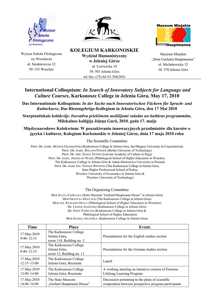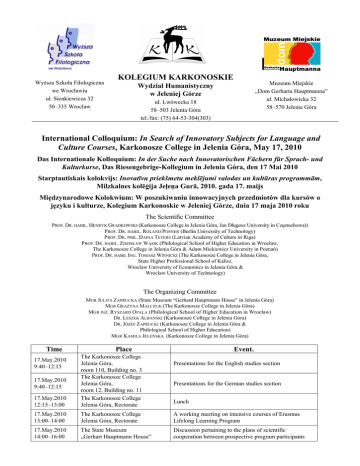WyŜsza Szkoła Filologiczna we Wrocławiu ul. Sienkiewicza 32 50–335 Wrocław KOLEGIUM KARKONOSKIE Muzeum Miejskie „Dom Gerharta Hauptmanna” ul. Michałowicka 32 58–570 Jelenia Góra Wydział Humanistyczny w Jeleniej Górze ul. Lwówecka 18 58–503 Jelenia Góra tel./fax: (75) 64-53-304(303) International Colloquium: In Search of Innovatory Subjects for Language and Culture Courses, Karkonosze College in Jelenia Góra, May 17, 2010 Das Internationale Kolloquium: In der Suche nach Innovatorischen Fächern für Sprach- und Kulturkurse, Das Riesengebrige-Kollegium in Jelenia Góra, den 17 Mai 2010 Starptautiskais kolokvijs: Inovatīvu priekšmetu meklējumi valodas un kultūras programmām, Milzkalnes kolēăija JeĜeĦa Gurā, 2010. gada 17. maijs Międzynarodowe Kolokwium: W poszukiwaniu innowacyjnych przedmiotów dla kursów o języku i kulturze, Kolegium Karkonoskie w Jeleniej Górze, dnia 17 maja 2010 roku The Scientific Committee PROF. DR. HABIL. HENRYK GRADKOWSKI (Karkonosze College in Jelenia Góra, Jan Długosz University in Częstochowa)) PROF. DR. HABIL. ROLAND POSNER (Berlin University of Technology) PROF. DR. PHIL. DAINA TETERS (Latvian Academy of Culture in Riga) PROF. DR. HABIL. ZDZISŁAW WĄSIK (Philological School of Higher Education in Wrocław, The Karkonosze College in Jelenia Góra & Adam Mickiewicz University in Poznań) PROF. DR. HABIL ING. TOMASZ WINNICKI (The Karkonosze College in Jelenia Góra, State Higher Professional School of Kalisz, Wroclaw University of Economics in Jelenia Góra & Wroclaw University of Technology) The Organizing Committee MGR JULITA ZAPRUCKA (State Museum “Gerhard Hauptmann House” in Jelenia Góra) MGR GRAśYNA MALCZUK (The Karkonosze College in Jelenia Góra) MGR INś. RYSZARD OPALA (Philological School of Higher Education in Wrocław) DR. LESZEK ALBAŃSKI (Karkonosze College in Jelenia Góra) DR. JÓZEF ZAPRUCKI (Karkonosze College in Jelenia Góra & Philological School of Higher Education) MGR KAMILA JELEŃSKA (Karkonosze College in Jelenia Góra) Time Place Event. 17.May.2010 12:15–13:00 The Karkonosze College Jelenia Góra, room 110, Building no. 3 The Karkonosze College Jelenia Góra, room 12, Building no. 11 The Karkonosze College Jelenia Góra, Rectorate 17.May.2010 13:00–14:00 The Karkonosze College Jelenia Góra, Rectorate A working meeting on intensive courses of Erasmus Lifelong Learning Program 17.May.2010 14:00–16:00 The State Museum „Gerhart Hauptmann House” Discussion pertaining to the plans of scientific cooperation between prospective program participants 17.May.2010 9:40–12:15 17.May.2010 9:40–12:15 Presentations for the English studies section Presentations for the German studies section Lunch The topic of the colloquium is addressed to students and faculty of The Karkonosze College. The presentations lasting 20 – 30 minutes will be delivered in two separate sessions for the students of English and German studies (in English and German respectively). ENGLISH SECTION (chair: TOMASZ WINNICKI) (1) Theoretical and Applied Aspects of Communicology by RICHARD L. LANIGAN, International Communicology Institute, Washington, DC & Southern University at Carbondale, IL, USA (2) The Self in Transactional Communication by ELZBIETA WASIK, Adam Mickiewicz University in Poznan; Poland; (3) Language in Relation to Man: The Scope and Tasks of Anthropological Linguistics by PIOTR P. CHRUSZCZEWSKI, University of Wrocław & Philological School of Higher Education in Wrocław, Poland; (4) Proxemics and Territoriality in Communicative Behavior of Man by MIKOLAJ SOBOCIŃSKI, The Casimir the Great University in Bydgoszcz, Poland; (5) The Discourse of Ecology: Bridging the Subject-Matter of Natural Sciences and Humanities by TOMASZ WINNICKI, The Karkonosze College in Jelenia Góra, State Higher Professional School of Kalisz, Wroclaw University of Economics in Jelenia Góra & Wroclaw University of Technology, Poland; GERMAN SECTION (chair: ZDZISŁAW WĄSIK) (1) Die Literaturinterpretation als Zeichenprozess (am Beispiel von Johann Wolfgang Goethes Gedicht “An den Mond”) [Literary Interpretation as a Sign Process (as exemplified by Johann Wolfgang Goethe’s Poem “An den Mond”)] by ROLAND POSNER, Technical University of Berlin, Germany; (2) Imaginative Architektur und Verbale Beschreibung der Leere: Wege und Strassen [Imaginative Architecture and the Verbal Description of Emptiness: Ways and Roads] by DAINA TETERS, Latvian Academy of Culture in Riga, Latvia; (3) Semiotische Substrate und Interferenzen in der Formierung der Regionalen Identität (am Beispiel des literarischen und kulturellen Erbes in Schlesien [Semiotic Substrates and Interferences in the Formation of Regional Identity (on the Basis of Cultural and Literary Heritage in Silesia)] by JOZEF ZAPRUCKI, The Karkonosze College in Jelenia Góra & Philological School of Higher Education in Wrocław, Poland; (4) Die diskursive Natur der zwischenmenschlichen Handlungen in sprachlichen und kulturellen Ekosystemen [The Discursive Nature of Human Interactions in Linguistic and Cultural Ecosystems] by ZDZISLAW WĄSIK, Philological School of Higher Education in Wrocław, The Karkonosze College in Jelenia Góra & Adam Mickiewicz University in Poznań, Poland. www.kk.jgora.pl www.wsf.edu.pl www.muzeum-dgh.pl