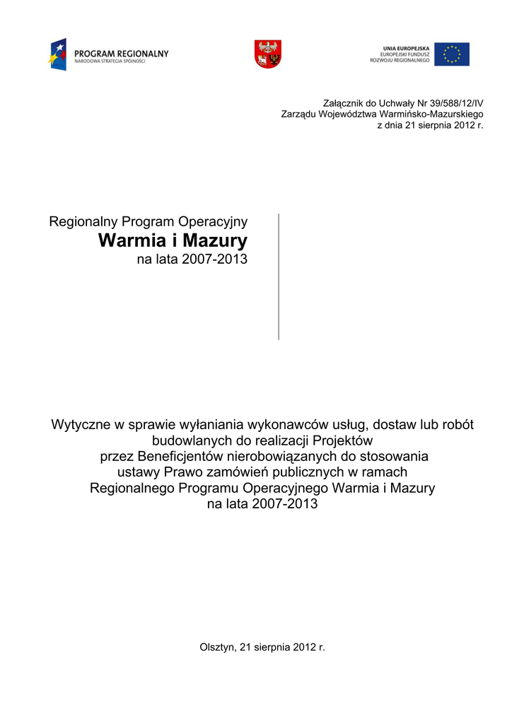Załącznik do Uchwały Nr 39/588/12/IV Zarządu Województwa Warmińsko-Mazurskiego z dnia 21 sierpnia 2012 r. Regionalny Program Operacyjny Warmia i Mazury na lata 2007-2013 Wytyczne w sprawie wyłaniania wykonawców usług, dostaw lub robót budowlanych do realizacji Projektów przez Beneficjentów nierobowiązanych do stosowania ustawy Prawo zamówień publicznych w ramach Regionalnego Programu Operacyjnego Warmia i Mazury na lata 2007-2013 Olsztyn, 21 sierpnia 2012 r. Spis treści: Wstęp..............................................................................................................................3 Zasady wyboru wykonawców....................................................................................... 5 Zasady wymierzania korekt finansowych za naruszenie zasad wskazanych w przedmiotowym dokumencie.............................................................. 9 Postanowienia końcowe. ............................................................................................ 10 Załącznik: Tabela nr 1 - Wskaźniki procentowe do obliczenia wartości korekty finansowej za naruszenia zasad udzielania zamówień współfinansowanych ze środków funduszy UE dla których nie stosuje się ustawy prawo zamówień publicznych. ...................................................................... 11 2 Wstęp Niniejsze Wytyczne regulują zasady postępowania przy udzielaniu zamówień współfinansowanych ze środków Regionalnego Programu Operacyjnego Warmia i Mazury na lata 2007-2013. Celem przedmiotowego dokumentu jest określenie transparentnych zasad postępowania Instytucji Zarządzającej w zakresie realizacji ustawowych obowiązków określonych w art. 26 ust. 1 pkt 15a) ustawy z 6 grudnia 2006 r. o zasadach prowadzenia polityki rozwoju (t.j. – Dz. U. z 2009 r., nr 84, poz. 712 ze zm.) w zakresie ustalania i nakładania korekt finansowych, o których mowa w art. 98 rozporządzenia Rady (WE) nr 1083/2006 z dnia 11 lipca 2006 r. ustanawiającego przepisy ogólne dotyczące Europejskiego Funduszu Rozwoju Regionalnego, Europejskiego Funduszu Społecznego oraz Funduszu Spójności i uchylającego rozporządzenie (WE) nr 1260/1999 za naruszenia zasad przy udzielaniu zamówień współfinansowanych ze środków funduszy UE, dla których nie stosuje się ustawy z dnia 29 stycznia 2004 r. Prawo zamówień publicznych (Dz. U. z 2010r., Nr 113, poz. 759, z późn. zm., dalej „PZP”). Wytyczne skierowane są do Beneficjentów, którzy przy wyłanianiu wykonawców usług, dostaw lub robót budowlanych do realizacji Projektu nie są zobowiązani do stosowania ustawy PZP, tj. nie spełniających przesłanek podmiotu określonego w art. 3 PZP, a także gdy wartość przedmiotu zamówienia nie przekracza kwoty określonej w art. 4 pkt 8 PZP. W dziedzinie zamówień udzielanych przez Beneficjentów funduszy unijnych zastosowanie ma Traktat o Funkcjonowaniu Unii Europejskiej (TFUE) oraz Komunikat Wyjaśniający Komisji dotyczącego prawa wspólnotowego obowiązującego w dziedzinie udzielania zamówień, które nie są lub są jedynie częściowo objęte dyrektywami w sprawie zamówień publicznych (2006/C 179/02) Jedną z przesłanek umożliwiającą dokonanie refundacji poniesionych wydatków jest prawidłowo przeprowadzona procedura wyboru wykonawcy. Nieprzestrzeganie zasad przejrzystości, jawności i uczciwej konkurencji przy wydatkowaniu środków w ramach realizowanego Projektu skutkuje uznaniem poniesionych wydatków za niekwalifikowalne. Dokument ten został opracowany, w szczególności, na podstawie: 1. Rozporządzenia Rady (WE) nr 1083/2006 z dnia 11 lipca 2006 r. ustanawiającego przepisy ogólne dotyczące Europejskiego Funduszu Rozwoju Regionalnego, Europejskiego Funduszu Społecznego oraz Funduszu Spójności i uchylającego rozporządzenie (WE) nr 1260/1999 (Dz. U. UE L Nr 210, str. 25 z późn. zm.); 2. Rozporządzenia Komisji (WE) nr 1828/2006 z dnia 8 grudnia 2006 r. ustanawiającego szczegółowe zasady wykonania rozporządzenia Rady (WE) nr 1083/2006 ustanawiającego przepisy ogólne dotyczące Europejskiego Funduszu Rozwoju Regionalnego, Europejskiego Funduszu Społecznego oraz Funduszu Spójności oraz rozporządzenia (WE) nr 1080/2006 Parlamentu Europejskiego i Rady w sprawie Europejskiego Funduszu Rozwoju Regionalnego (Dz. Urz. UE L Nr 371, str. 1 z 27.12.2006, sprostowane – Dz. Urz. UE L Nr 45 str. 3 z 15.02.2007); 3 3. Rozporządzenia (WE) nr 1080/2006 Parlamentu Europejskiego i Rady z dnia 5 lipca 2006 r. w sprawie Europejskiego Funduszu Rozwoju Regionalnego i uchylające rozporządzenie (WE) nr 1784/1999 (Dz. Urz. UE L Nr 210, str.1); 4. Rozporządzenia Komisji (WE) 800/2008 z dnia 6 sierpnia 2008 r. uznające niektóre rodzaje pomocy za zgodne ze wspólnym rynkiem w zastosowaniu art. 87 i 88 Traktatu (ogólne rozporządzenie w sprawie wyłączeń blokowych); 5. Ustawy z dnia 6 grudnia 2006 r. o zasadach prowadzenia polityki rozwoju (Dz. U. t.j. z 2009 r., Nr 84, poz. 712 ) 6. Ustawy z dnia 27 sierpnia 2009 r. o finansach publicznych (Dz. U. Nr 157, poz. 1240.); 7. Ustawy Prawo Zamówień Publicznych z dnia 29 stycznia 2004 r. (Dz. U. z 2010 r., Nr 113, poz. 759, z późn. zm.). 8. Komunikatu Wyjaśniającego Komisji dotyczącego prawa wspólnotowego obowiązującego w dziedzinie udzielania zamówień, które nie są lub są jedynie częściowo objęte dyrektywami w sprawie zamówień publicznych (2006/C 179/02 9. Wytycznych w sprawie kwalifikowalności wydatków (obowiązujących dla danego konkursu) 10. Umowy od dofinansowanie projektu w ramach RPO WiM na lata 2007-2013. 4 Zasady wyboru wykonawców. Weryfikacja stosowania przez Beneficjenta zasad konkurencyjności jest przeprowadzana w ramach kontroli na miejscu, tj. w siedzibie jednostki kontrolowanej (odbywa się na oryginałach dokumentów) lub/i w ramach kontroli na dokumentach, tj. w siedzibie jednostki (odbywa się na uwierzytelnionych kserokopiach oryginałów dokumentów). W przypad