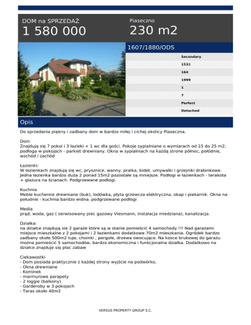 DOM na SPRZEDAŻ 1 580 000 Piaseczno 230 m2 1607/1880/ODS Secondary 1531 164 1999 1 7 Perfect Detached Opis Do sprzedania piękny i zadbany dom w bardzo miłej i cichej okolicy Piaseczna. Dom Znajdują się 7 pokoi i 3 łazieki + 1 wc dla gości. Pokoje sypialniane o wymiarach od 15 do 25 m2, podłoga w pokojach - parkiet drewniany. Okna w sypialniach na każdą strone północ, połódnie, wschód i zachód Łazienki: W łazienkach znajdują się wc, prysznice, wanny, pralka, bidet, umywalki i grzejniki drabinkowe. Jedna łazienka bardzo duża 2 ponad 15m2 pozostałe są mniejsze. Podłogi w łazienkach - terakota + glazura na ścianach. Podgrzewane podłogi. Kuchnia Meble kuchenne drewniane (buk), lodówka, płyta grzewcza elektryczna, okap i piekarnik. Okna na południe - kuchnia bardzo widna. podgrzewane podłogi Media prąd, woda, gaz ( serwisowany piec gazowy Viesmann, instalacja miedziana), kanalizacja. Działka: na działce znajdują sie 2 garaże które są w stanie pomieścić 4 samochody !!! Nad garażami miejsce mieszkalne z 2 pokojami i 2 łazienkami dodatkowe 70m2 mieszkania. Ogródek bardzo zadbany około 500m2 tuje, choinki , pergole, drzewa owocujące. Na kosce brukowej do garażu można pomieścić 5 samochodów, bardzo ekonomiczna i funkcjonalna działka. Dodatkowo na działce znajduje się plac zabaw Ciekawostki - Dom posiada praktycznie z każdej strony wyjście na podwórko, - Okna drewniane - Kominek - marmurowe parapety - 2 loggie (balkony) - Garderoby w 3 pokojach - Taras około 40m2 VERSUS PROPERTY GROUP S.C. Okolica spokojna, cicha bezpieczna ślepa uliczka. 300 metrów do stacji PKP i pętli autobusowej (bezpośrednie połączenie do Centrum Warszawy ok. 30 min pociągiem KM= SKM). W pobliżu wjazd na autostradę – kierunek Łódź, Poznań, Gdańsk oraz około 15 min samochodem do Lotniska im. F. Chopina w Warszawie. Pobliskie sklepy (Alma, Auchan, Fashion House Outlet Centre, Decathlon, Leroy Merlin, Ikea) Przychodnia, szpital, stacja benzynowa, pizzerie, bilard, salony kosmetyczne, banki itd. Szkoły- szkoła podstawowa, gimnazjum, liceum, technikum. W rozliczeniu może być dodatkowo ( w rozliczeniu dom nad morzem, mieszkanie Trójmiasto i okolice,Warszawa - śródmieście, Mokotów, ursonów, okolice Wielczki) Zapraszam do oglądania ! Nr oferty: 1607/ODS Zapraszamy do naszego biura w Piasecznie, ul. Pomorska 22. Nasi pracownicy są do Państwa dyspozycji od 10:00 do 18:00 (pon-pt), w sobotę od 10:00 do 13:00. Kontakt telefoniczny w sprawie ofert codziennie od godziny 8:00 do 22:00 tel. 664 476 532 W celu zapoznania się z naszą pełną ofertą nieruchomości zapraszamy na naszą stronę www.versusgroup.pl Niniejsze ogłoszenie nie stanowi oferty w rozumieniu przepisów Kodeksu Cywilnego oraz innych właściwych przepisów prawnych, a dane w niej zawarte mają jedynie charakter informacyjny. Jacek Gawin tel. 664 476 532 email: [email protected] VERSUS PROPERTY GROUP S.C. Powered by TCPDF (www.tcpdf.org)