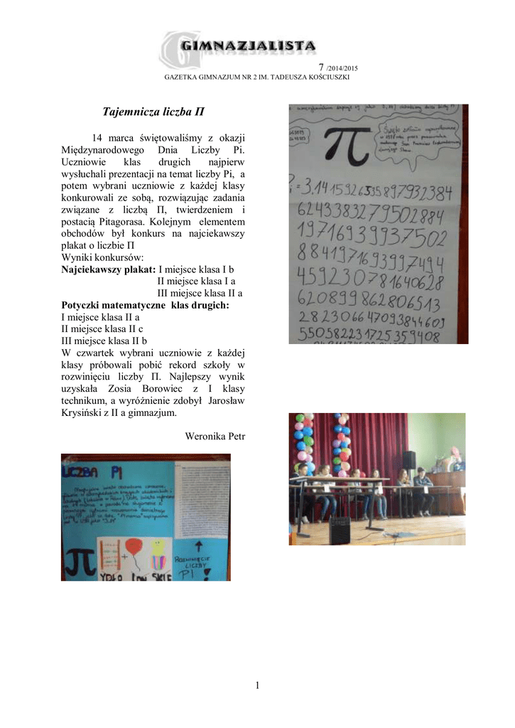 7 /2014/2015 GAZETKA GIMNAZJUM NR 2 IM. TADEUSZA KOŚCIUSZKI Tajemnicza liczba Π 14 marca świętowaliśmy z okazji Międzynarodowego Dnia Liczby Pi. Uczniowie klas drugich najpierw wysłuchali prezentacji na temat liczby Pi, a potem wybrani uczniowie z każdej klasy konkurowali ze sobą, rozwiązując zadania związane z liczbą Π, twierdzeniem i postacią Pitagorasa. Kolejnym elementem obchodów był konkurs na najciekawszy plakat o liczbie Π Wyniki konkursów: Najciekawszy plakat: I miejsce klasa I b II miejsce klasa I a III miejsce klasa II a Potyczki matematyczne klas drugich: I miejsce klasa II a II miejsce klasa II c III miejsce klasa II b W czwartek wybrani uczniowie z każdej klasy próbowali pobić rekord szkoły w rozwinięciu liczby Π. Najlepszy wynik uzyskała Zosia Borowiec z I klasy technikum, a wyróżnienie zdobył Jarosław Krysiński z II a gimnazjum. Weronika Petr 1 7 /2014/2015 GAZETKA GIMNAZJUM NR 2 IM. TADEUSZA KOŚCIUSZKI Jednak największym hitem tego sezonu są metaliczne ubrania. W tym roku styliści poszli na całość. Wcześniej błyszczały tylko dodatki, teraz świeci spódnica, garnitur, a nawet płaszcz. Można było je zobaczyć między innymi na pokazach Giorgio Armaniego, Chanel, Prady i Marca Jacobsa. Styliści doradzają łączyć je z klasyczną bielą i czernią. Małgosia Jaros Co nowego w modzie? Koronkę w tym sezonie nosimy z grubymi swetrami i dżinsami – nie tylko na wieczorne wyjścia - tak właśnie doradzają styliści. Koronki są komponowane z dużymi swetrami dla efektu luźnego ubrania na co dzień. W sezonie 2014/15 bardzo dużą sławę zdobyły jednak swetry. Ulice je pokochały. Jak wcześniej napisałam, swetry bardzo dobrze komponują się z koronką, ale także z eleganckimi spódnicami czy po prostu ze starymi startymi jeansami. Szkolny savoir – vivre W szkole savoir- vivre jest bardzo ważny. Chodzi tu głównie o zachowanie wobec drugiej osoby. Pamiętajcie, by witać serdecznie swoich kolegów i przyjaciół 2 7 /2014/2015 GAZETKA GIMNAZJUM NR 2 IM. TADEUSZA KOŚCIUSZKI uściskiem dłoni lub przytuleniem. Powiedzenie zwykłego „cześć’’ też nie zaszkodzi. Powinniście witać i żegnać się z każdym nauczycielem, mówiąc „Dzień dobry”, „Do widzenia”. Twoim Paniom lub Panom będzie naprawdę miło. Drugą sprawą z zasad savoir - vivre w szkole jest przepuszczanie w drzwiach osób starszych (nie tylko nauczycieli). Gdy zauważysz osobę, która niesie coś ciężkiego, spytaj, czy możesz pomóc. Nawet jeśli ta osoba odmówił, zapamięta twoje dobre chęci. Nie zapomnij też o kulturze na lekcji. Przede wszystkim słuchamy, nie przeszkadzamy i nie żujemy gumy. W ten sposób okazujesz danej osobie szacunek, który ona odwzajemni ci na pewno (w niedalekiej przyszłości). Ostatnią zasadą szkolnego savoir-vivre’u jest zachowanie podczas przerw. Nie obrażaj koleżanek, zachowuj się spokojnie, stosownie podczas wszelakich akademii szkolnych i zwykłych lekcji. I pamiętaj: twoje zachowanie jest twoją wizytówką !!! Jowita Kasprzyk II a Międzynarodowy Dzień Języka Ojczystego Jak podaje Instytut Książki „na datę obchodów Dnia Języka Ojczystego wybrany został 21 lutego, upamiętniający wydarzenia 1952 roku, kiedy to w miejscowości Dhaka (obecnej stolicy Bangladeszu) doszło do demonstracji, a następnie zamordowania pięciu studentów, domagających się uznania ich języka ojczystego – bengalskiego (bangla) – za jeden z dwóch urzędowych języków ówczesnego państwa Pakistanu”. W naszej szkole dla uczczenia tego dnia odbył się happeninig: Gimnazjalisto, język ojczysty nade wszystko! Uczniowie za pomocą wpadających w ucho haseł zachęcali do szacunku dla języka polskiego. 3 7 /2014/2015 GAZETKA GIMNAZJUM NR 2 IM. TADEUSZA KOŚCIUSZKI Plakaty prezentowały ładną i brzydką polszczyznę. 4 7 /2014/2015 GAZETKA GIMNAZJUM NR 2 IM. TADEUSZA KOŚCIUSZKI Drzwi Otwarte w naszej szkole Ten dzień był bardzo dobrze przygotowany i dopracowany. O 9.00 szóstoklasiści ze Szkoły Podstawowej nr 4 w Chełmnie przyszli zobaczyć, jak wiele dzieje się w naszej szkole. Impreza zaczęła się od bardzo ciepłego przywitania przez panią dyrektor Mirosławę Murawską. Następnie Weronika Petr i Martyna Cieślewicz przedstawiły nasze osiągnięcia w nauce i sporcie oraz ciekawostki z codziennych zajęć. Nie obeszło się bez występów recytatorskich w obcym języku oraz popisów wokalnych. Pokaz chemiczny przygotowany pod patronatem p. Karpińskiej zrobił wielkie wrażenie na widzach. Uczniowie naszego gimnazjum przedstawili prezentację o zajęciach mechatronicznych. Następnie przyszedł czas na spektakl pt. Adam i Ewa przygotowany pod opieką p. Kęprowską przez członków koła teatralnego Kropka G. Goście mieli możliwość obejrzenia gazetek i kronik szkolnych oraz zwiedzenia naszej szkoły. Następnie przyszli gimnazjaliści mieli przyjemność uczestniczyć w zabawach sprawnościowych przygotowanych przez wuefistów w sali gimnastycznej. Potem uśmiechnięci tańczyli zumbę wspólnie z naszymi gimnazjalistkami. Po wszystkich atrakcjach uczniowie zostali poczęstowani cukierkami i zadowoleni wrócili do swojej szkoły. Jowita Kasprzyk II a 5 7 /2014/2015 GAZETKA GIMNAZJUM NR 2 IM. TADEUSZA KOŚCIUSZKI 6 7 /2014/2015 GAZETKA GIMNAZJUM NR 2 IM. TADEUSZA KOŚCIUSZKI Dnia Teatru dla uczniów szkół podstawowych. W programie znalazła się prezentacja piosenki aktorskiej i spektakl teatralny Adam i Ewa. Młodzi teatromani mieli też okazję wziąć udział w tworzeniu scenek dramowych, rozpoznawaniu znanych postaci oraz quizie teatralnym. Oprócz słodkich nagród zadowolone dzieciaki otrzymały żywą lekcję teatru. Międzynarodowy Dzień Teatru Dzień Teatru ustanowiono w czerwcu 1961 roku podczas 9. Światowego Kongresu Międzynarodowego Instytutu Teatralnego w Helsinkach. Jego ustanowienie zaproponował Arvi Kivimaa, prezydent Fińskiego Instytutu ITI. Dzień obchod