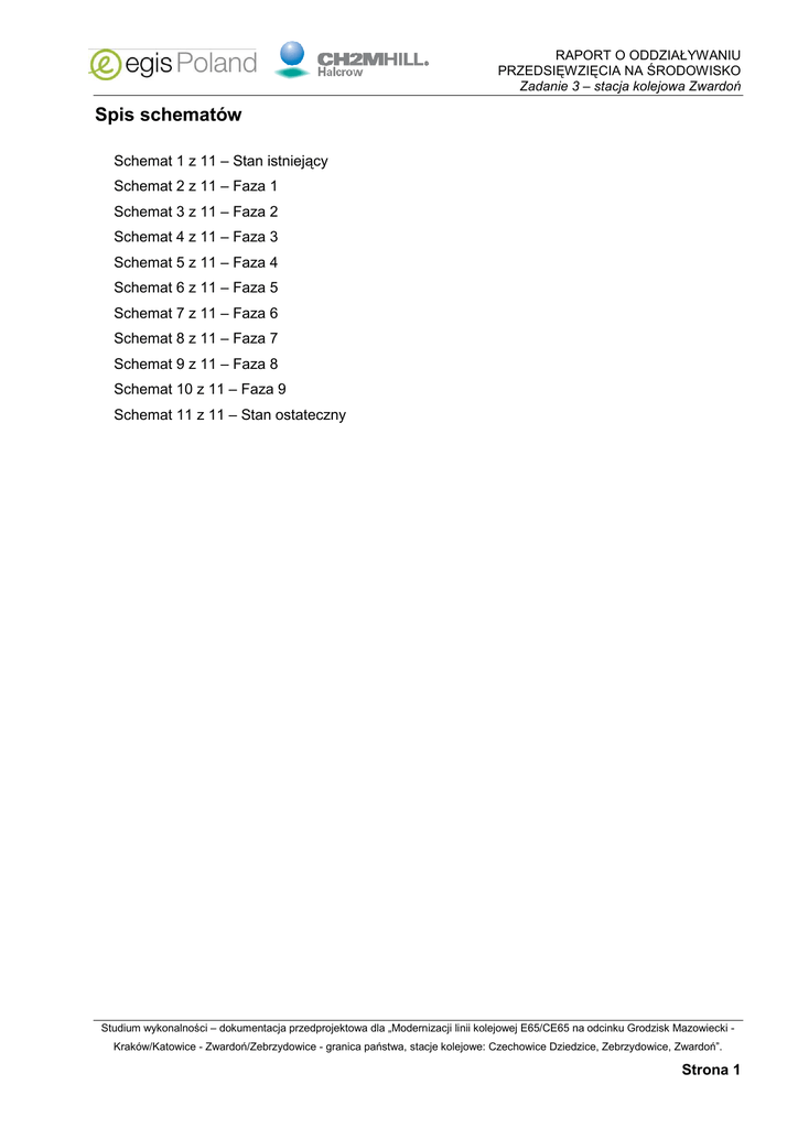 RAPORT O ODDZIAŁYWANIU PRZEDSIĘWZI ĘWZIĘCIA NA ŚRODOWISKO Zadanie 3 – stacja kolejowa Zwardoń Spis schematów Schemat 1 z 11 – Stan istniejący istniej Schemat 2 z 11 – Faza 1 Schemat 3 z 11 – Faza 2 Schemat 4 z 11 – Faza 3 Schemat 5 z 11 – Faza 4 Schemat 6 z 11 – Faza 5 Schemat 7 z 11 – Faza 6 Schemat 8 z 11 – Faza 7 Schemat 9 z 11 – Faza 8 Schemat 10 z 11 – Faza 9 Schemat 11 z 11 – Stan ostateczny Studium wykonalności – dokumentacja przedprojektowa dla „Modernizacji linii kolejowej E65/CE65 65/CE65 na odcinku Grodzisk Mazowiecki Kraków/Katowice - Zwardoń/Zebrzydowice /Zebrzydowice - granica państwa, stwa, stacje kolejowe: Czechowice Dziedzice, Zebrzydowice, Zwardo Zwardoń”. Strona 1 RAPORT O ODDZIAŁYWANIU PRZEDSIĘWZIĘCIA PRZEDSI NA ŚRODOWISKO Zadanie 3 – stacja kolejowa Zwardoń Studium wykonalności – dokumentacja przedprojektowa dla „Modernizacji linii kolejowej E65/CE65 na odcinku Grodzisk Mazowiecki - Kraków/Katowice - Zwardoń/Zebrzydowice - granica pań państwa, stacje kolejowe: Czechowice Dziedzice, Zebrzydowice, Zwardoń”. Strona 2 RAPORT O ODDZIAŁYWANIU PRZEDSIĘWZIĘCIA PRZEDSI NA ŚRODOWISKO Zadanie 3 – stacja kolejowa Zwardoń Studium wykonalności – dokumentacja przedprojektowa dla „Modernizacji linii kolejowej E65/CE65 na odcinku Grodzisk Mazowiecki - Kraków/Katowice - Zwardoń/Zebrzydowice - granica pań państwa, stacje kolejowe: Czechowice Dziedzice, Zebrzydowice, Zwardoń”. Strona 3 RAPORT O ODDZIAŁYWANIU PRZEDSIĘWZIĘCIA PRZEDSI NA ŚRODOWISKO Zadanie 3 – stacja kolejowa Zwardoń Studium wykonalności – dokumentacja przedprojektowa dla „Modernizacji linii kolejowej E65/CE65 na odcinku Grodzisk Mazowiecki - Kraków/Katowice - Zwardoń/Zebrzydowice - granica pań państwa, stacje kolejowe: Czechowice Dziedzice, Zebrzydowice, Zwardoń”. Strona 4 RAPORT O ODDZIAŁYWANIU PRZEDSIĘWZIĘCIA PRZEDSI NA ŚRODOWISKO Zadanie 3 – stacja kolejowa Zwardoń Studium wykonalności – dokumentacja przedprojektowa dla „Modernizacji linii kolejowej E65/CE65 na odcinku Grodzisk Mazowiecki - Kraków/Katowice - Zwardoń/Zebrzydowice - granica pań państwa, stacje kolejowe: Czechowice Dziedzice, Zebrzydowice, Zwardoń”. Strona 5 RAPORT O ODDZIAŁYWANIU PRZEDSIĘWZIĘCIA PRZEDSI NA ŚRODOWISKO Zadanie 3 – stacja kolejowa Zwardoń Studium wykonalności – dokumentacja przedprojektowa dla „Modernizacji linii kolejowej E65/CE65 na odcinku Grodzisk Mazowiecki - Kraków/Katowice - Zwardoń/Zebrzydowice - granica pań państwa, stacje kolejowe: Czechowice Dziedzice, Zebrzydowice, Zwardoń”. Strona 6 RAPORT O ODDZIAŁYWANIU PRZEDSIĘWZIĘCIA PRZEDSI NA ŚRODOWISKO Zadanie 3 – stacja kolejowa Zwardoń Studium wykonalności – dokumentacja przedprojektowa dla „Modernizacji linii kolejowej E65/CE65 na odcinku Grodzisk Mazowiecki - Kraków/Katowice - Zwardoń/Zebrzydowice - granica pań państwa, stacje kolejowe: Czechowice Dziedzice, Zebrzydowice, Zwardoń”. Strona 7 RAPORT O ODDZIAŁYWANIU PRZEDSIĘWZIĘCIA PRZEDSI NA ŚRODOWISKO Zadanie 3 – stacja kolejowa Zwardoń Studium wykonalności – dokumentacja przedprojektowa dla „Modernizacji linii kolejowej E65/CE65 na odcinku Grodzisk Mazowiecki - Kraków/Katowice - Zwardoń/Zebrzydowice - granica pań państwa, stacje kolejowe: Czechowice Dziedzice, Zebrzydowice, Zwardoń”. Strona 8 RAPORT O ODDZIAŁYWANIU PRZEDSIĘWZIĘCIA PRZEDSI NA ŚRODOWISKO Zadanie 3 – stacja kolejowa Zwardoń Studium wykonalności – dokumentacja przedprojektowa dla „Modernizacji linii kolejowej E65/CE65 na odcinku Grodzisk Mazowiecki - Kraków/Katowice - Zwardoń/Zebrzydowice - granica pań państwa, stacje kolejowe: Czechowice Dziedzice, Zebrzydowice, Zwardoń”. Strona 9 RAPORT O ODDZIAŁYWANIU PRZEDSIĘWZIĘCIA PRZEDSI NA ŚRODOWISKO Zadanie 3 – stacja kolejowa Zwardoń Studium wykonalności – dokumentacja przedprojektowa dla „Modernizacji linii kolejowej E65/CE65 na odcinku Grodzisk Mazowiecki - Kraków/Katowice - Zwardoń/Zebrzydowice - granica pań państwa, stacje kolejowe: Czechowice Dziedzice, Zebrzydowice, Zwardoń”. Strona 10 RAPORT O ODDZIAŁYWANIU PRZEDSIĘWZIĘCIA PRZEDSI NA ŚRODOWISKO Zadanie 3 – stacja kolejowa Zwardoń Studium wykonalności – dokumentacja przedprojektowa dla „Modernizacji linii kolejowej E65/CE65 na odcinku Grodzisk Mazowiecki - Kraków/Katowice - Zwardoń/Zebrzydowice - granica pań państwa, stacje kolejowe: Czechowice Dziedzice, Zebrzydowice, Zwardoń”. Strona 11 RAPORT O ODDZIAŁYWANIU PRZEDSIĘWZIĘCIA PRZEDSI NA ŚRODOWISKO Zadanie 3 – stacja kolejowa Zwardoń Studium wykonalności – dokumentacja przedprojektowa dla „Modernizacji linii kolejowej E65/CE65 na odcinku Grodzisk Mazowiecki - Kraków/Katowice - Zwardoń/Zebrzydowice - granica pań państwa, stacje kolejowe: Czechowice Dziedzice, Zebrzydowice, Zwardoń”. Strona 12