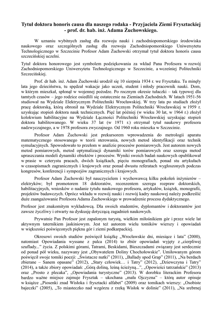 Tytuł doktora honoris causa dla naszego rodaka - Przyjaciela Ziemi Frysztackiej - prof. dr. hab. inż. Adama Żuchowskiego. W uznaniu wybitnych zasług dla rozwoju nauki i zachodniopomorskiego środowiska naukowego oraz szczególnych zasług dla rozwoju Zachodniopomorskiego Uniwersytetu Technologicznego w Szczecinie Profesor Adam Żuchowski otrzymał tytuł doktora honoris causa szczecińskiej uczelni. Tytuł doktora honorowego jest symbolem podziękowania za wkład Pana Profesora w rozwój Zachodniopomorskiego Uniwersytetu Technologicznego w Szczecinie, a wcześniej Politechniki Szczecińskiej. Prof. dr hab. inż. Adam Żuchowski urodził się 10 sierpnia 1934 r. we Frysztaku. Tu minęły lata jego dzieciństwa, tu spędzał wakacje jako uczeń, student i młody pracownik nauki. Dom, w którym mieszkał, spłonął w wojennej pożodze. Po rocznym okresie tułaczki – tak typowej dla tamtych czasów – jego rodzice osiedlili się ostatecznie na Ziemiach Zachodnich. W latach 1951-56 studiował na Wydziale Elektrycznym Politechniki Wrocławskiej. W trzy lata po studiach złożył pracę doktorską, którą obronił na Wydziale Elektrycznym Politechniki Wrocławskiej w 1959 r. uzyskując stopień doktora nauk technicznych. Pięć lat później (w wieku 30 lat, w 1964 r.) złożył kolokwium habilitacyjne na Wydziale Łączności Politechniki Wrocławskiej uzyskując stopień doktora habilitowanego. W wieku 37 lat (w 1971 r.) otrzymał tytuł naukowy profesora nadzwyczajnego, a w 1978 profesora zwyczajnego. Od 1960 roku mieszka w Szczecinie. Profesor Adam Żuchowski jest prekursorem wprowadzenia do metrologii aparatu matematycznego stosowanego w teorii sterowania, nowych metod identyfikacji oraz technik symulacyjnych. Spowodowało to przełom w analizie procesów pomiarowych. Jest autorem nowych metod pomiarowych, metod optymalizacji dynamiki torów pomiarowych oraz szeregu metod upraszczania modeli dynamiki obiektów i procesów. Wyniki swoich badań naukowych opublikował w prasie w czterystu pracach, dwóch książkach, pięciu monografiach, ponad stu artykułach w czasopismach zagranicznych i krajowych oraz ponad dwustu referatach wygłoszonych podczas kongresów, konferencji i sympozjów zagranicznych i krajowych. Profesor Adam Żuchowski był nauczycielem i wychowawcą kilku pokoleń inżynierów – elektryków; był promotorem 18 doktoratów, recenzentem szeregu rozpraw doktorskich, habilitacyjnych, wniosków o nadanie tytułu naukowego profesora, artykułów, książek, monografii, projektów badawczych. Oprócz wkładu w rozwój nauki i rozwój kadry naukowej należy podkreślić duże zaangażowanie Profesora Adama Żuchowskiego w prowadzenie procesu dydaktycznego. Profesor jest znakomitym wykładowcą. Dla swoich studentów, dyplomantów i doktorantów jest zawsze życzliwy i otwarty na dyskusję dotyczącą zagadnień naukowych. Prywatnie Pan Profesor jest zapalonym turystą, wielkim miłośnikiem gór i przez wiele lat aktywnym taternikiem jaskiniowym. Jest też autorem wielu tomików wierszy i opowiadań w większości poświęconych pięknu gór i ziemi podkarpackiej. Okresowi swoich studiów poświęcił książkę „Wrocławskie dni, miesiące i lata” (2000), natomiast Opowiadania wyssane z palca (2014) to zbiór opowiadań wyjęty z „cierpliwej szuflady...” życia. Z polskimi górami, Tatrami, Beskidami, Bieszczadami związany jest serdecznie od ponad pół wieku, nazywany jest „Obywatelem Doliny Chochołowskie”. Umiłowanym górom poświęcił swoje tomiki poezji: „Świstacze nutki” (2011), „Ballady spod Grap” (2011), „Na berdach zbierane – Sanem opasane” (2012), „Stary człowiek… i Tatry” (2012), „Dziewczyna i Tatry” (2014), a także zbiory opowiadań: „Górą doliną, leśną ścieżyną...”, „Opowieści tatrzańskie” (2013) oraz „Prosto z plecaka”, „Opowiadania turystyczne” (2013). W dorobku literackim Profesora bardzo ważne miejsce zajmuje Frysztak – ukochana „mała Ojczyzna” – którą autor opisuje w książce „Piosenki znad Wisłoka i frysztacki alfabet” (2009) oraz tomikach wierszy: „Osobiste bajeczki” (2005), „To miasteczko nad wzgórzu z rzeką Wisłok w dolinie” (2011), „Na srebrnej pajęczej strunie” (2013), „Za wierszem... wiersz” (2014), w antologii „Bo tu wyrosłem Frysztackie spotkania z poezją” (2009). Profesor Adam Żuchowski wielokrotnie spotykał się z czytelnikami, mieszkańcami Ziemi Frysztackiej w kobylskim dworku i w Gminnej Bibliotece Publicznej we Frysztaku podczas promocji swoich książek. W 2007 r. otrzymał statuetkę Przyjaciela Ziemi Frysztackiej. Z wielką radością przyjęliśmy wiadomość o nadaniu Panu Profesorowi tytułu doktora honoris causa Zachodniopomorskiego Uniwersytetu Technologicznego w Szczecinie. Jesteśmy pewni, że to w pełni zasłużony tytuł za rzetelną pracę, nowatorstwo, osiągnięcia, publikacje, życzliwość i człowieczeństwo!